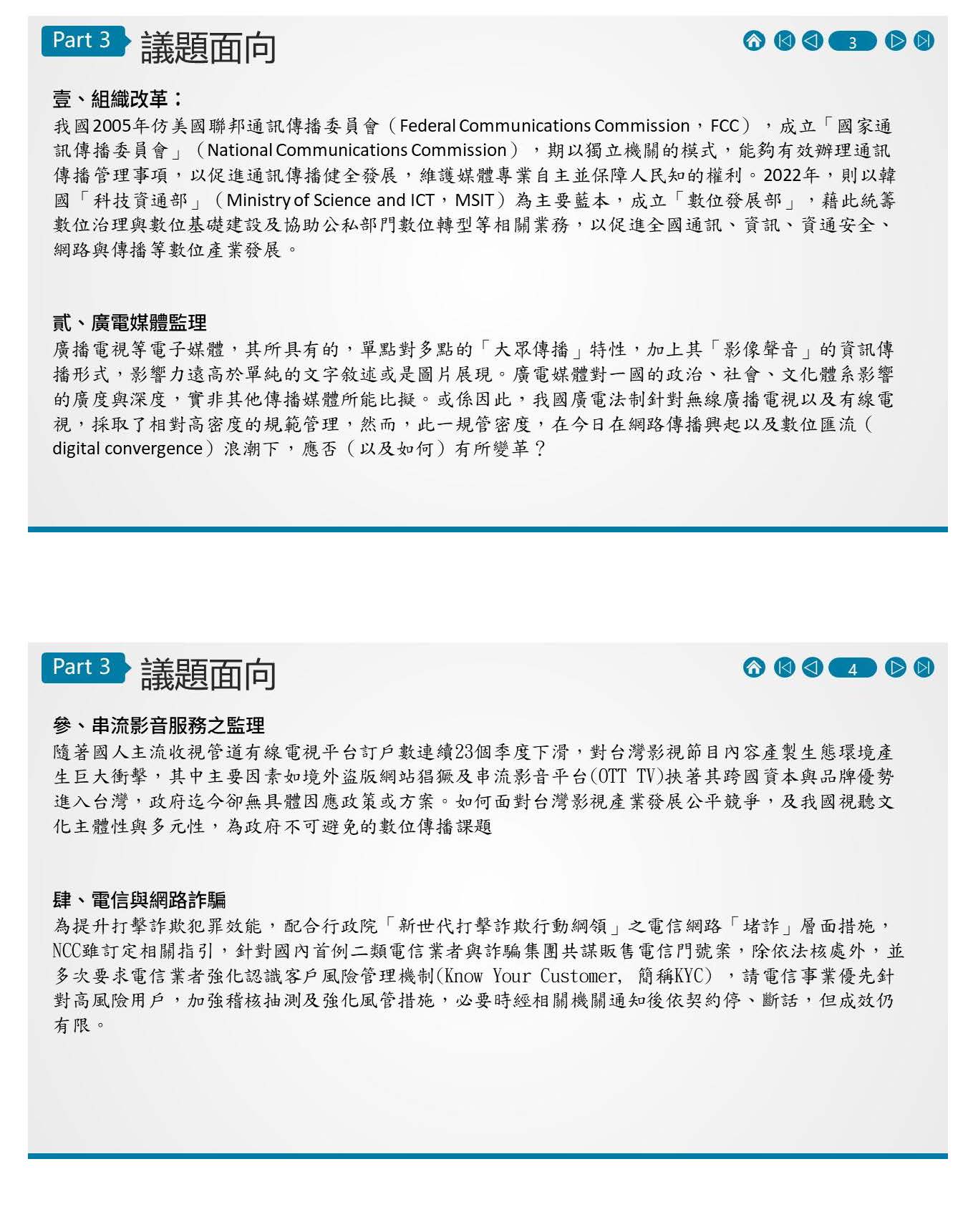 第三個,雖然電信業務已經相對減少了,但是現在最讓業者叫苦連天的就是電信打詐,號稱KYC,之前國際電信的通訊網路引起……其實打詐是一條鞭,真正的內容源頭是數位平臺,而不是傳輸源,那麼要怎麼處理這個問題,這是NCC必須面對的。