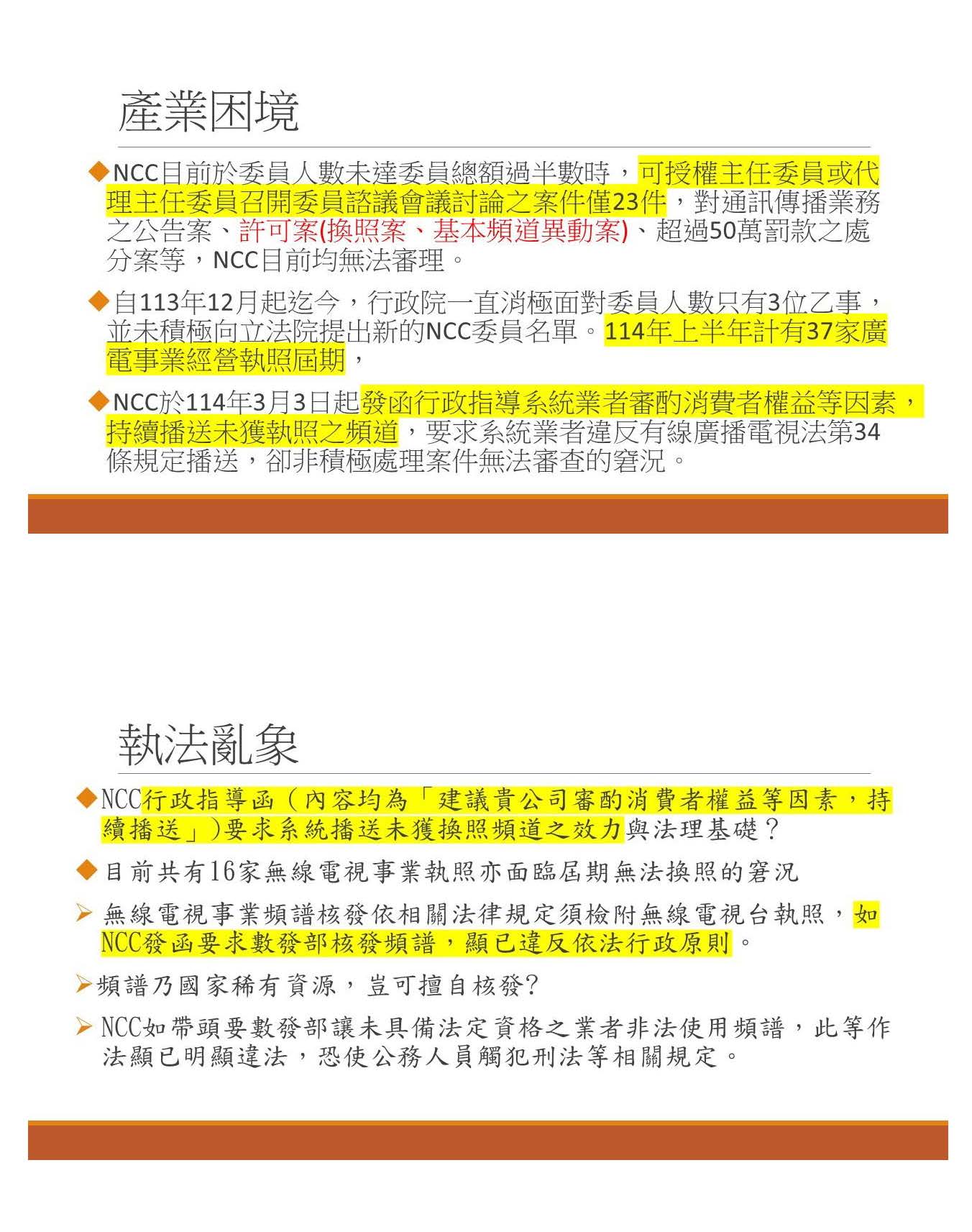 大家知不知道今年上半年一共有37家廣電事業執照到期?若執照到期,按照規定,你沒有拿執照就不能營運哦!頻道事業沒有拿執照,系統業者是不能播頻道的內容哦!結果我們NCC竟然發一個行政指導,要求系統業者,請他們審酌消費者權益,然後持續播送未獲執照的頻道,這種就是一個執法的亂象,也就是說,用行政指導突破法律的限制,它的效力跟法理基礎在哪裡?尤其是目前有16家無線廣電事業也是面臨沒有辦法換照,不要忘了這個無線電視、無線廣播、無線電視事業的執照本身是要有頻譜的,所以未來NCC沒有發給執照,然後是不是要求數發部發給一個頻譜?這個就完全沒辦法跟法律結合在一起,顯然已經違反了依法行政原則,因為頻譜畢竟是國家稀有資源,怎麼可以隨便用行政機關的行政解釋就擅自核發?這個也會讓數發部跟NCC的事務官本身產生一些違法的問題。