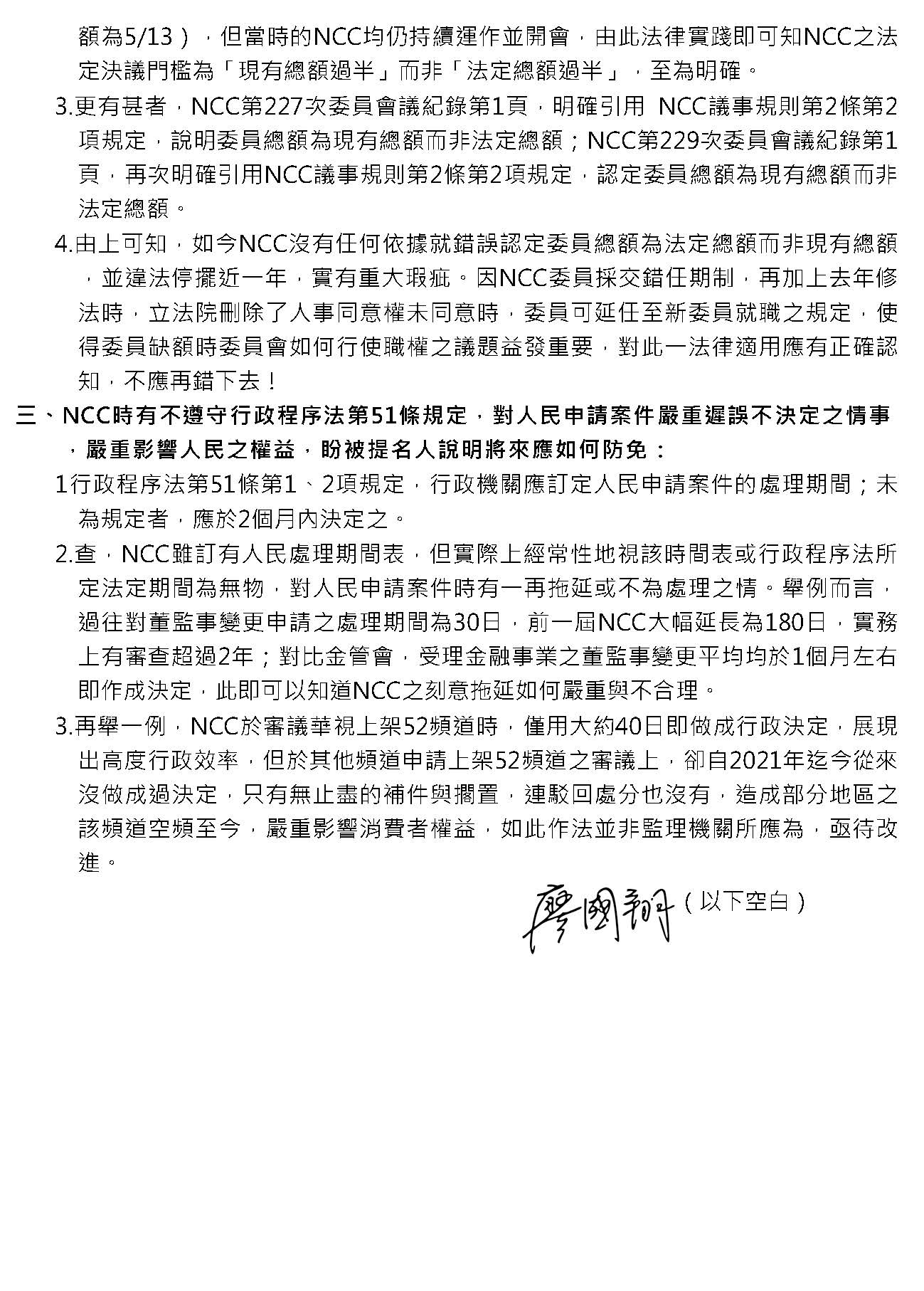 最後一點,我要提的是,我們看實務上過往的經驗,NCC不時都有不遵行行政程序法第五十一條的規定,對於人民申請的案件、對於業者申請的案件嚴重遲誤不作成決定,嚴重影響到人民的權利,這個部分也希望被提名人說明將來應該如何防免。因為行政程序法第五十一條第一項、第二項就已經規定,行政機關對於人民申請的案件,應該制定申請處理期限,如果沒有規定的話,應該於兩個月內作成決定,NCC雖然有制定人民處理期間表,但實務運行上卻經常性地視該時間表以及行政程序法的規定如無物,對於人民申請的案件一再拖延或者是不為處理,這是非常司空見慣的事情。舉例來說,董監事變更是一個很常見的審議事項,過往對於董監事變更的申請處理期間應該是30天,但是前一屆NCC把30天大幅延長到180天,但實務上面審查甚至有超過兩年的情形,對比金管會,金管會受理金融事業之董監事變更平均一個月就可以作成決定,但是NCC卻可以拖到半年,甚至兩年,由此可知NCC對於人民申請案件是如何刻意地拖延,而且嚴重不合理的現象。再舉一個例子,NCC在審議華視上架52頻道的時候,僅用40天就作成行政決定,展現了非常高度的行政效率,但是對於其他頻道申請上架同一個頻位的審議決定,從2021年到現在已經經過了4年,沒有作成任何決定,只有無止盡的補件和擱置,連駁回處分都沒有,造成部分地區52台還是空頻到現在,這已經嚴重影響消費者的權益了。