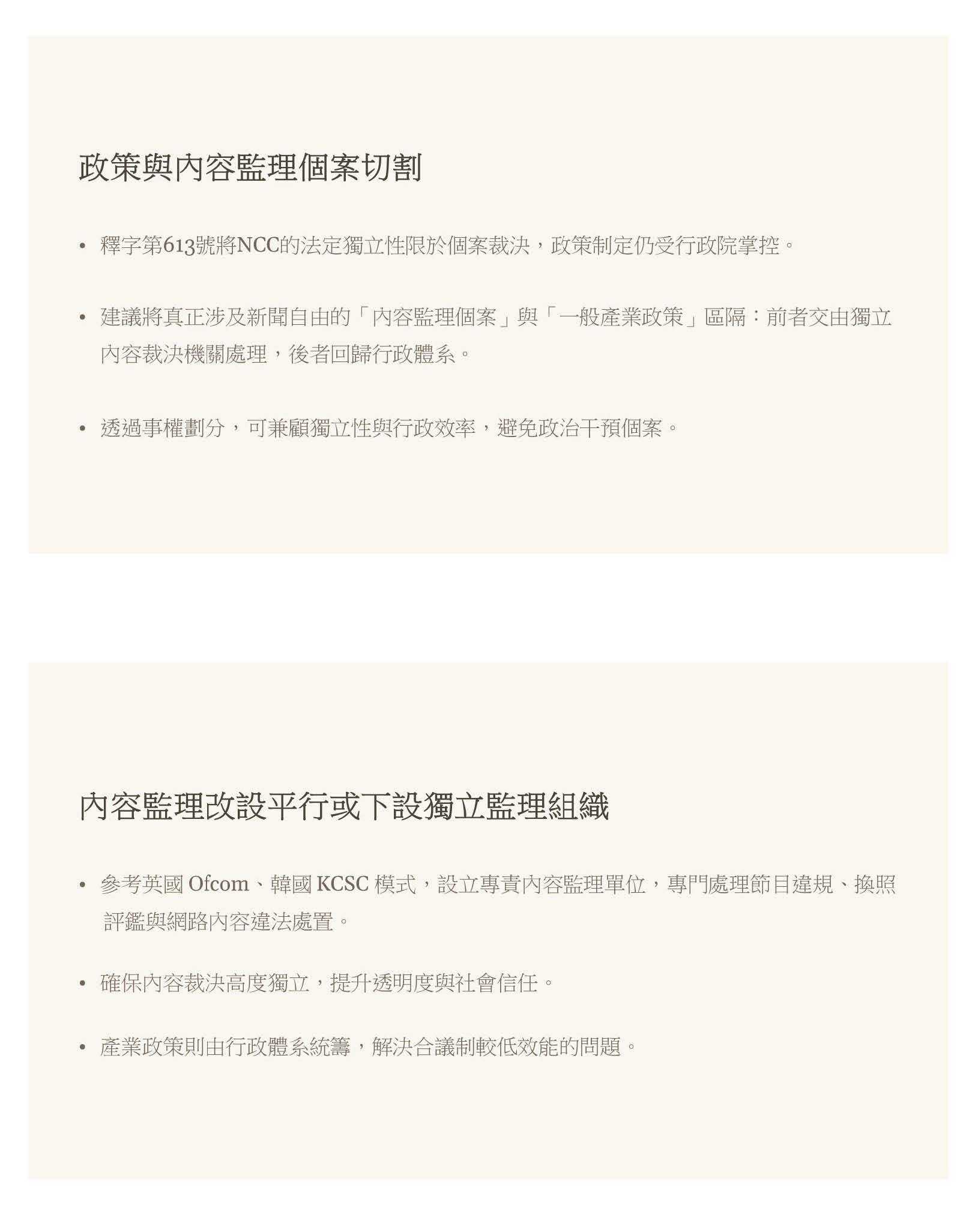 以下建議一些改革或問題的解決方向。我們建議把真正涉及新聞自由的內容監理個案跟一般產業政策應該區隔,前者也許可以交由真正獨立的內容裁決機關處理,關於政策的部分就回歸行政體系處理。可以參考英國的Ofcom或是韓國KCSC模式,就是設立專責的內容監理單位,專門處理節目違規、換照評鑑以及網路內容的違法處置。產業政策則由行政體系統籌,這樣也可以解決合議制效能較低的問題。