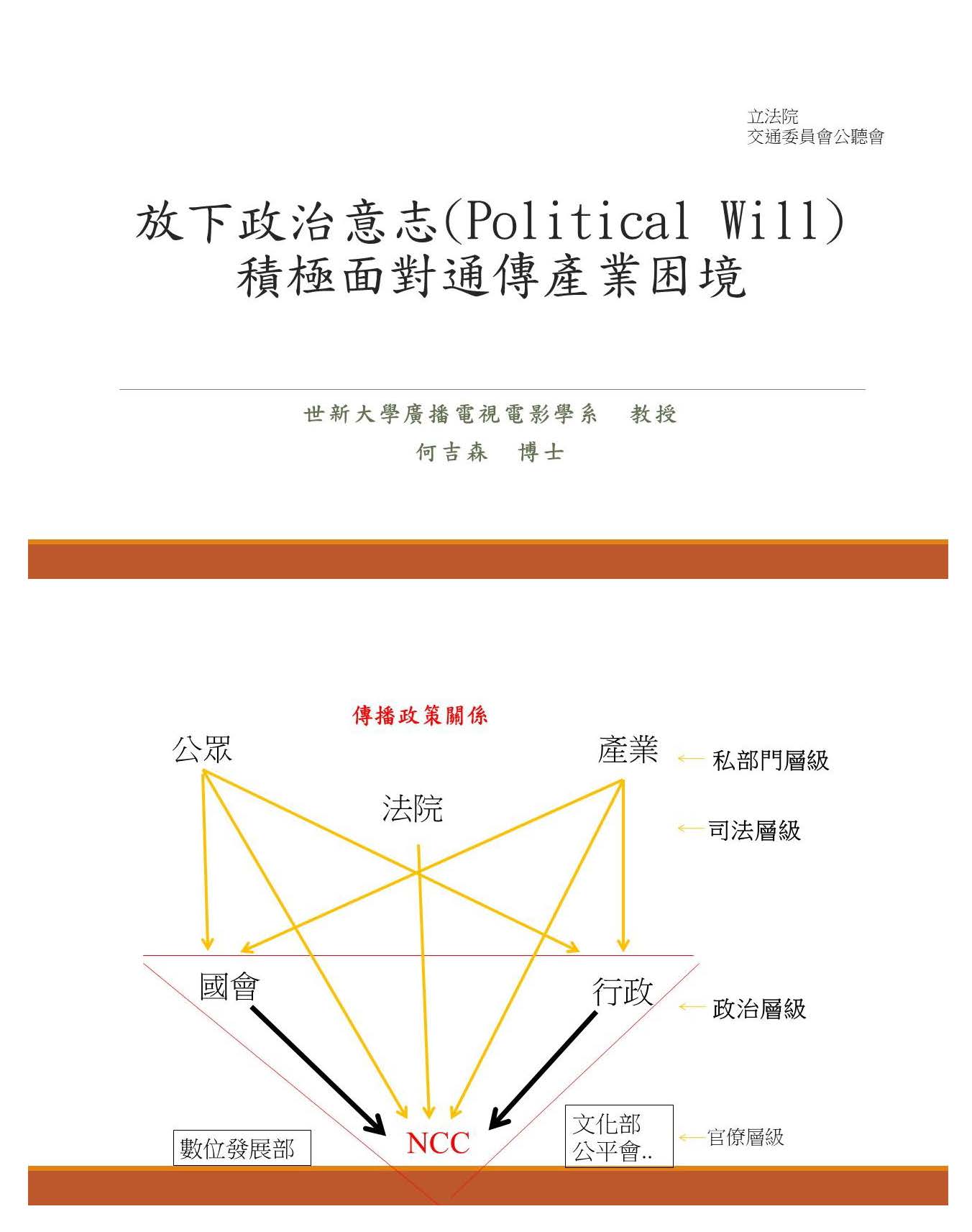 何副教授吉森:主席、劉委員、洪委員,還有各位學者專家,大家早。我今天以「放下政治意志,積極面對通傳產業困境」為我等一下要說的主題,來跟大家分享我對NCC委員提名的看法。大家可以知道,在一個傳播政策、公共政策的關係,我們可以分為政治層級、司法層級跟私部門層級,尤其是政治層級的部分,行政跟國會之間,對於NCC無論在人事還有委員提名、相關的法案、預算,都有絕對的影響力,但是不要忘了,NCC站在一個獨立管制機關,它在私部門層級的部分,尤其是產業的發展,因為NCC就是一個管制機關,所以大家一直在等NCC的一個意見、一個確定法律方向,對整個產業應該往哪邊走有絕對的影響關係,當然間接影響到的就是我們的消費者,在現在所謂的數位匯流、網路發展,這個當然就影響非常大。所以在這邊,尤其是政治層級,我是用倒三角形來看,會影響到整個NCC的穩定發展,而行政院還有國會的運作,兩邊要怎麼樣的合作,這個影響會非常大。