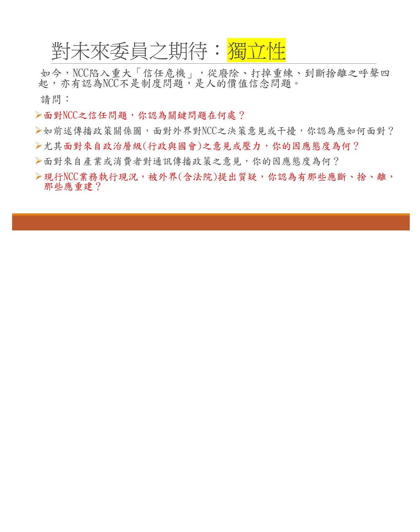 至於獨立性的部分,NCC已經陷入重大的信任危機了,剛剛幾位學者專家都說,有人說從廢除NCC、打掉重練,甚至於到斷捨離,但是也有人認為NCC不是制度的問題,而是人的價值信念問題,所以面對NCC的信任問題,想要聽聽委員的看法是怎樣;還有,對於現行NCC執行狀況被外界提出質疑,我們想要聽聽未來委員的看法,你認為有哪些應該斷掉?哪些應該捨去?還有哪些應該重建?這個是我的幾點建議,謝謝。