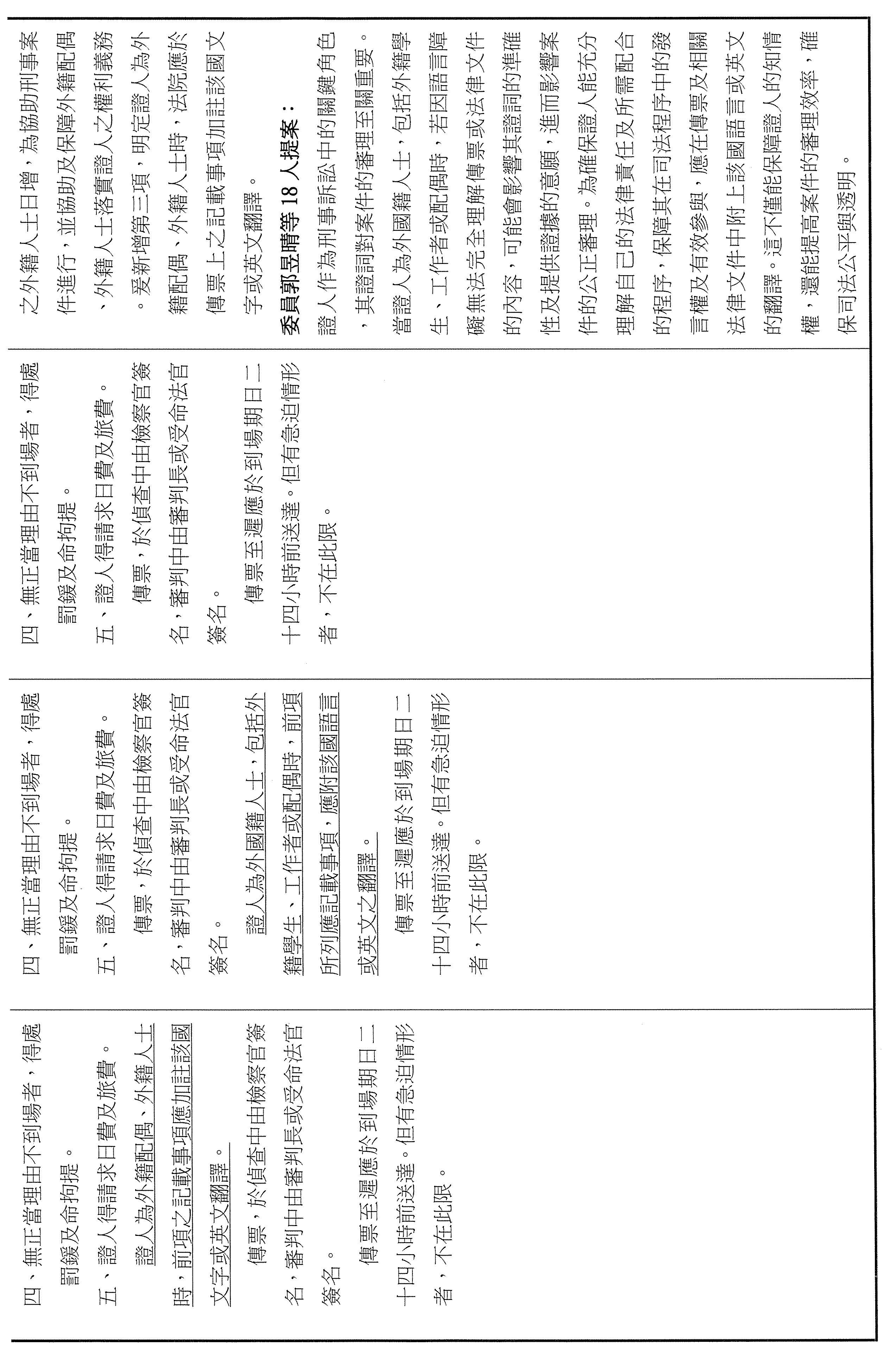 黃次長謀信:法務部基本上是贊成司法院的立場,原則上就是司法實務上、檢察實務上,事實上現在也有相關的英文版傳票,是不是有必要用法律就這種庶務性的規範,規定在我們刑事訴訟的根本大法裡面,可以再討論。另外,在實務上也可能產生剛剛委員或司法院所講的意見,在檢察官傳訊的時候可能根本不知悉這個人是一個外籍人士,如果我們把它規定成應用該國語言或英文的話,在不知悉的狀態之下,他的傳喚效力未來就可能會被爭執,所以在實務上會產生困境,如果沒有一個彈性的規範的話,在實務上會對傳喚的效力產生一些影響。