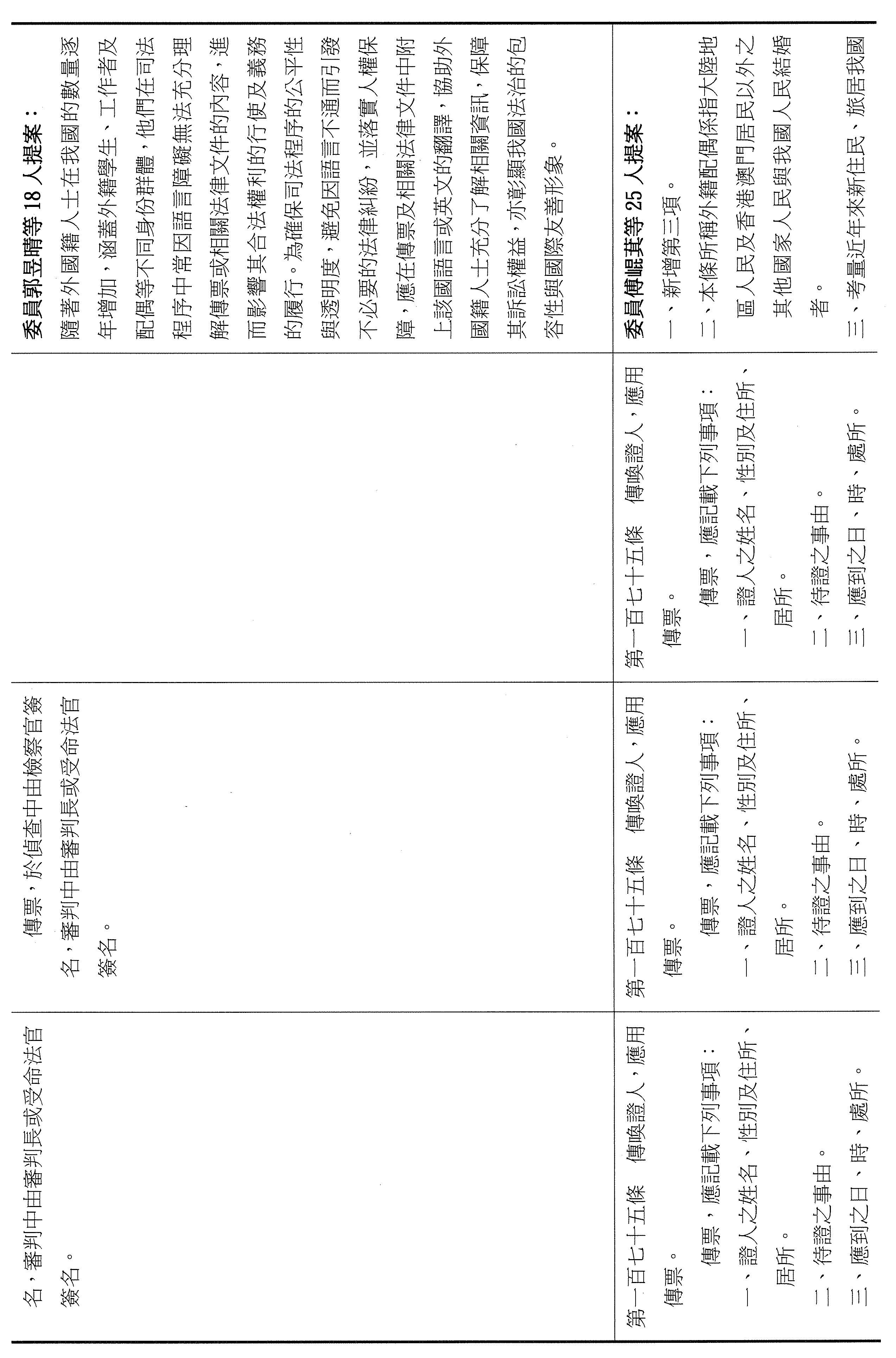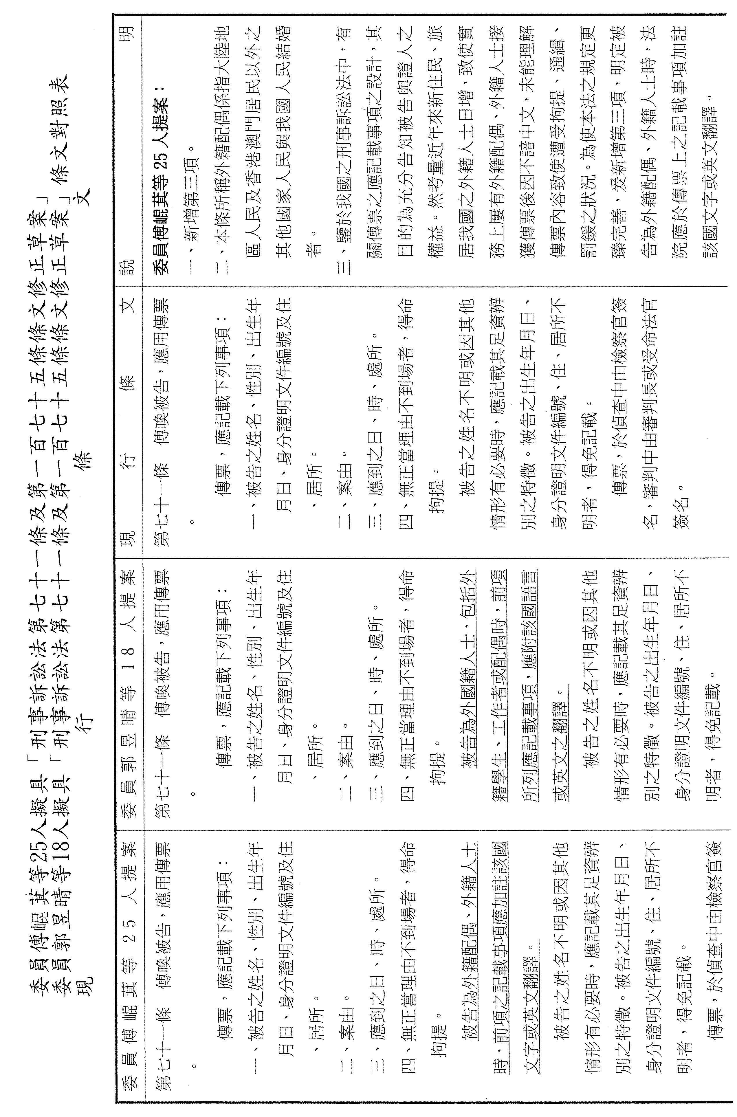 第二個事情是如果是用「外籍人士」的話,對傅崐萁委員等人的提案我建議是不是就刪除「外籍配偶」?因為外籍配偶基本上就在外籍人士的射程範圍當中,沒有必要另外再把它並列,要不然可能在解釋上面治絲益棼。所以我建議是不是就按照傅崐萁委員等25人提案,文字是:「被告為外籍人士時,前項記載應加註該國文字或英文翻譯」,第一百七十五條的部分也使用相同的法律用語,以上。