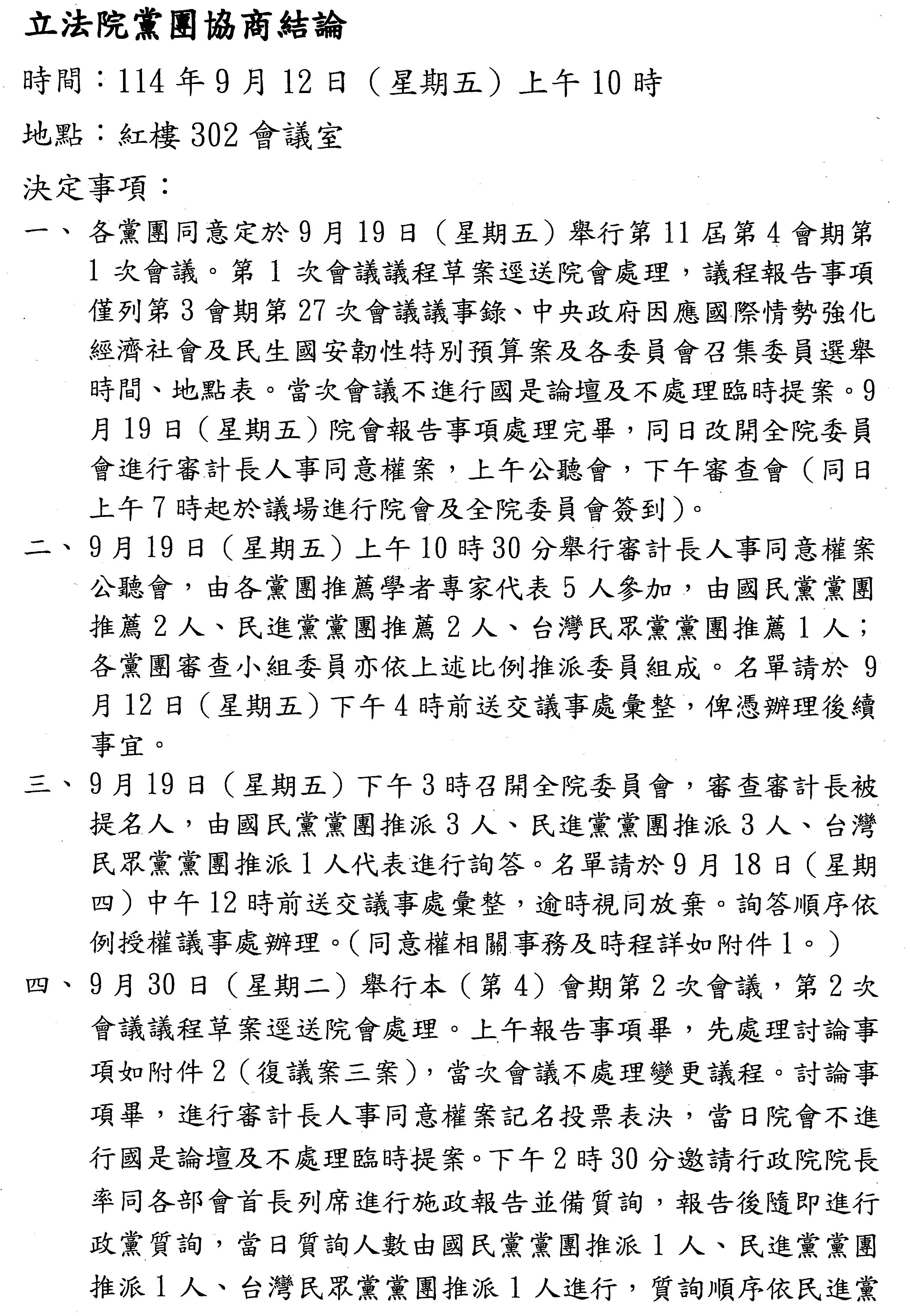 一、各黨團同意定於9月19日(星期五)舉行第11屆第4會期第1次會議。第1次會議議程草案逕送院會處理,議程報告事項僅列第3會期第27次會議議事錄、中央政府因應國際情勢強化經濟社會及民生國安韌性特別預算案及各委員會召集委員選舉時間、地點表。當次會議不進行國是論壇及不處理臨時提案。9月19日(星期五)院會報告事項處理完畢,同日改開全院委員會進行審計長人事同意權案,上午公聽會,下午審查會(同日上午7時起於議場進行院會及全院委員會簽到)。