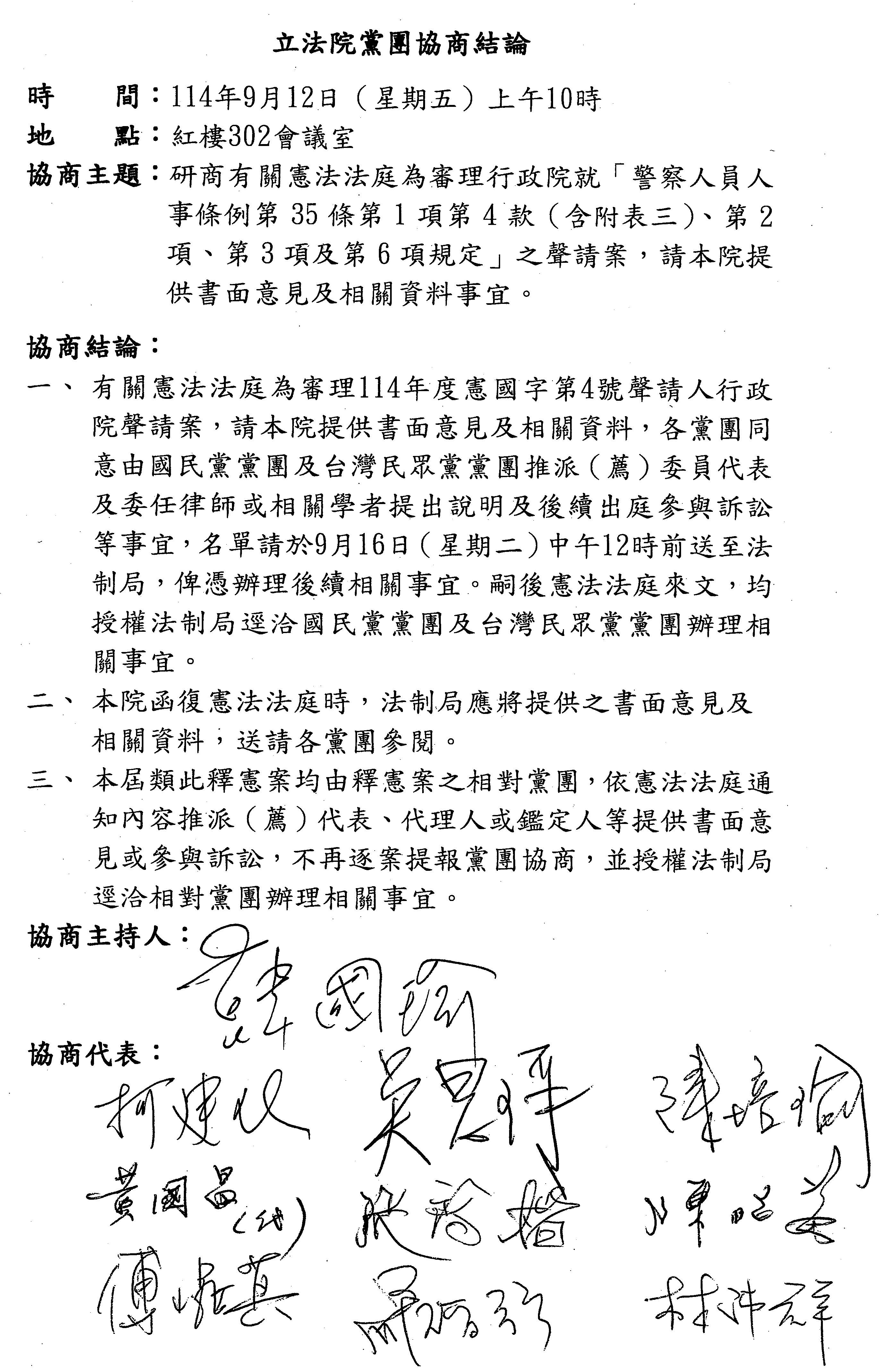 主席:好,現在包括開議日等兩個案子已經確定了,請大家簽字。再來,關於憲法法庭推派代表的黨團也已經達成共識,請簽字。第三,9月23號進行行政院長施政報告,這是由民進黨黨團提出來,請問國民黨黨團及台灣民眾黨黨團有沒有寶貴意見?