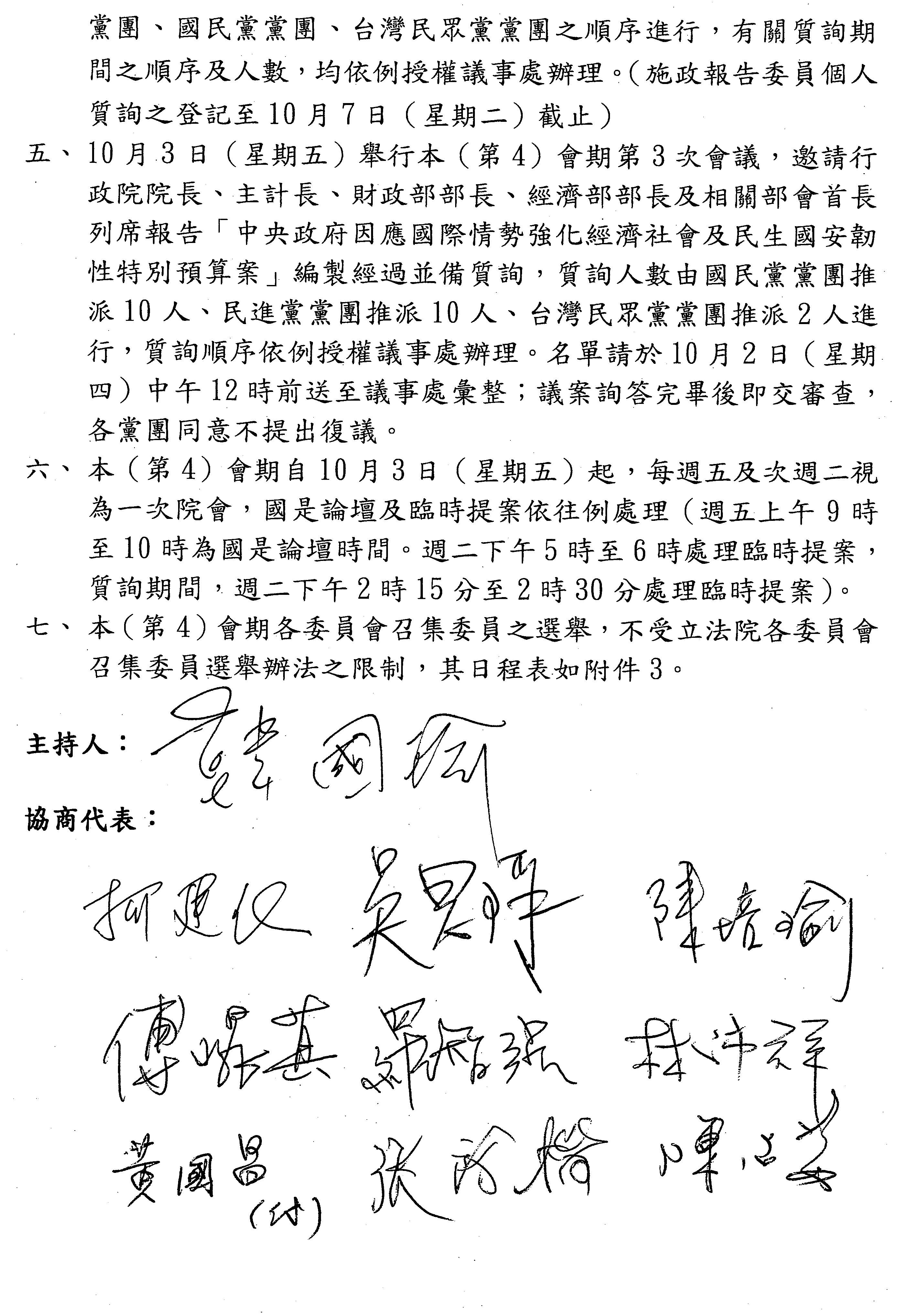 五、10月3日(星期五)舉行本(第4)會期第3次會議,邀請行政院院長、主計長、財政部部長、經濟部部長及相關部會首長列席報告「中央政府因應國際情勢強化經濟社會及民生國安韌性特別預算案」編製經過並備質詢,質詢人數由國民黨黨團推派10人、民進黨黨團推派10人、台灣民眾黨黨團推派2人進行,質詢順序依例授權議事處辦理。名單請於10月2日(星期四)中午12時前送至議事處彙整;議案詢答完畢後即交審查,各黨團同意不提出復議。