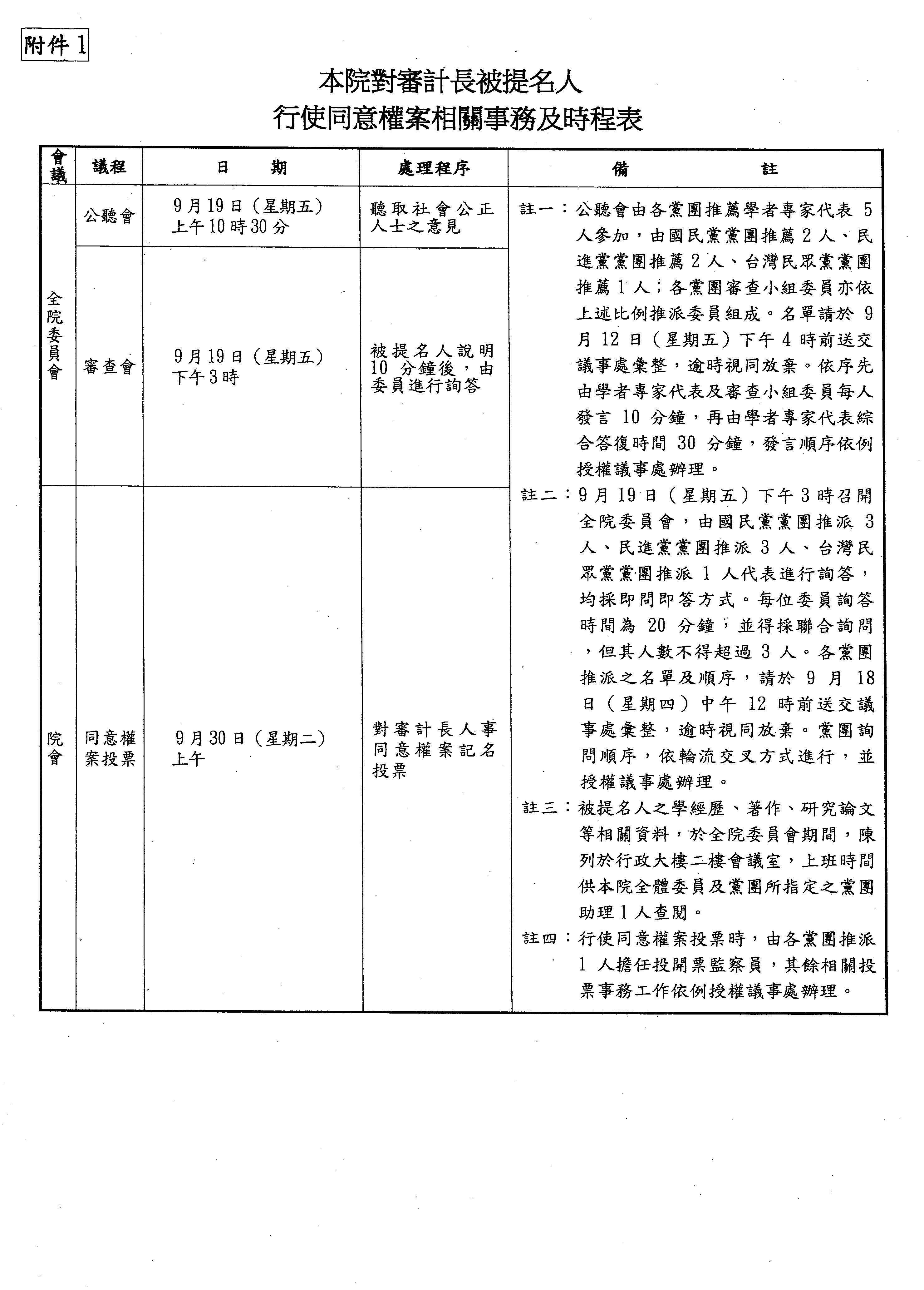 三、9月19日(星期五)下午3時召開全院委員會,審查審計長被提名人,由國民黨黨團推派3人、民進黨黨團推派3人、台灣民眾黨黨團推派1人代表進行詢答。名單請於9月18日(星期四)中午12時前送交議事處彙整,逾時視同放棄。詢答順序依例授權議事處辦理。(同意權相關事務及時程詳如附件1。)