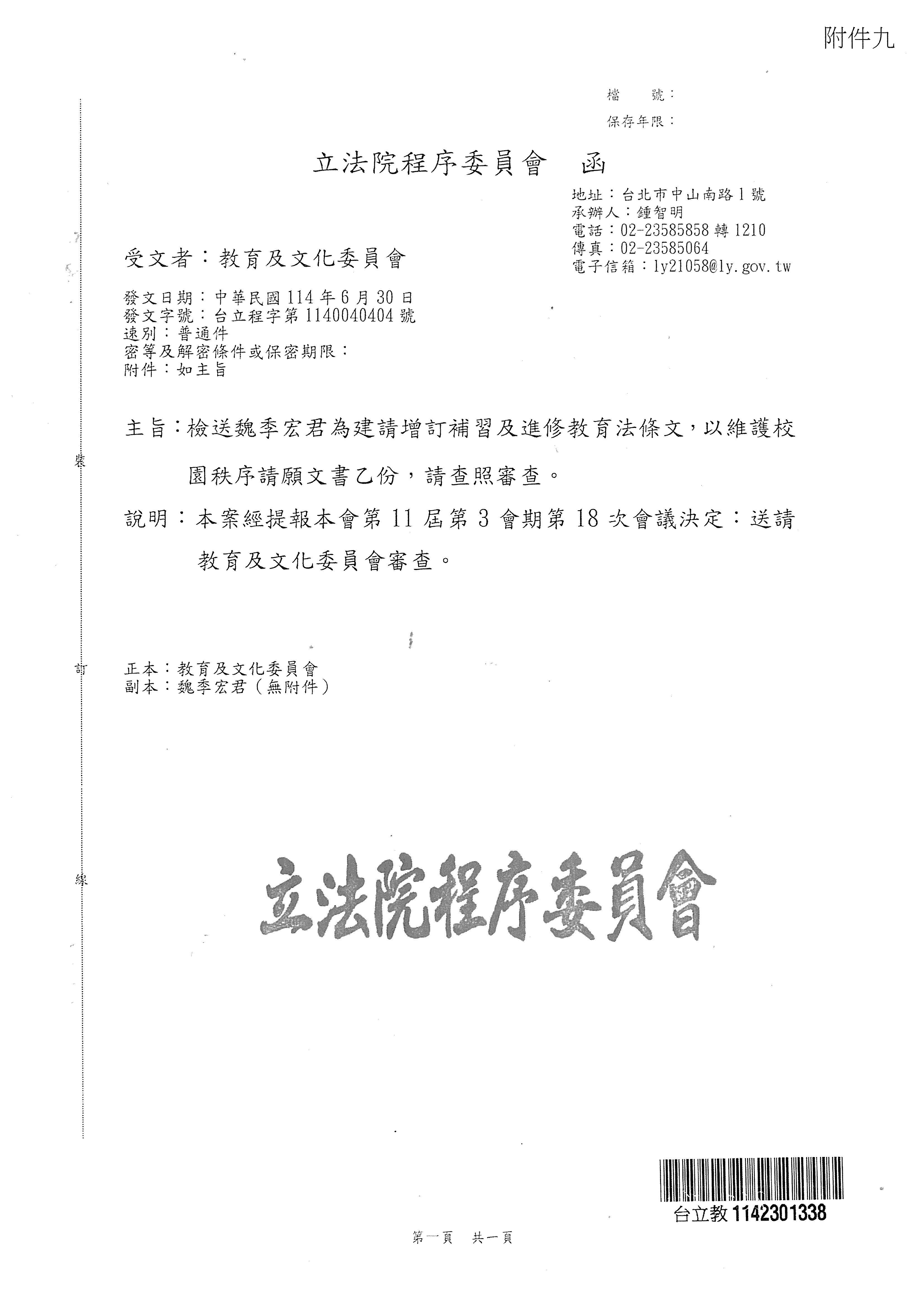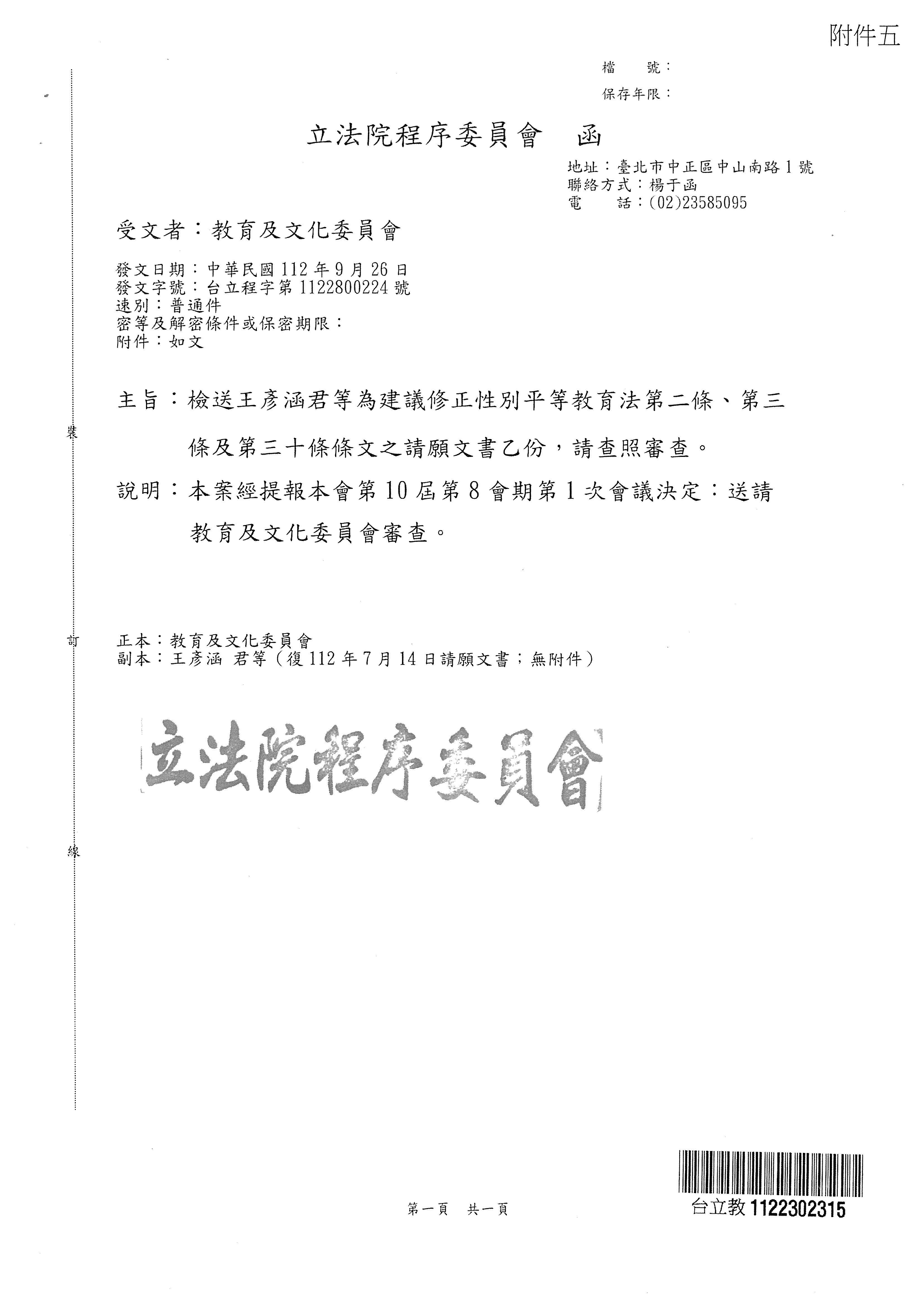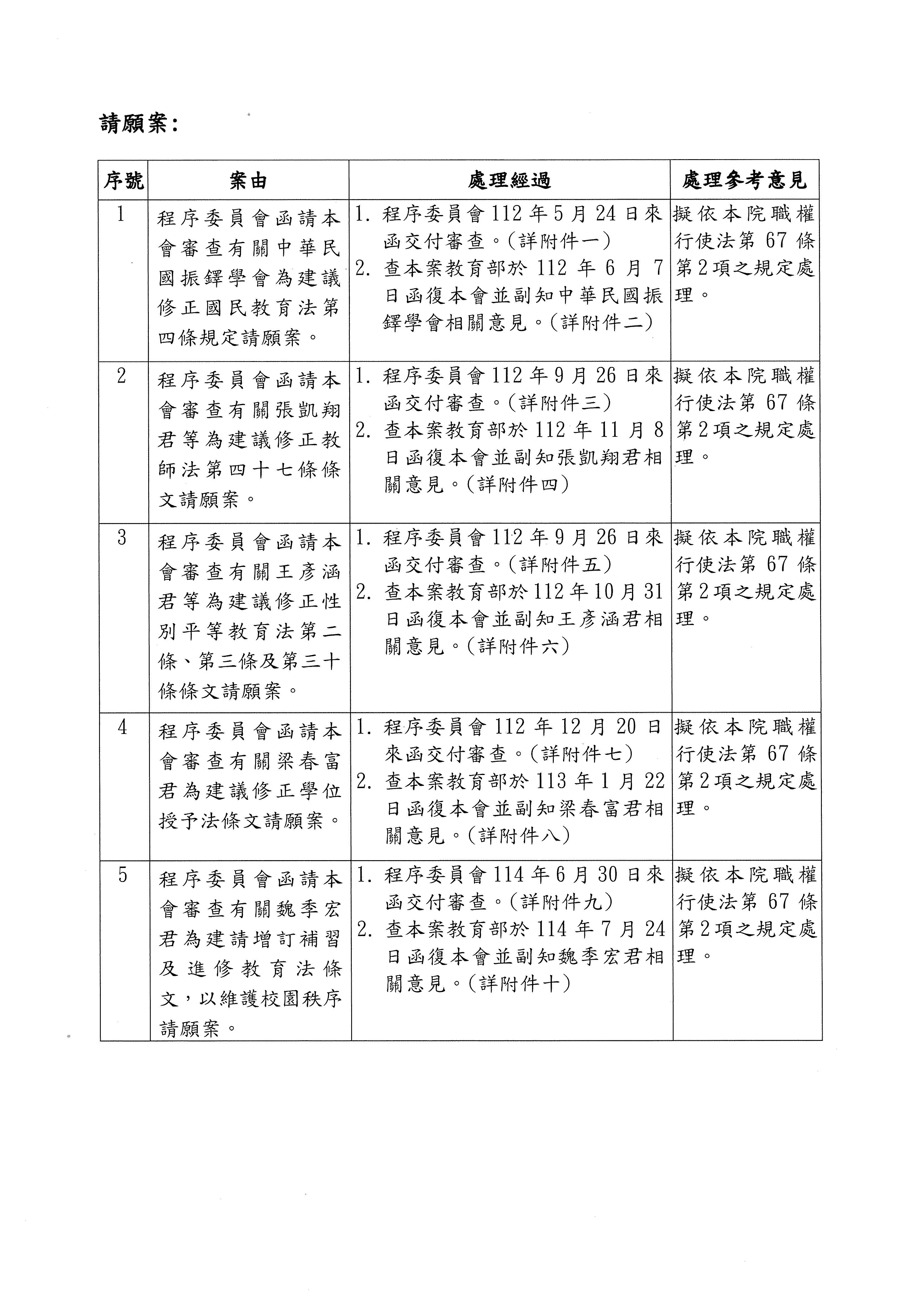 今天議程為:一、審查有關中華民國振鐸學會為建議修正國民教育法第四條規定請願案;二、審查有關張凱翔君等為建議修正教師法第四十七條條文請願案;三、審查有關王彥涵君等為建議修正性別平等教育法第二條、第三條及第三十條條文請願案;四、審查有關梁春富君為建議修正學位授予法條文請願案;五、審查有關魏季宏君為建請增訂補習及進修教育法條文,以維護校園秩序請願案。
