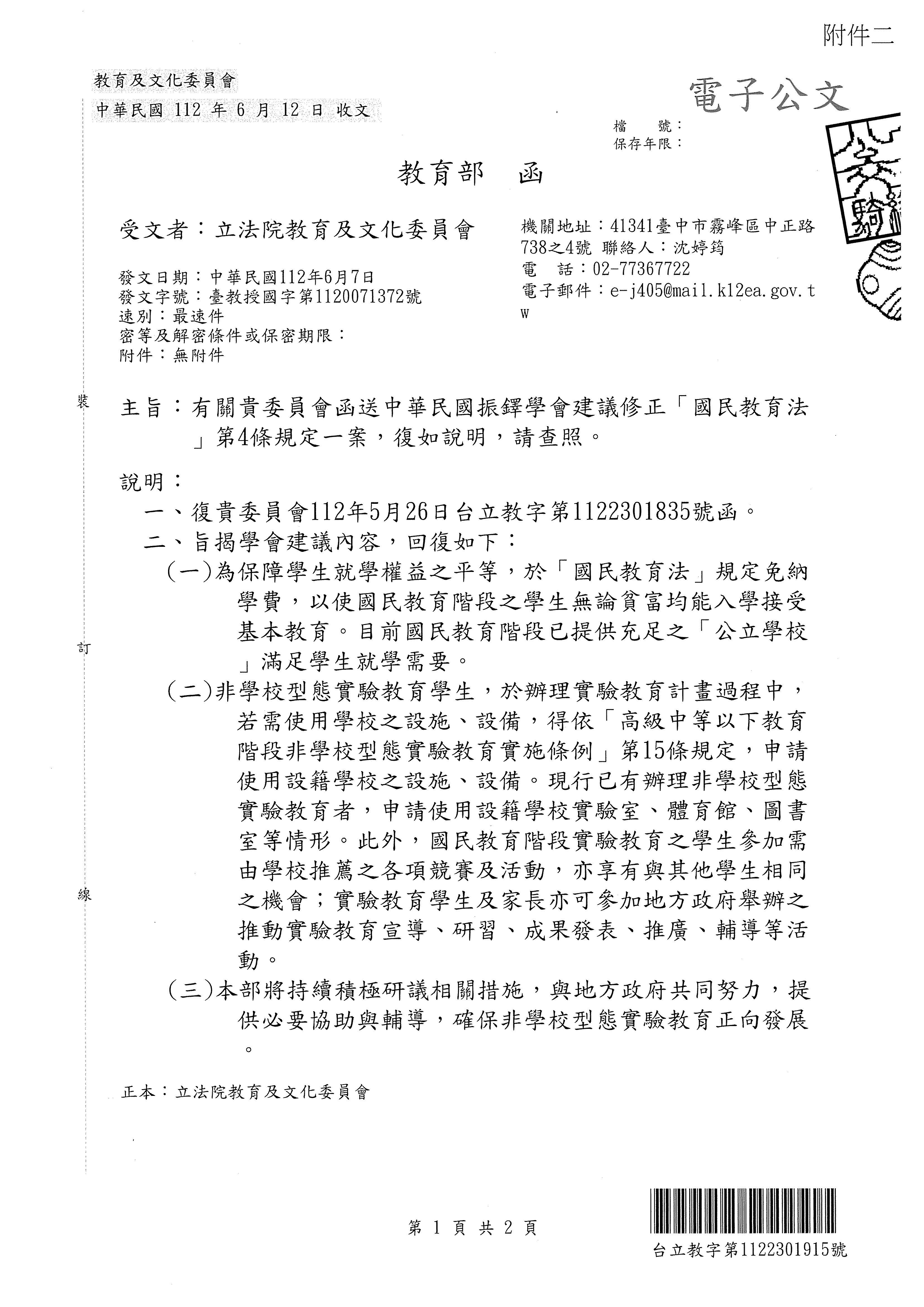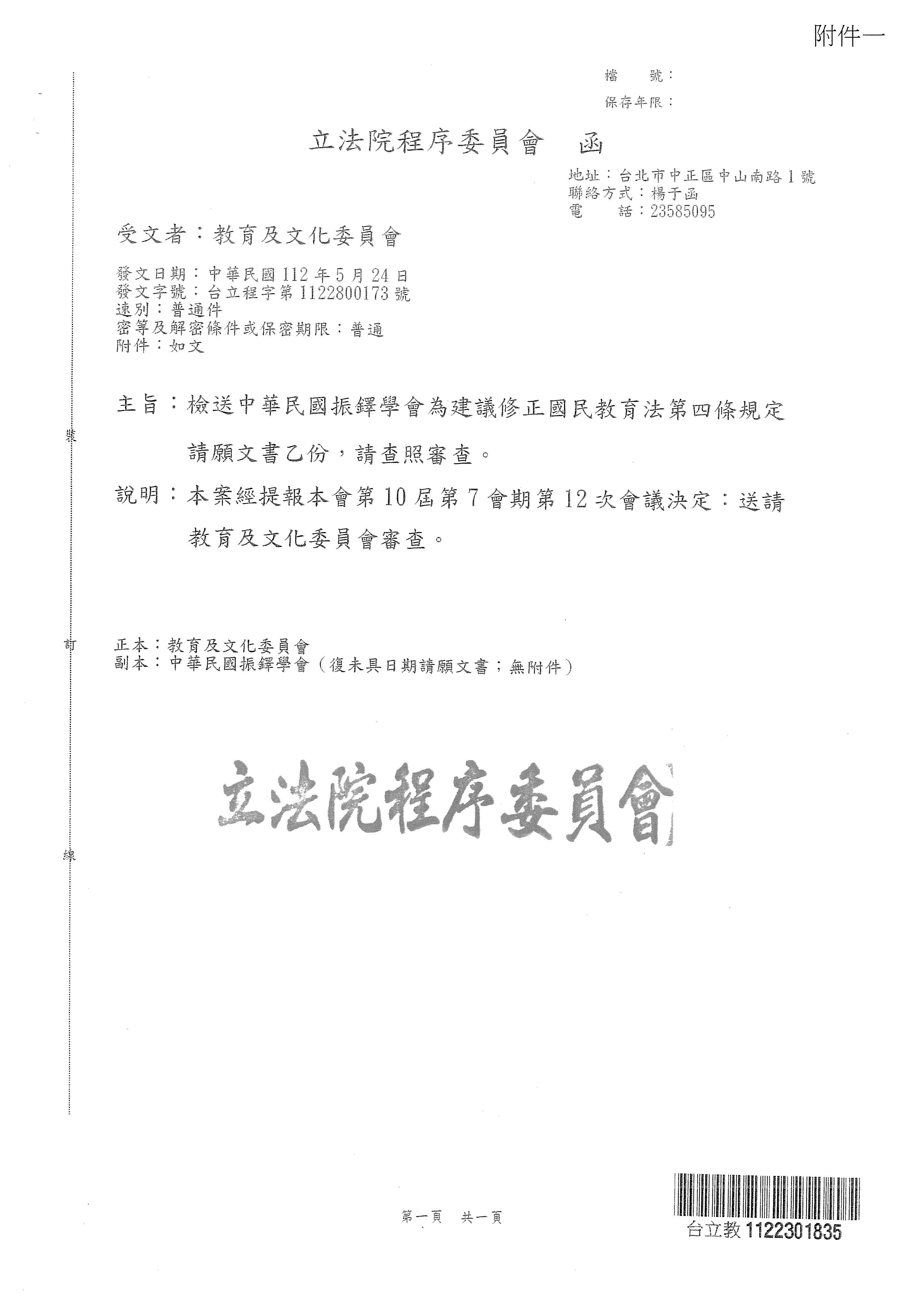 一、審查有關中華民國振鐸學會為建議修正國民教育法第四條規定請願案。