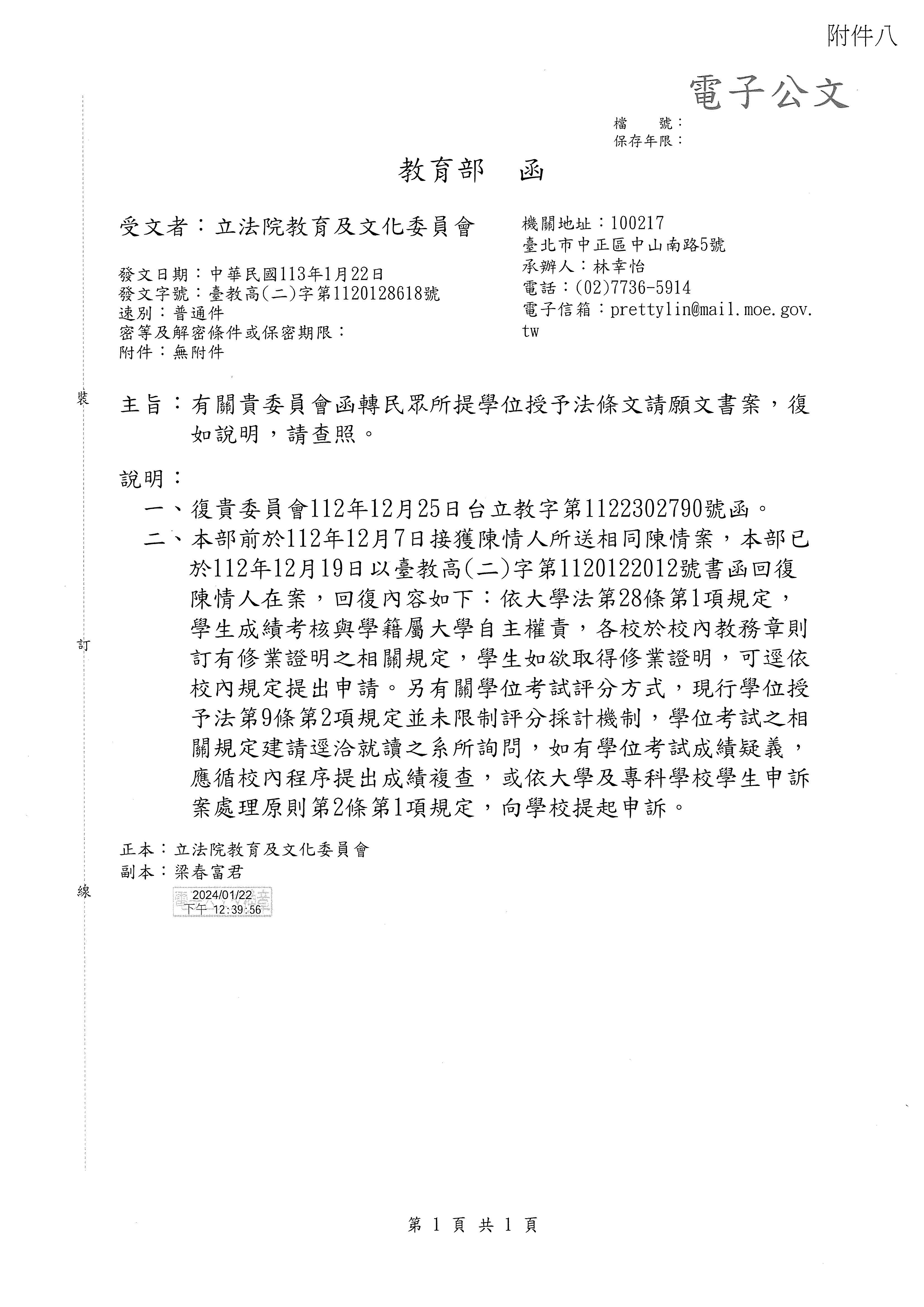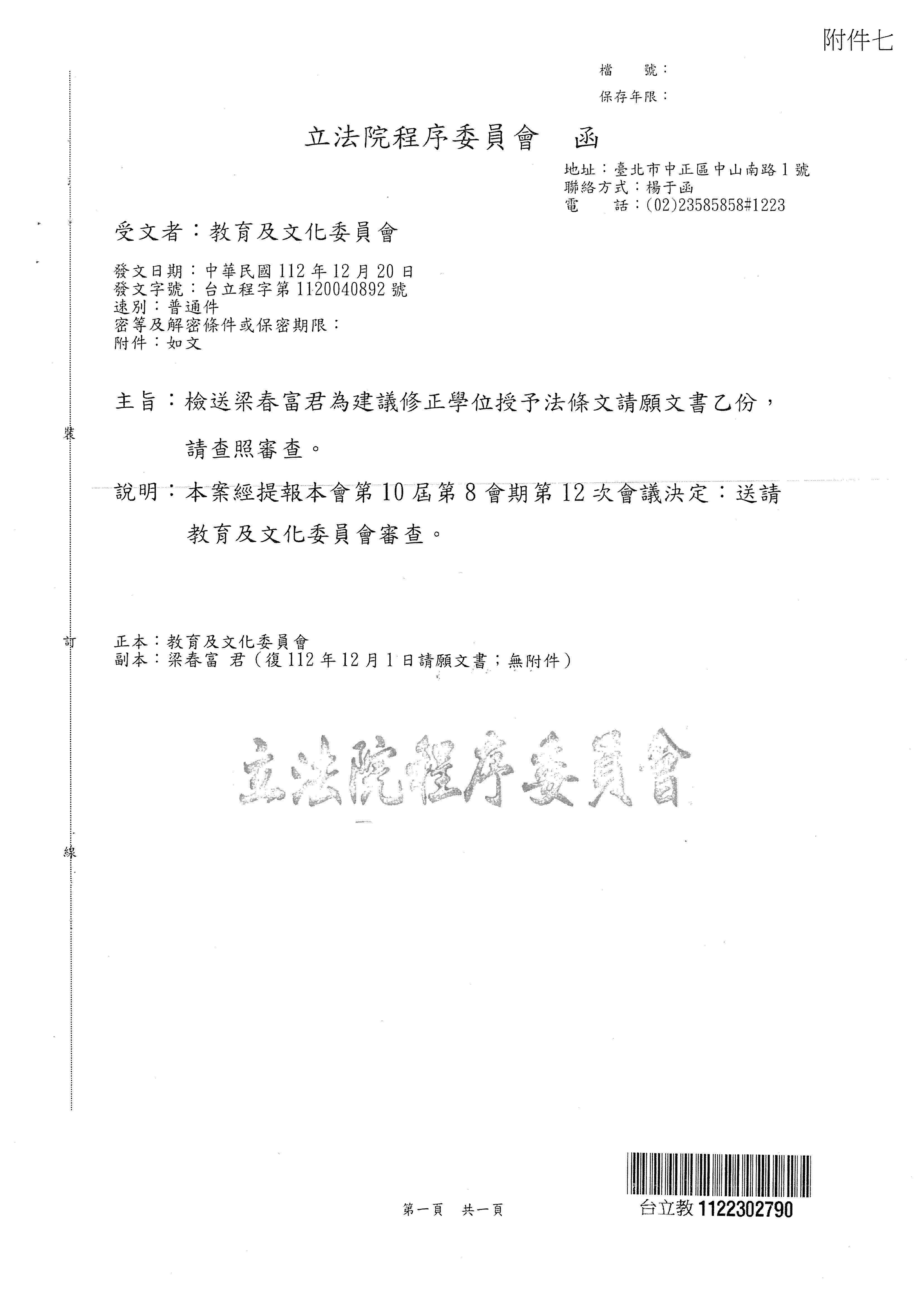 四、審查有關梁春富君為建議修正學位授予法條文請願案。