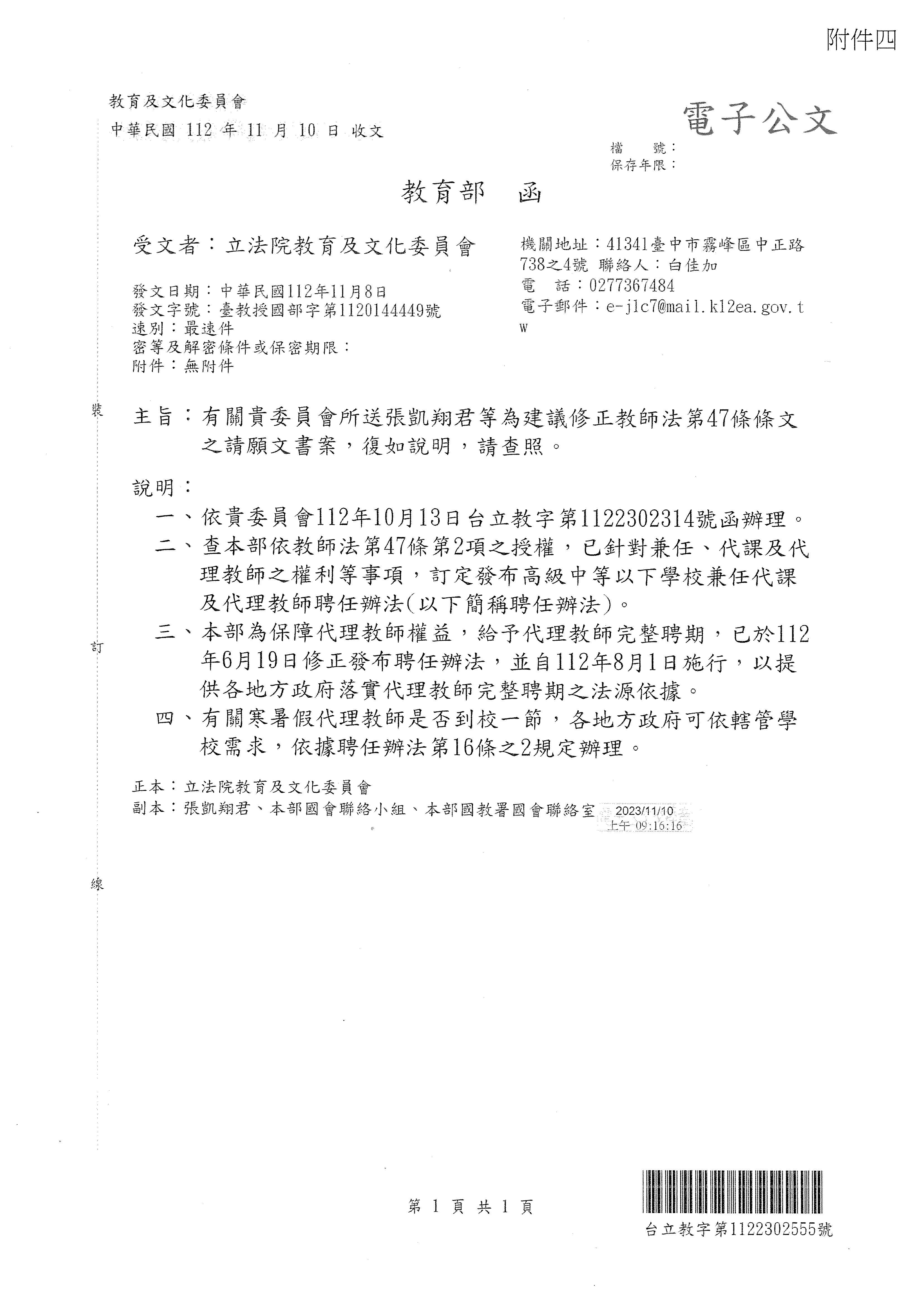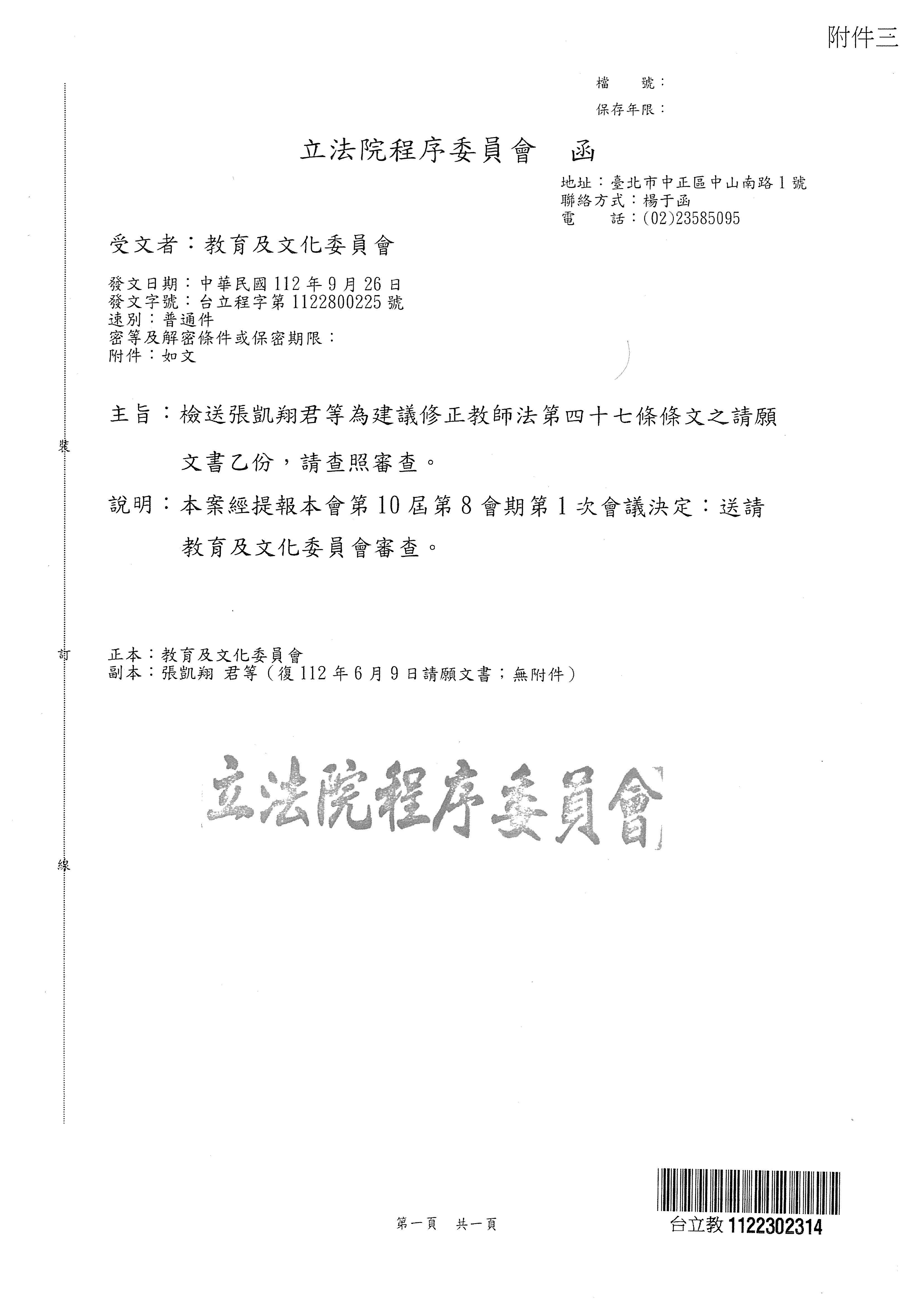 二、審查有關張凱翔君等為建議修正教師法第四十七條條文請願案。