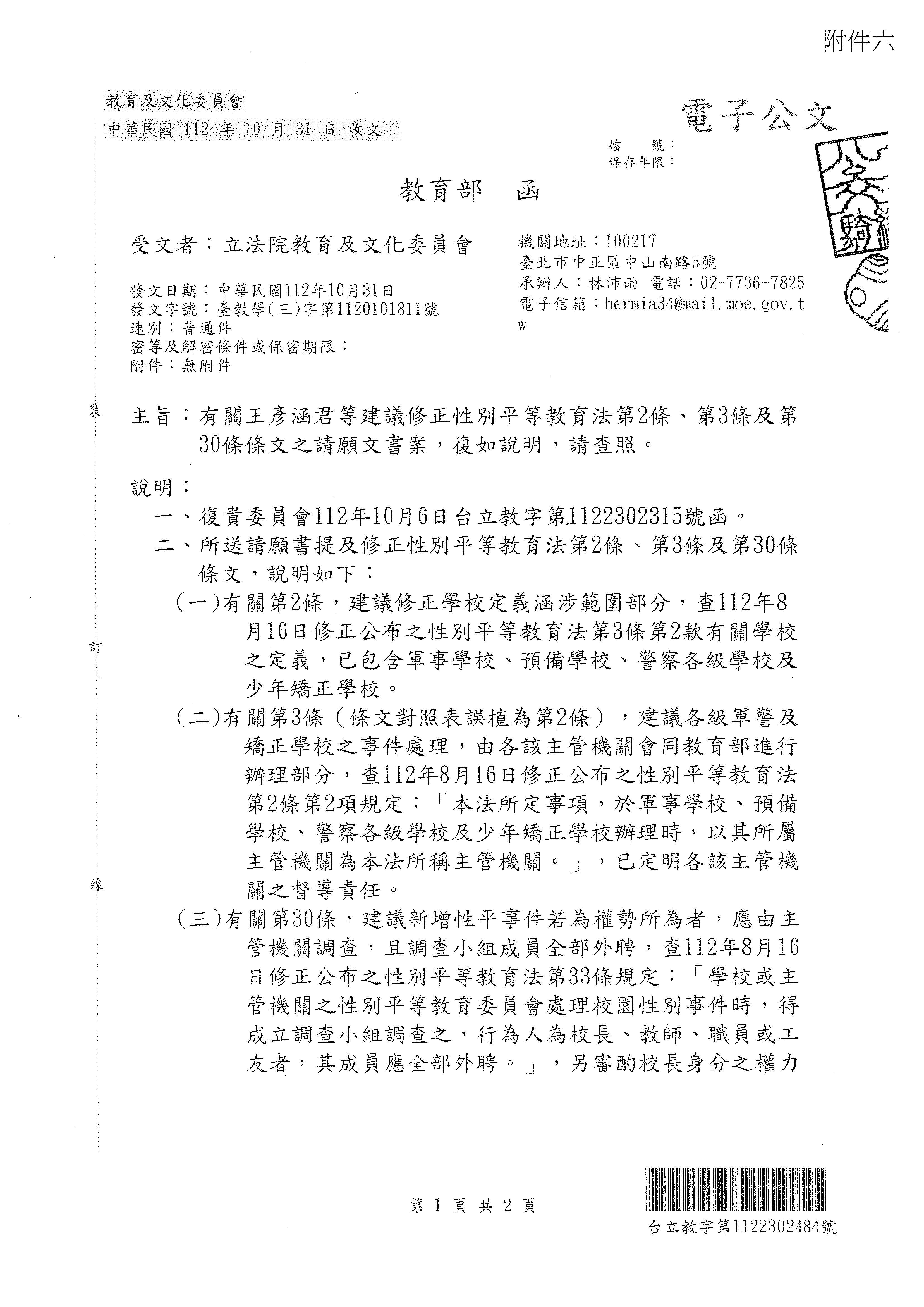 三、審查有關王彥涵君等為建議修正性別平等教育法第二條、第三條及第三十條條文請願案。