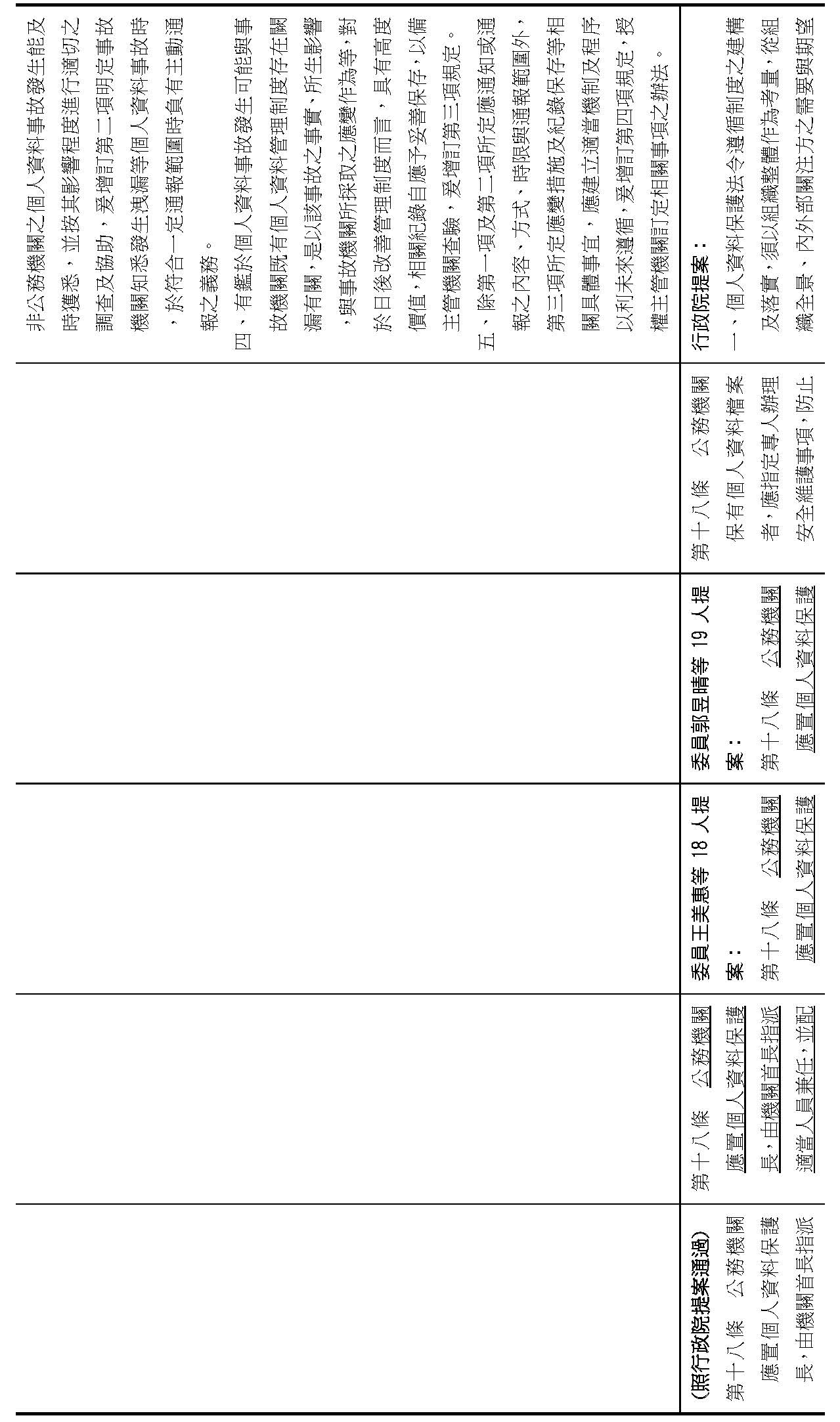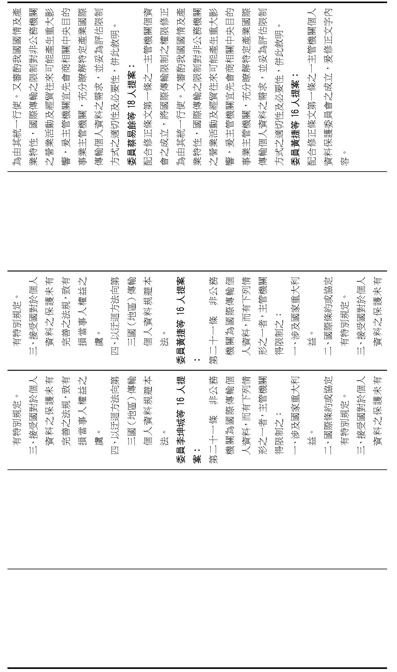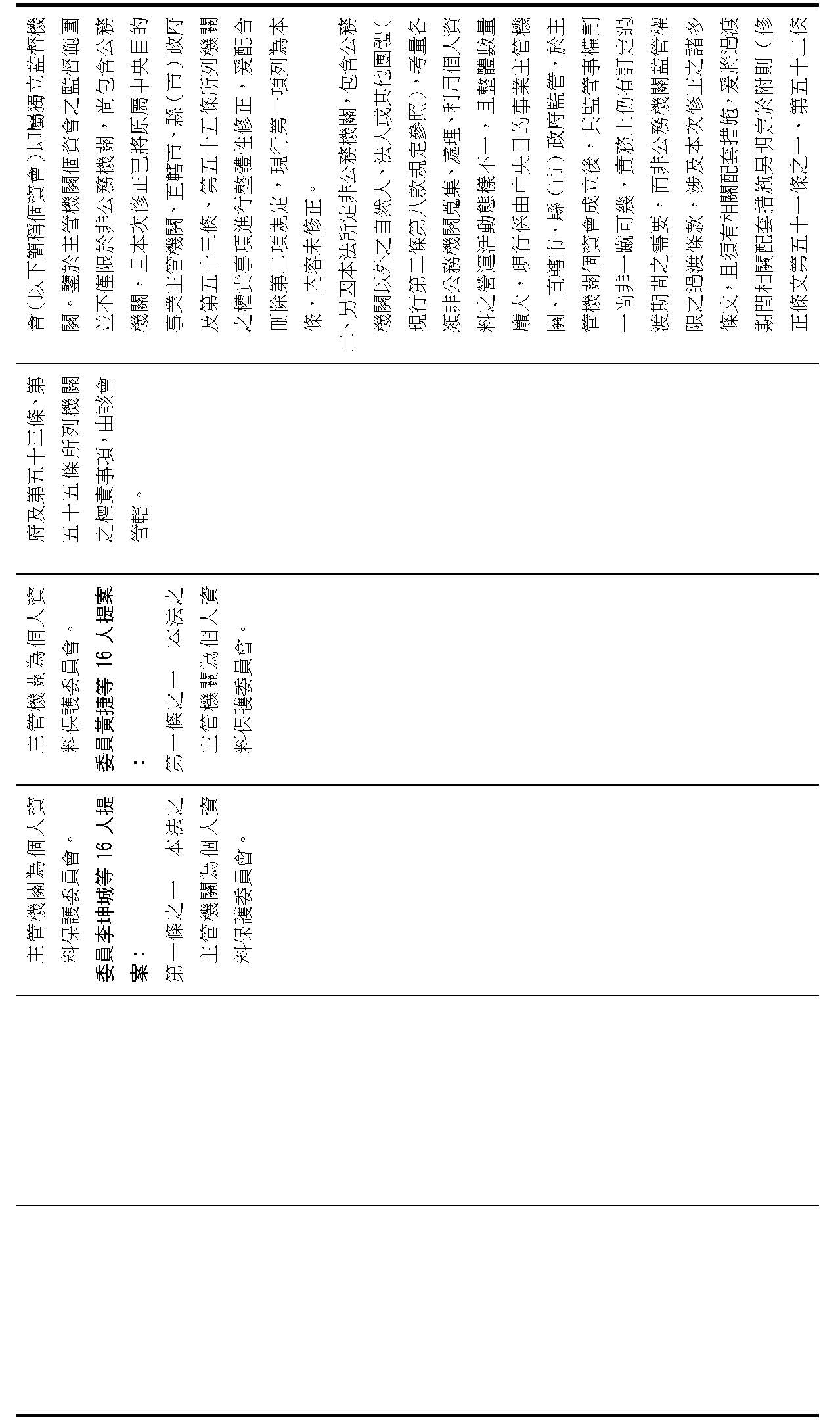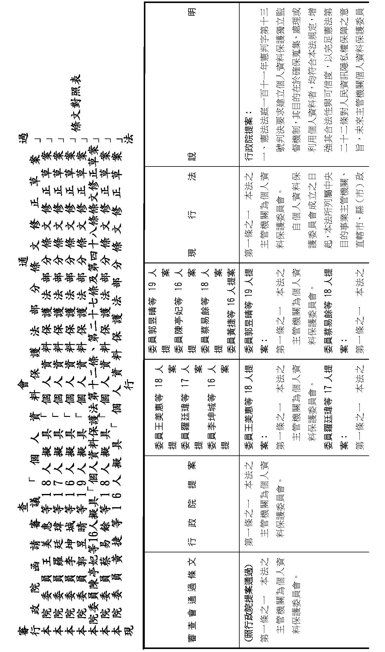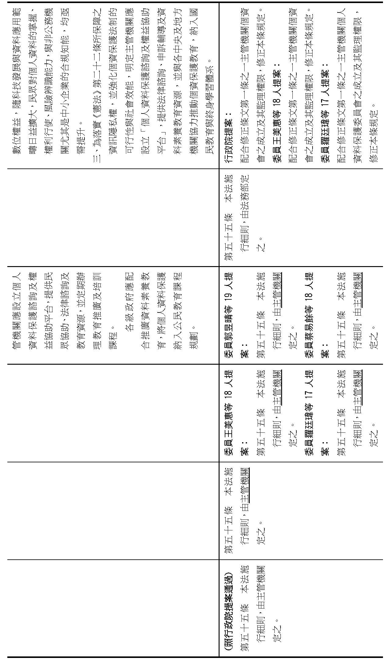 主旨:院會交付本會審查行政院函請審議「個人資料保護法部分條文修正草案」及本院委員王美惠等18人、委員羅廷瑋等17人、委員李坤城等16人、委員郭昱晴等19人、委員蔡易餘等18人、委員黃捷等16人分別擬具「個人資料保護法部分條文修正草案」、委員陳亭妃等16人擬具「個人資料保護法第十二條、第二十七條及第四十八條條文修正草案」等8案,業經併案審查完竣,並決議須交由黨團協商,復請提報院會討論。