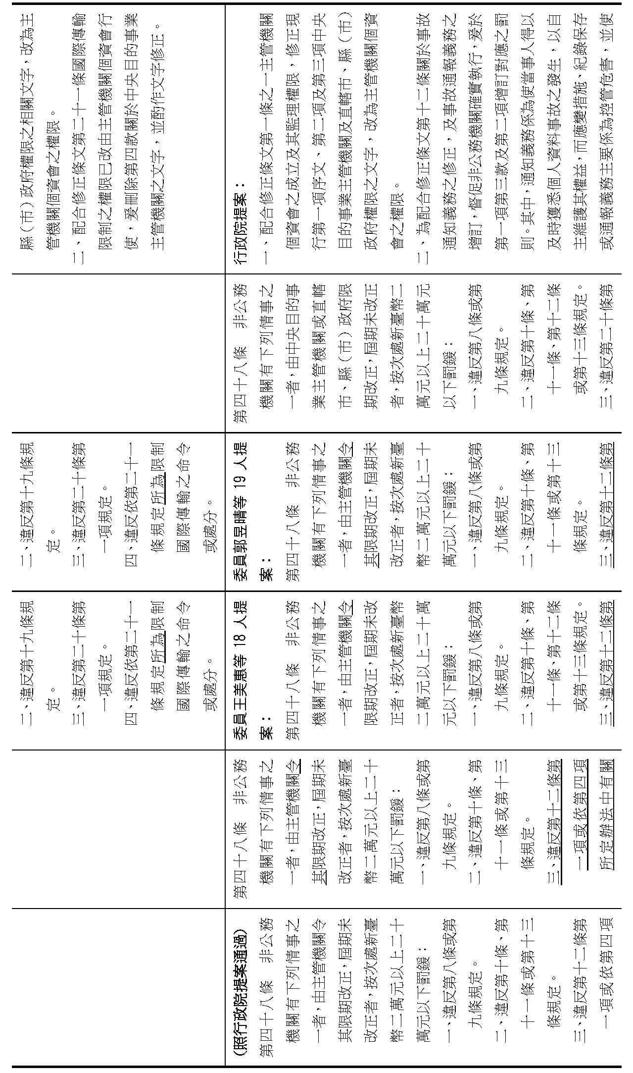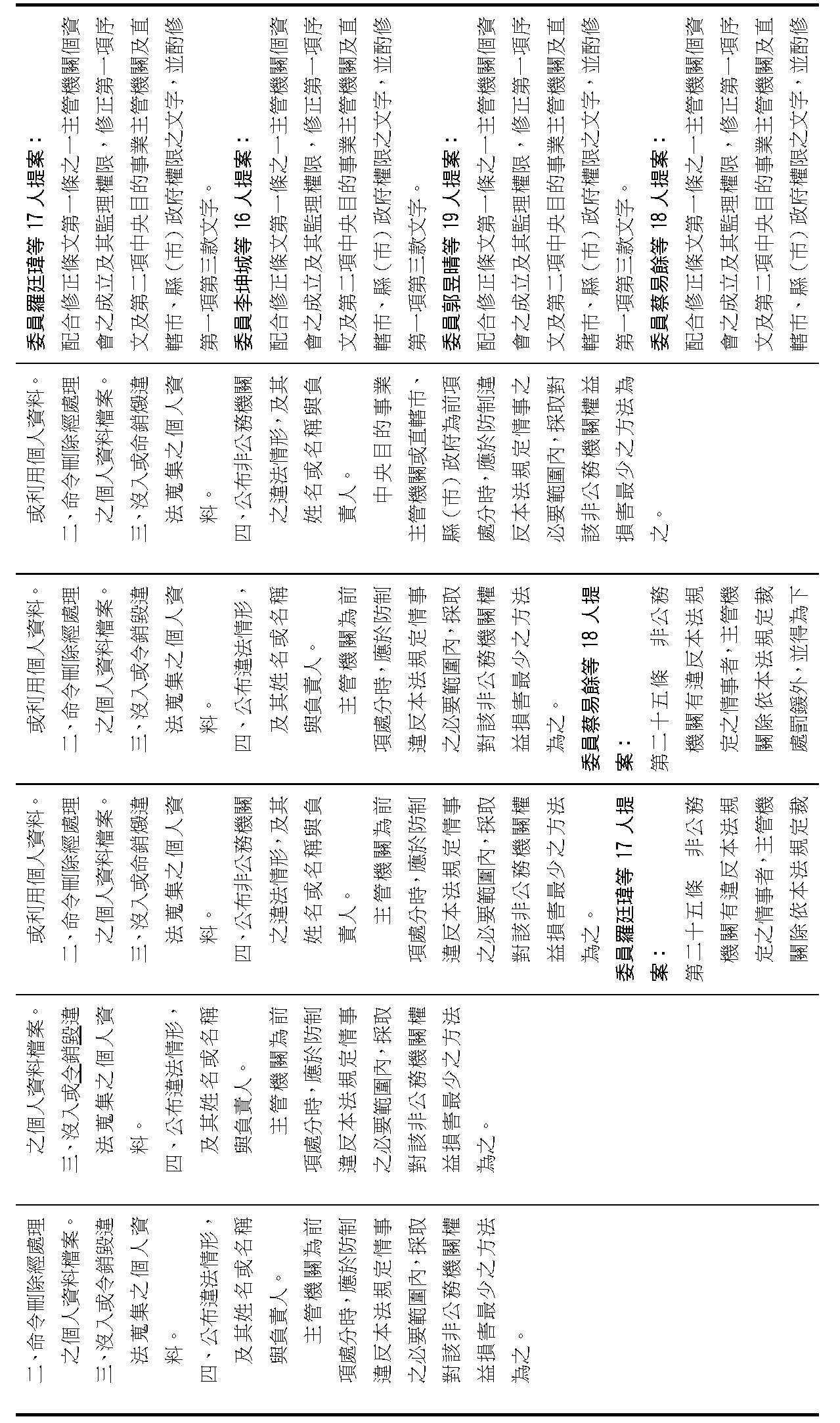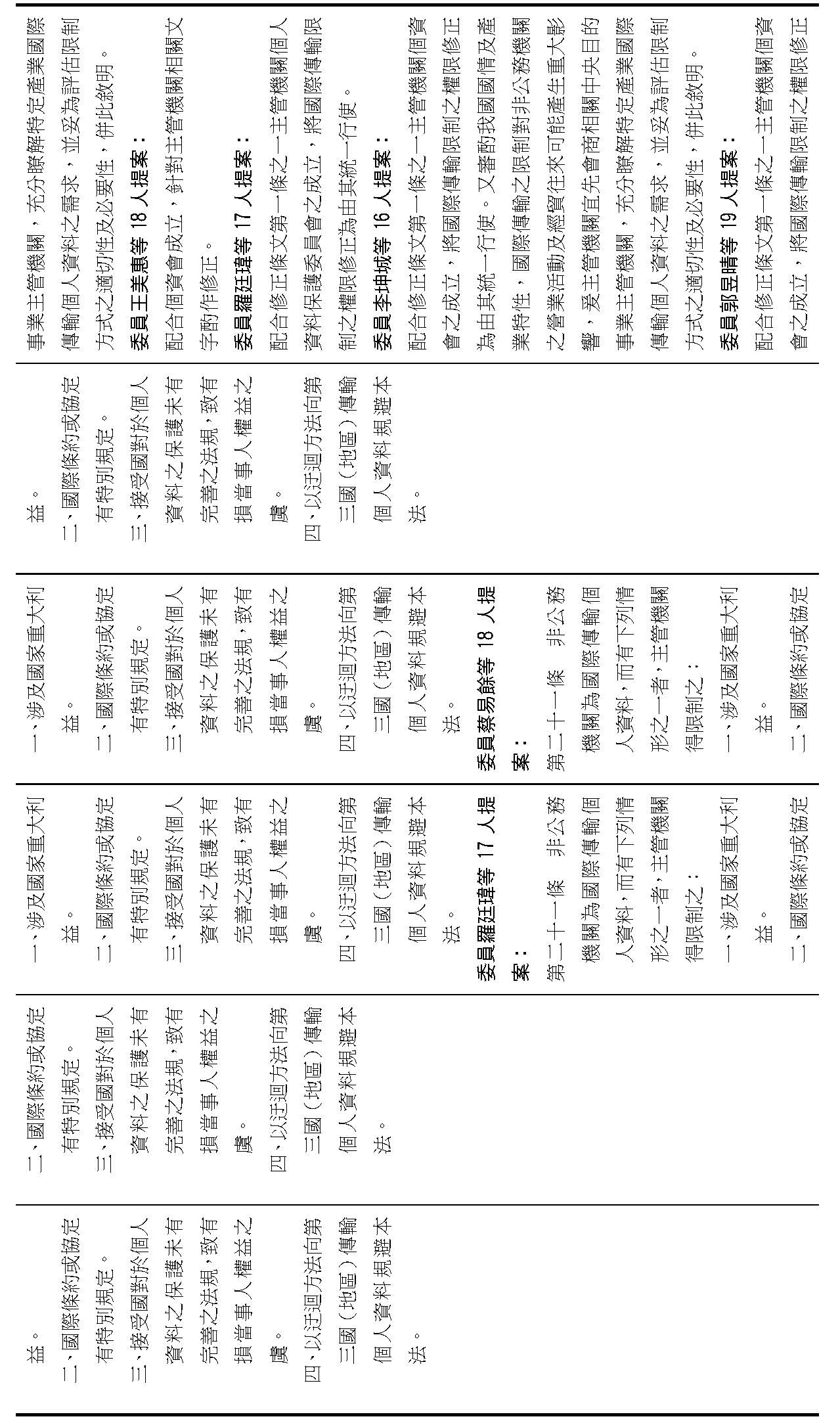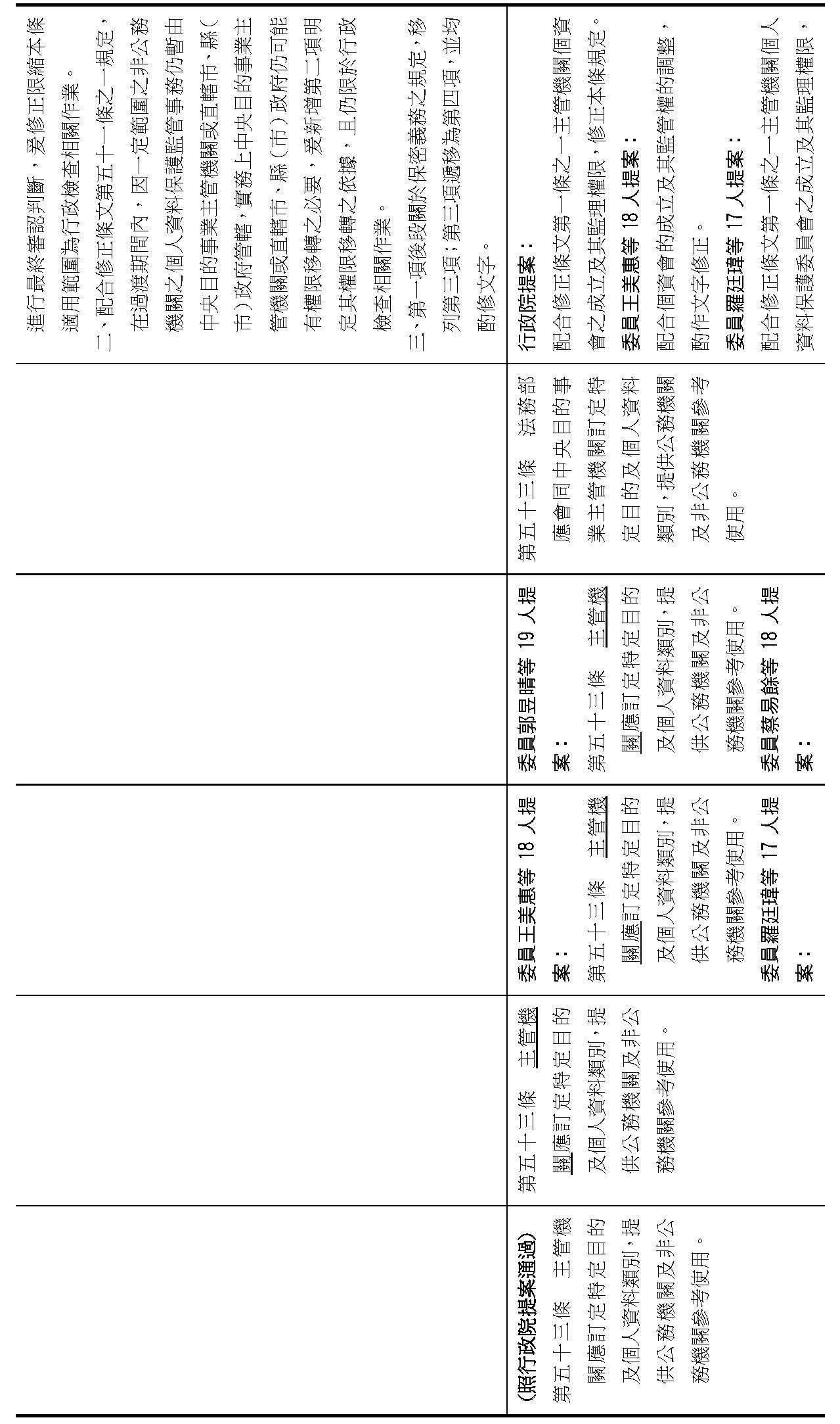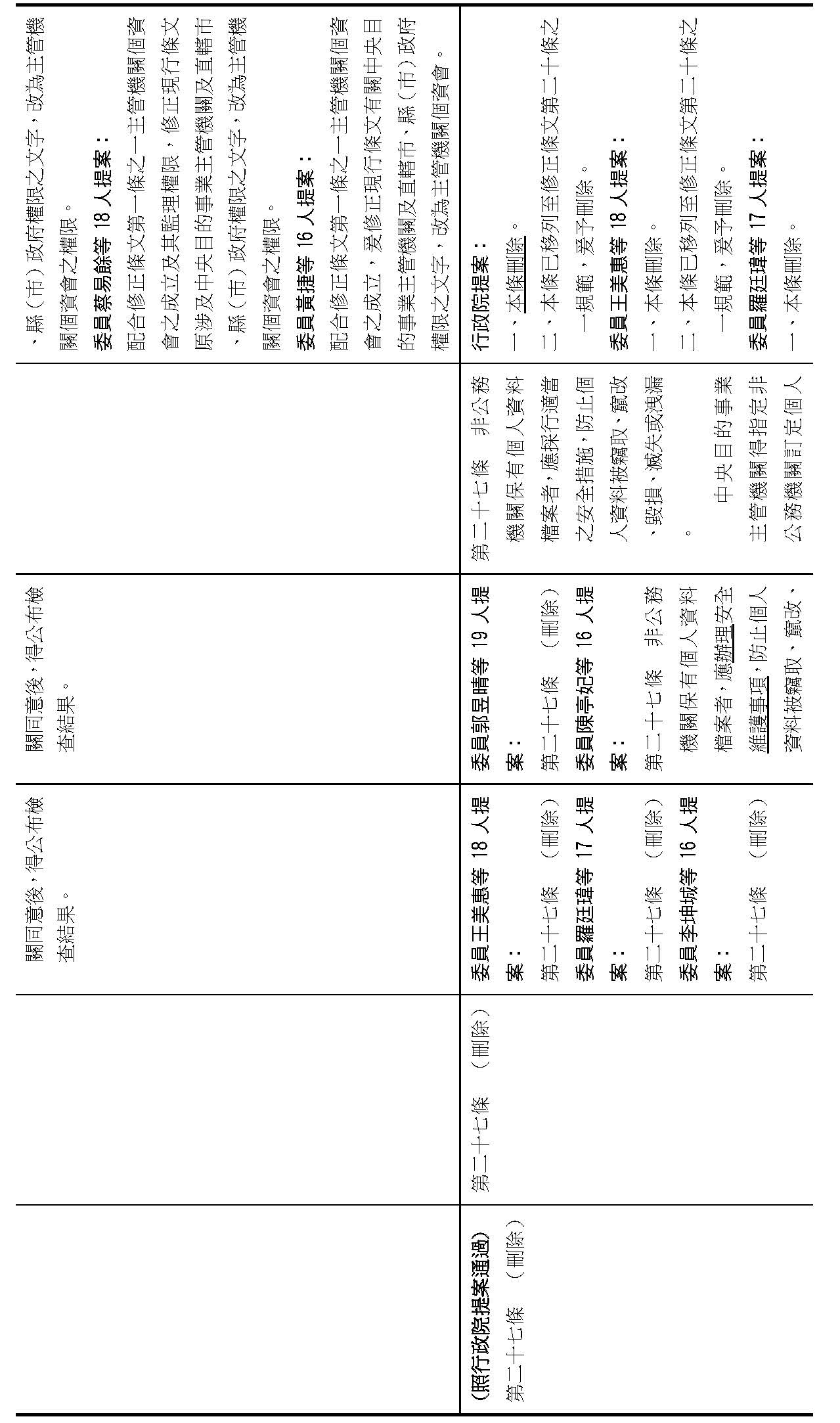 主旨:院會交付本會審查行政院函請審議「個人資料保護法部分條文修正草案」及本院委員王美惠等18人、委員羅廷瑋等17人、委員李坤城等16人、委員郭昱晴等19人、委員蔡易餘等18人、委員黃捷等16人分別擬具「個人資料保護法部分條文修正草案」、委員陳亭妃等16人擬具「個人資料保護法第十二條、第二十七條及第四十八條條文修正草案」等8案,業經併案審查完竣,並決議須交由黨團協商,復請提報院會討論。