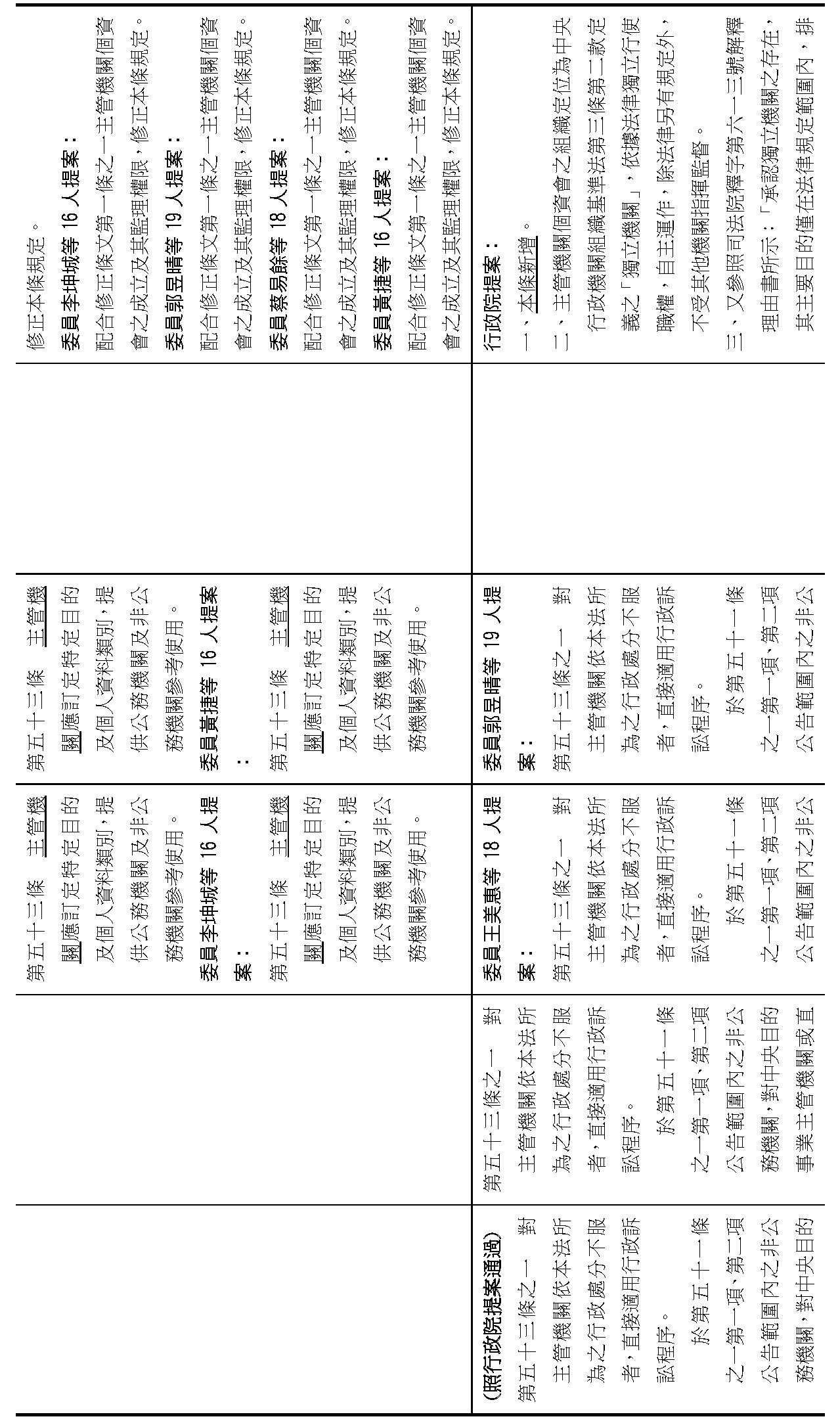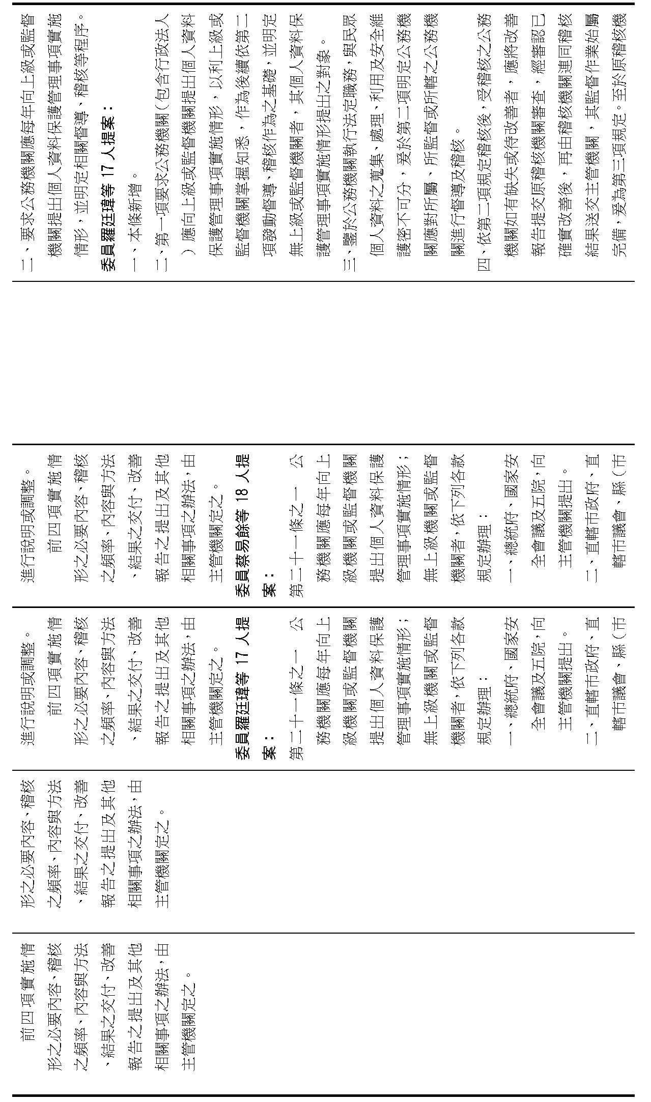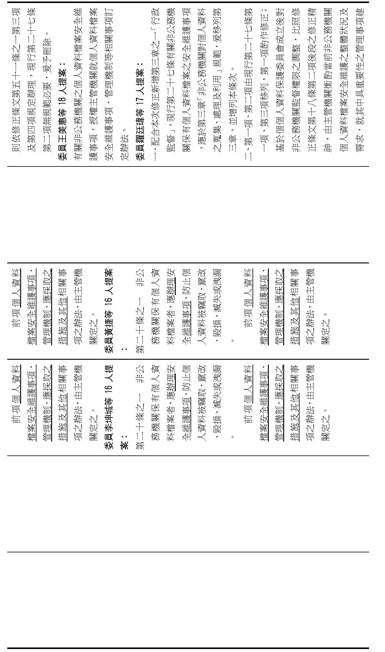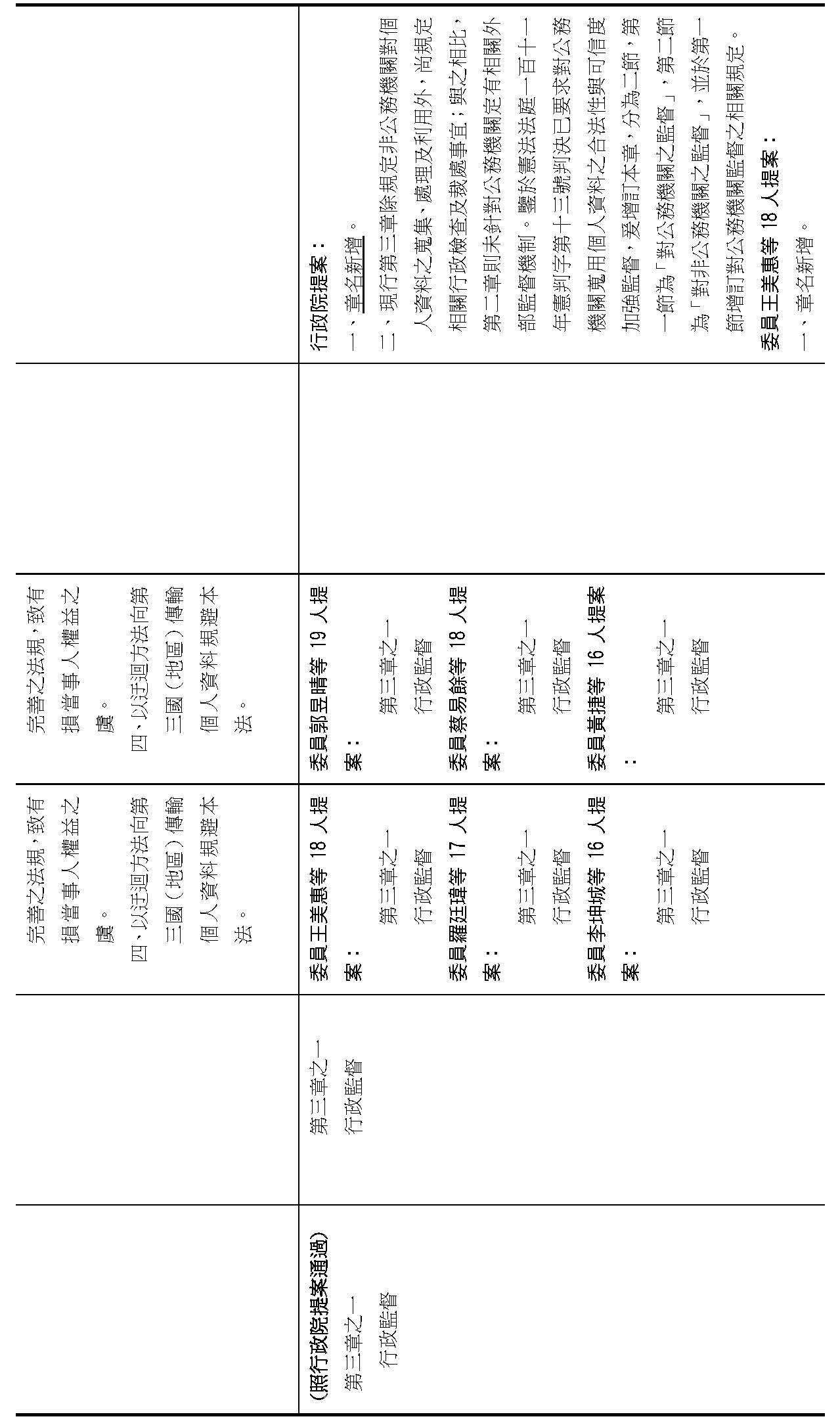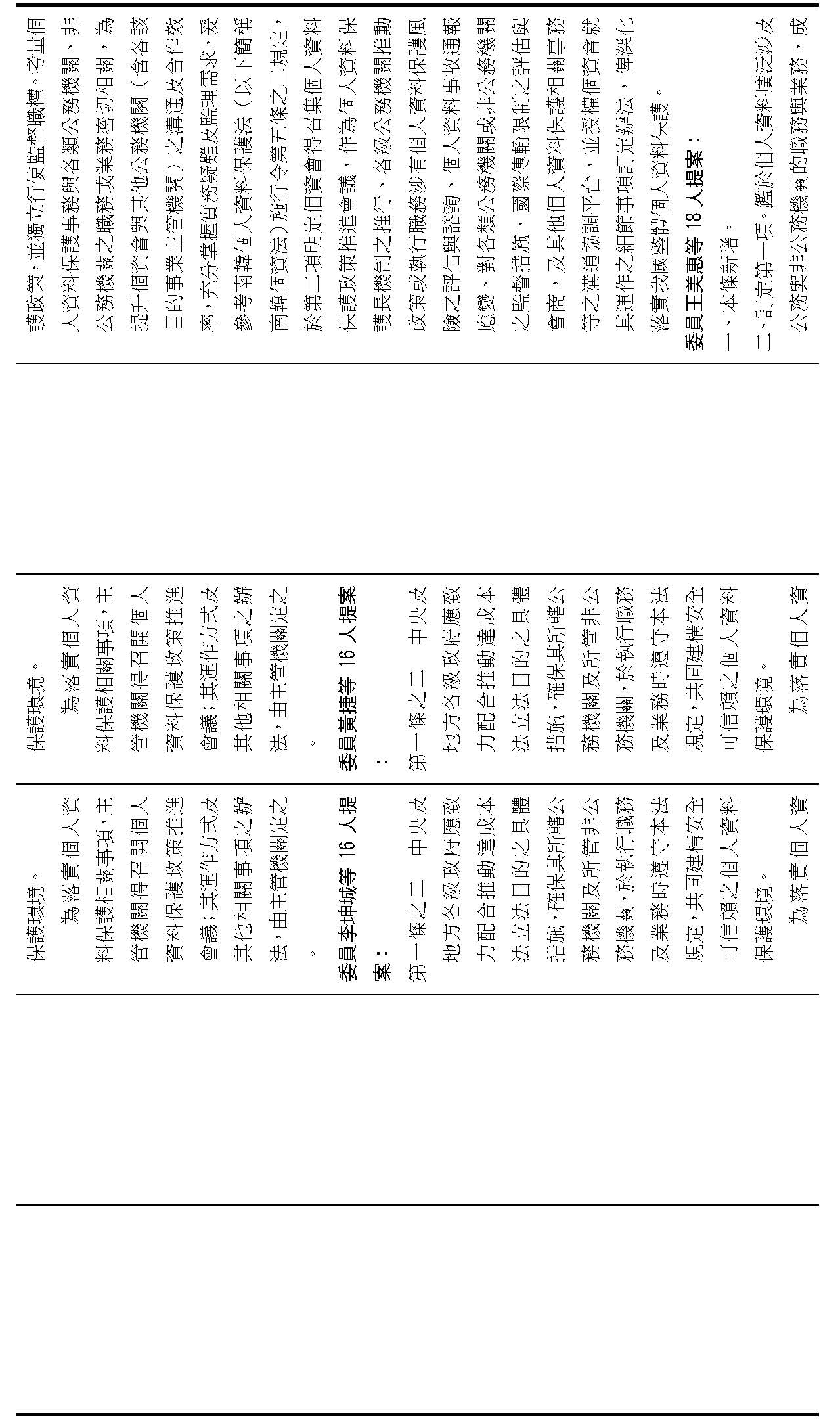 主旨:院會交付本會審查行政院函請審議「個人資料保護法部分條文修正草案」及本院委員王美惠等18人、委員羅廷瑋等17人、委員李坤城等16人、委員郭昱晴等19人、委員蔡易餘等18人、委員黃捷等16人分別擬具「個人資料保護法部分條文修正草案」、委員陳亭妃等16人擬具「個人資料保護法第十二條、第二十七條及第四十八條條文修正草案」等8案,業經併案審查完竣,並決議須交由黨團協商,復請提報院會討論。