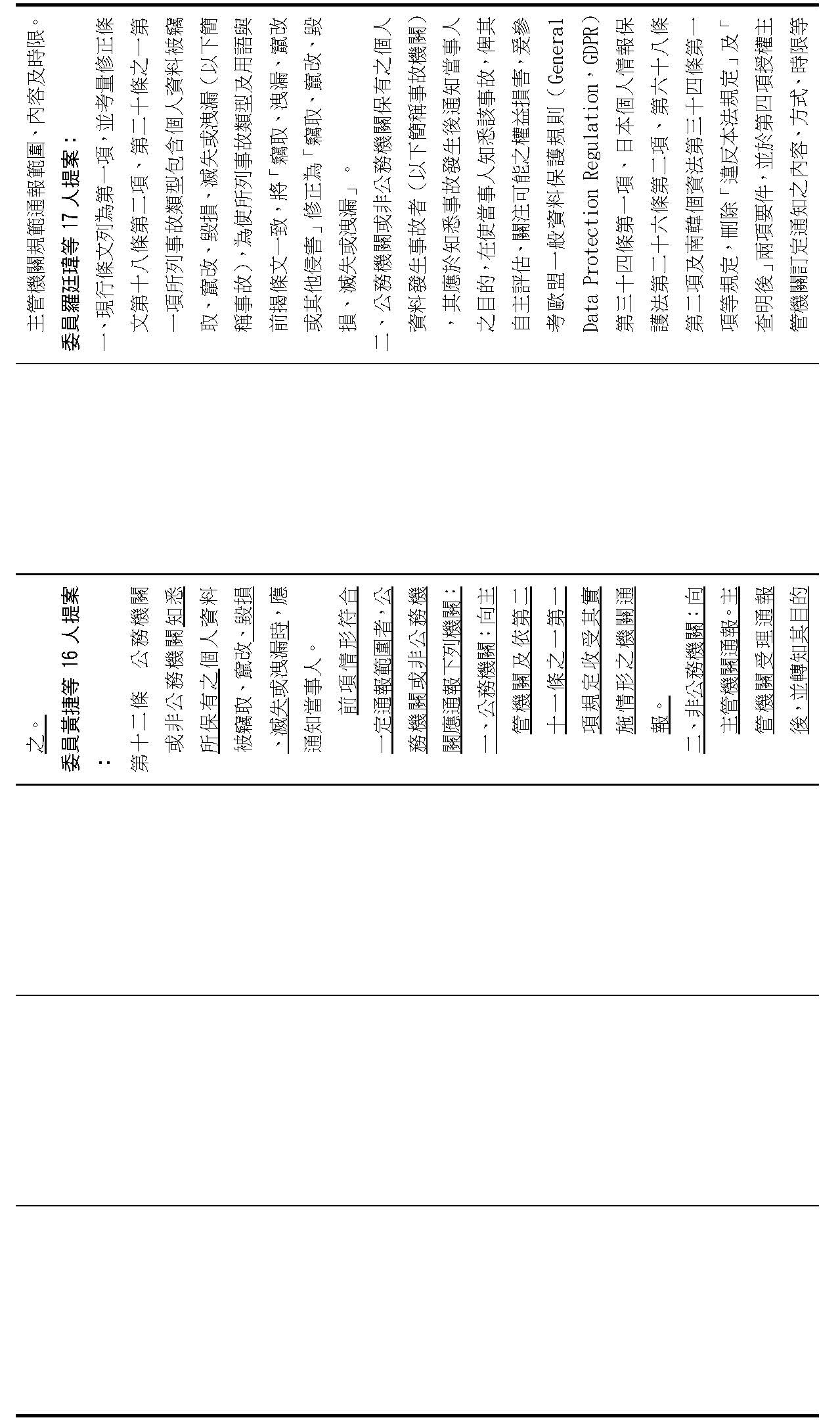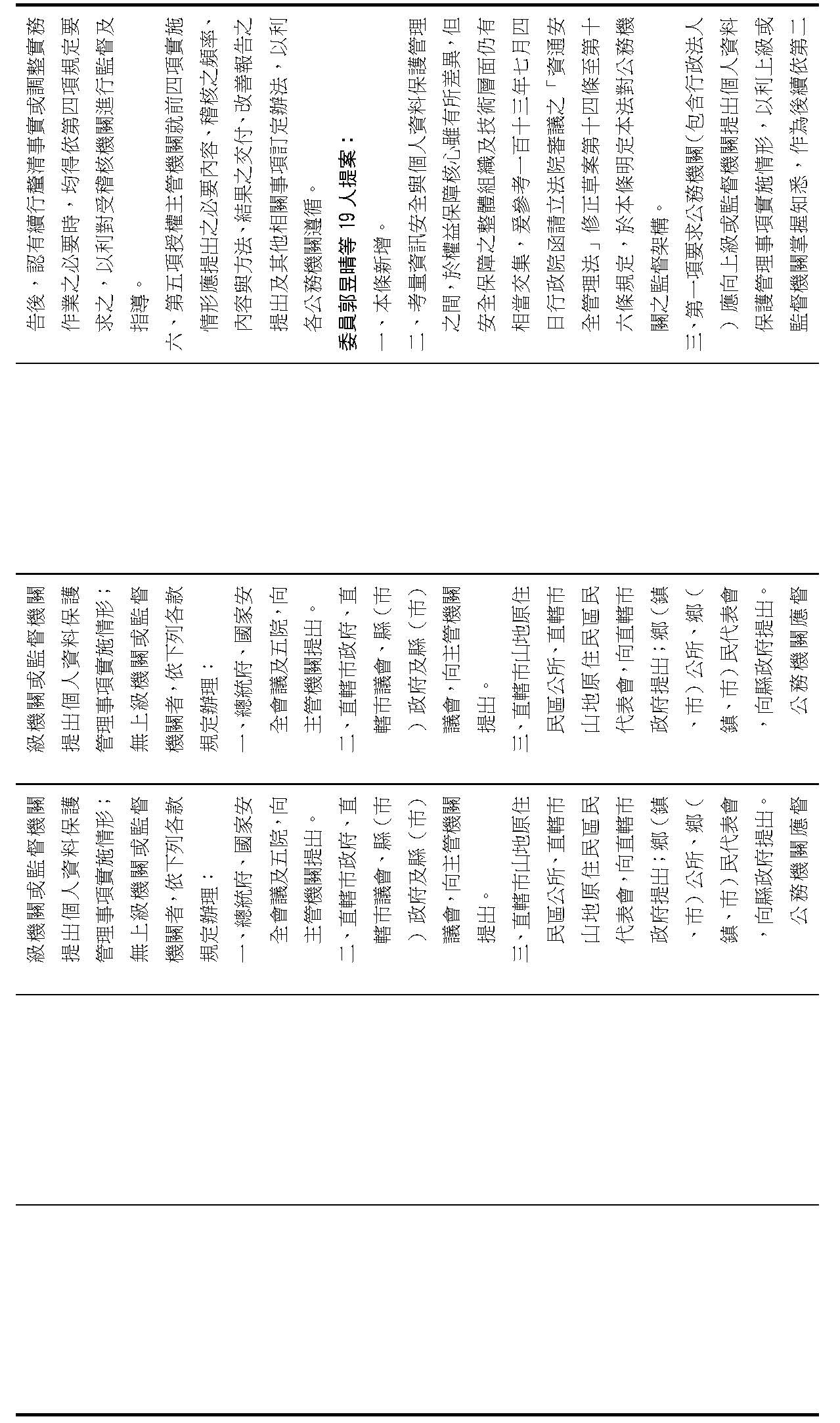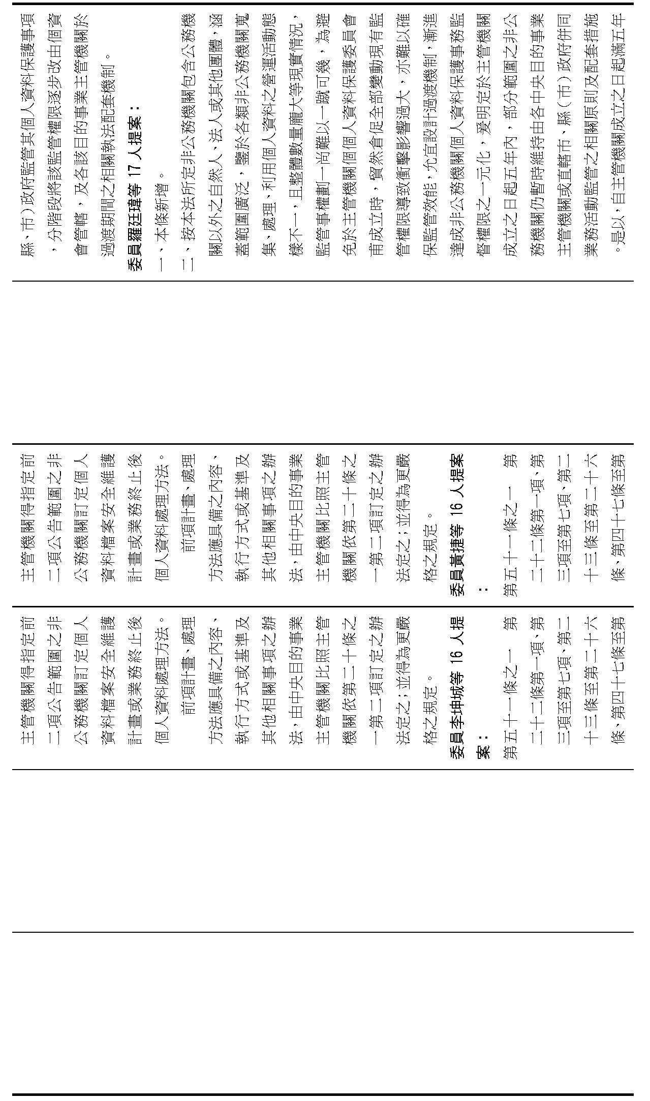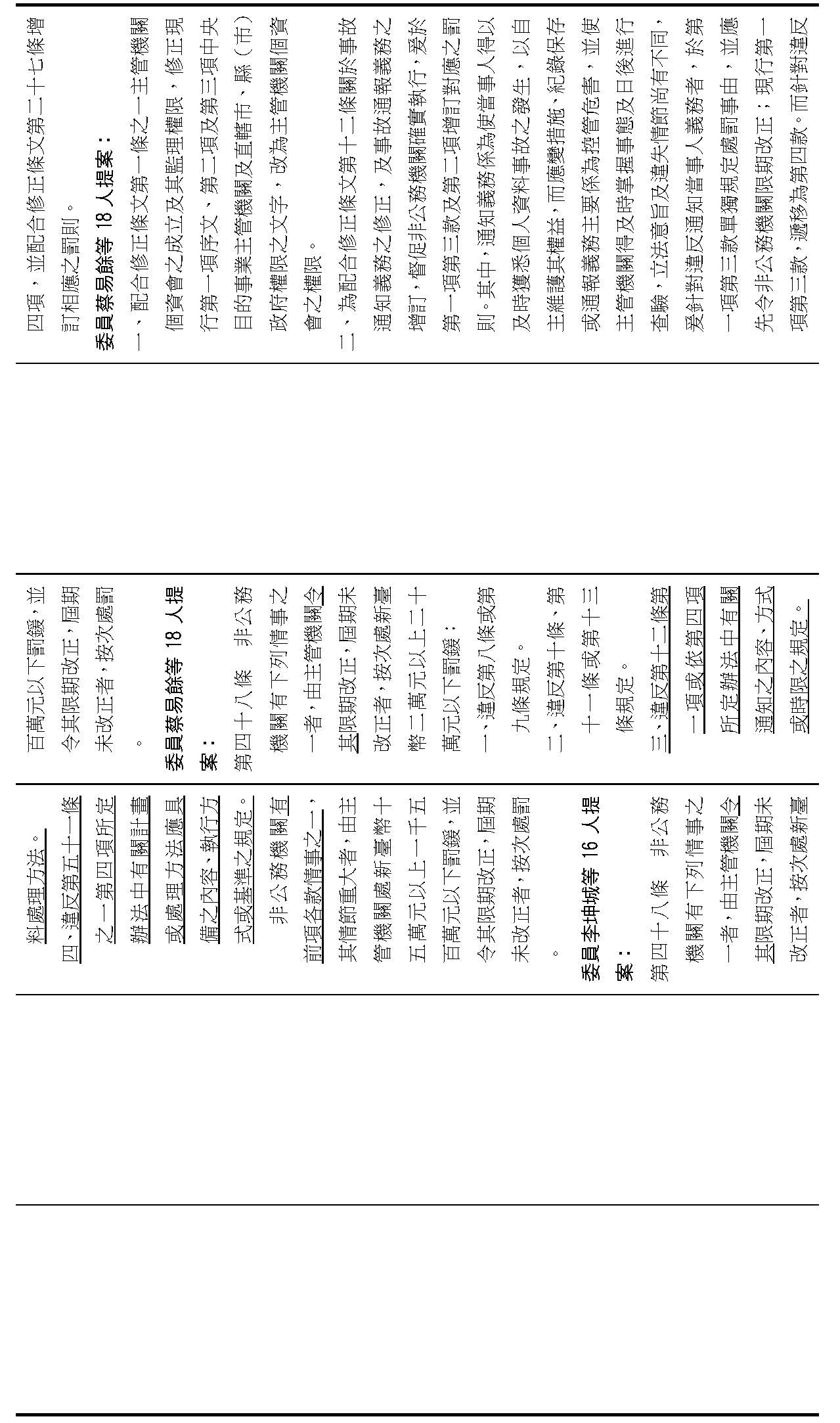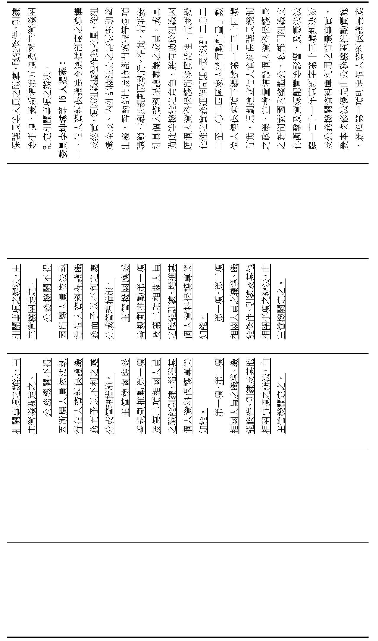 主旨:院會交付本會審查行政院函請審議「個人資料保護法部分條文修正草案」及本院委員王美惠等18人、委員羅廷瑋等17人、委員李坤城等16人、委員郭昱晴等19人、委員蔡易餘等18人、委員黃捷等16人分別擬具「個人資料保護法部分條文修正草案」、委員陳亭妃等16人擬具「個人資料保護法第十二條、第二十七條及第四十八條條文修正草案」等8案,業經併案審查完竣,並決議須交由黨團協商,復請提報院會討論。