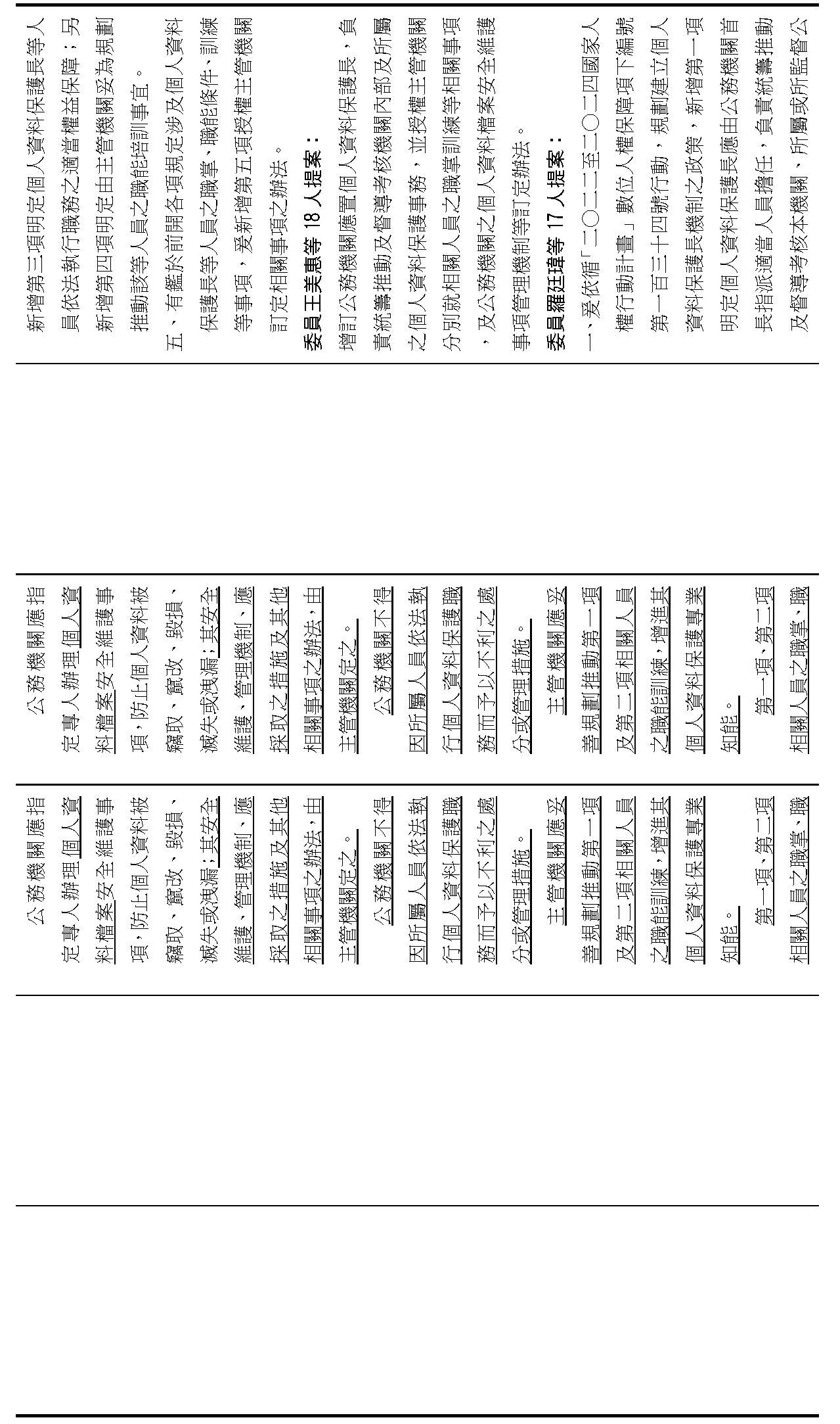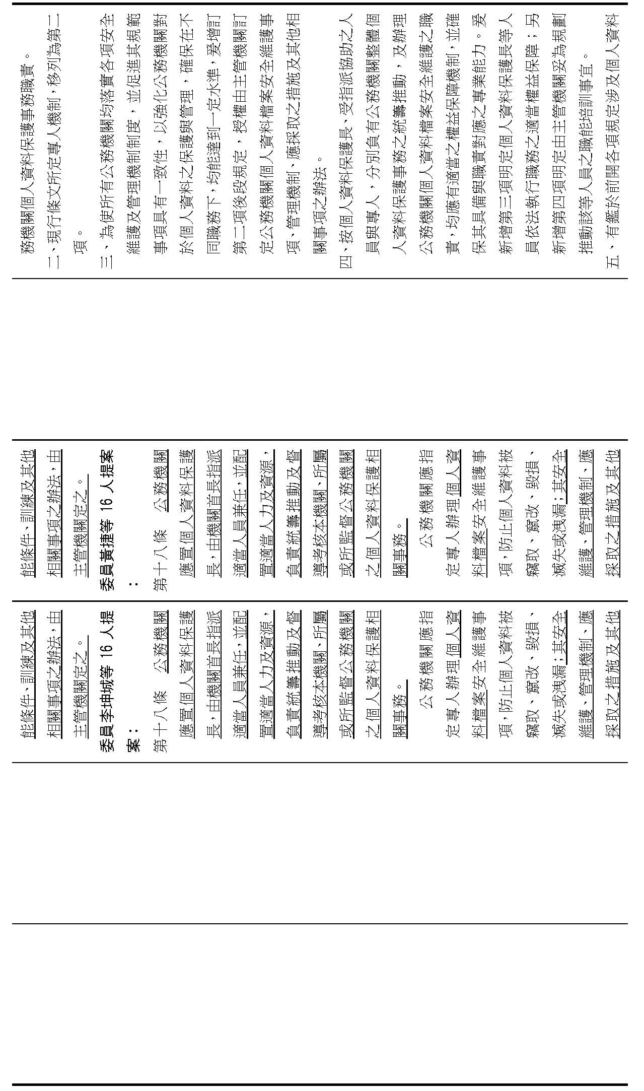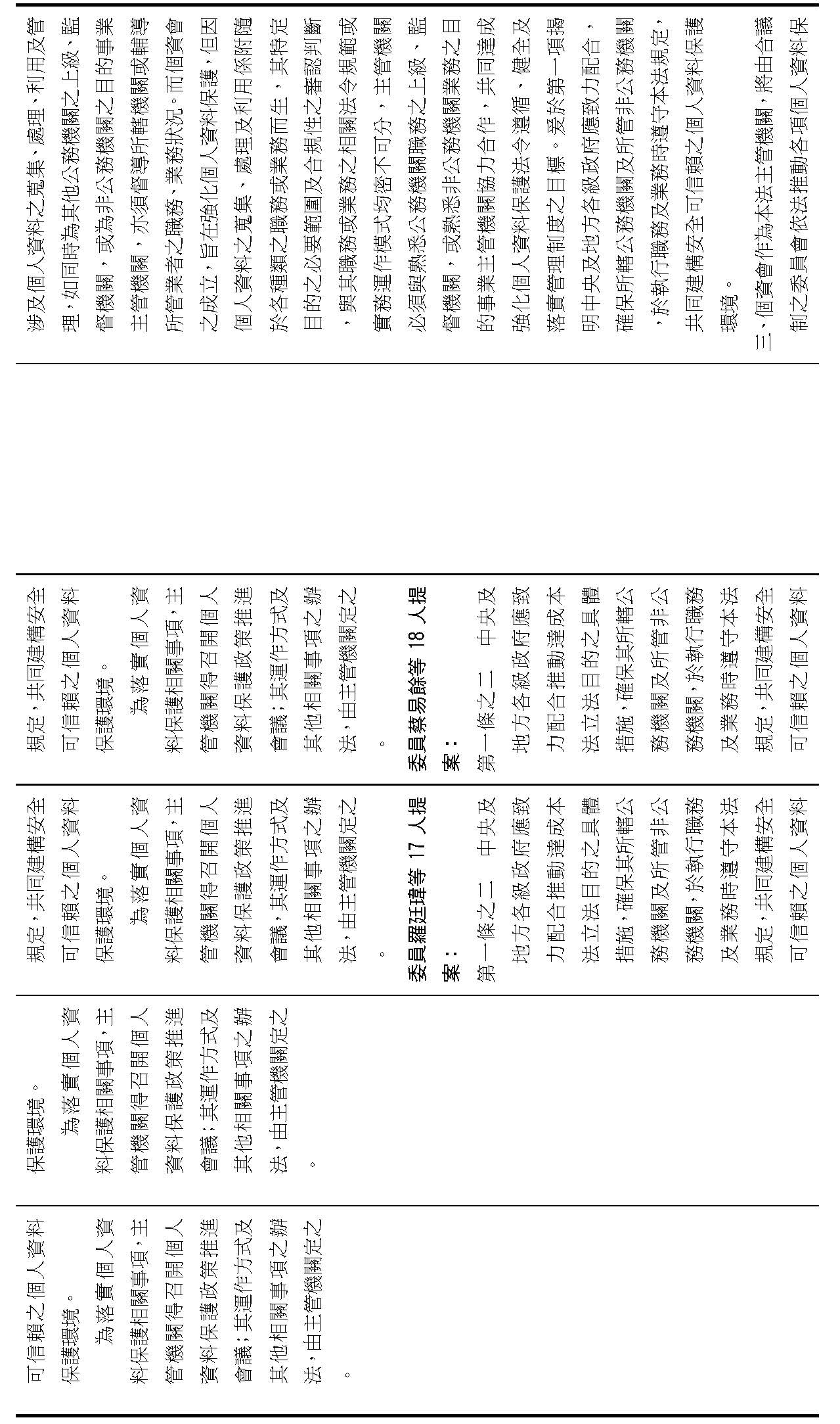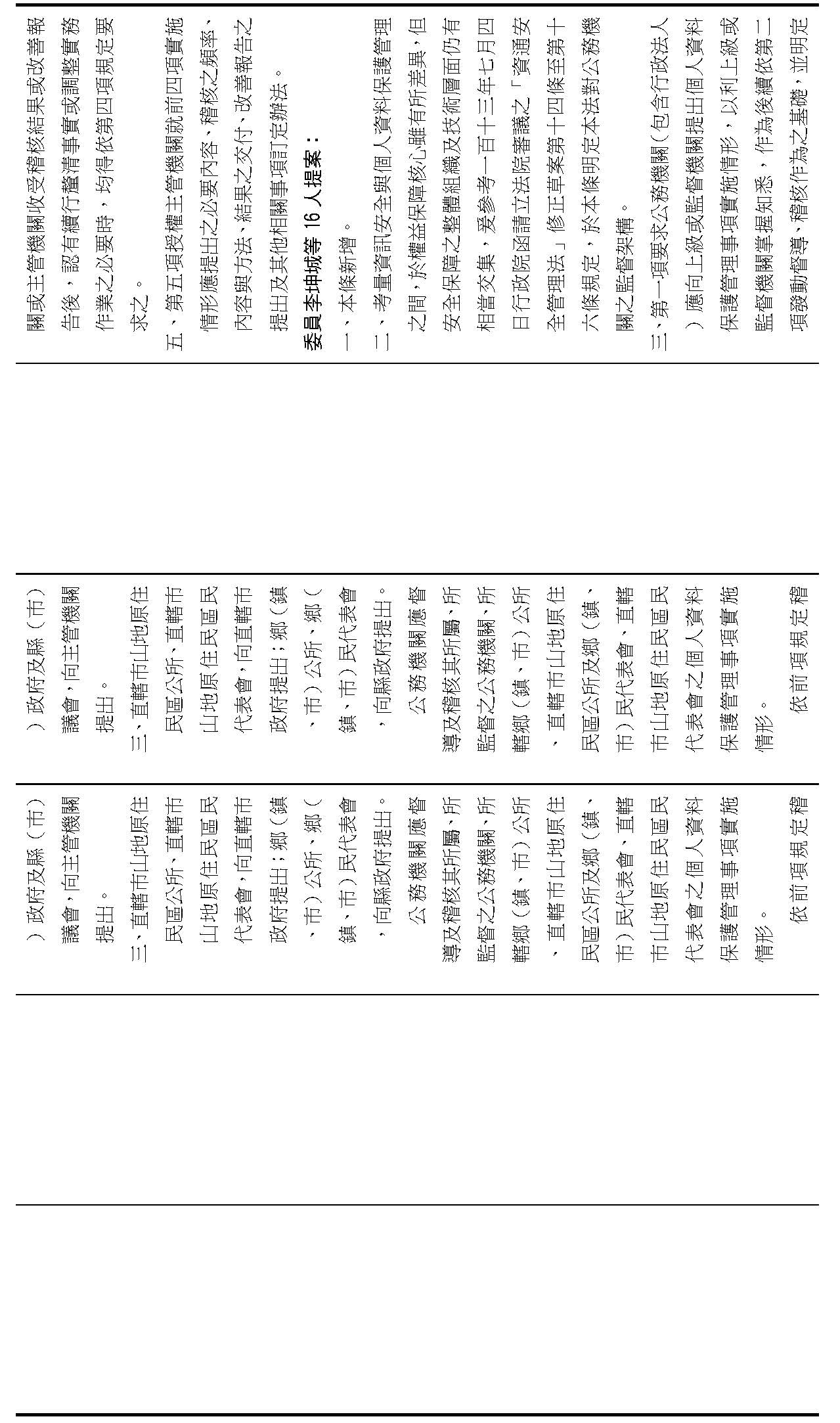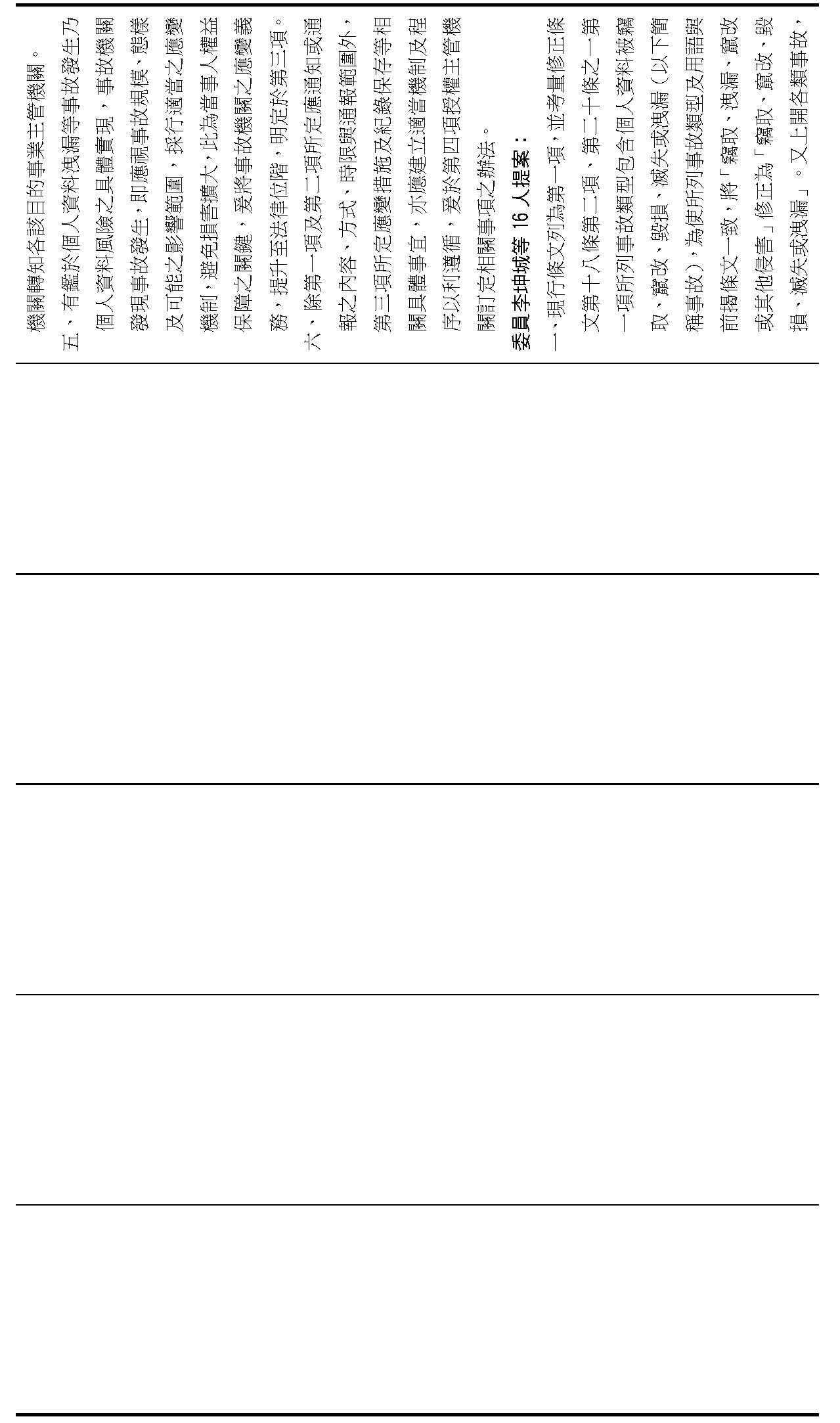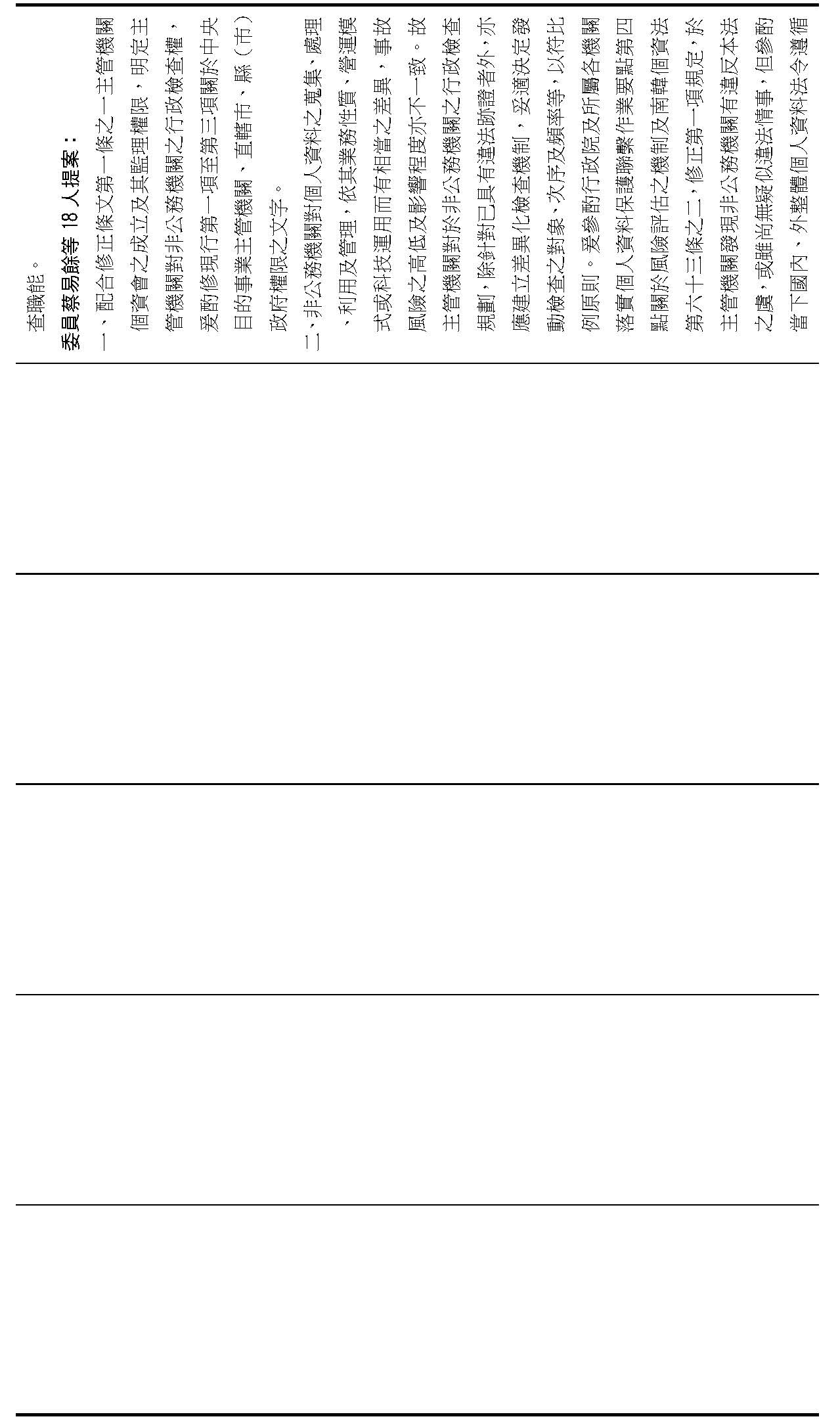 主旨:院會交付本會審查行政院函請審議「個人資料保護法部分條文修正草案」及本院委員王美惠等18人、委員羅廷瑋等17人、委員李坤城等16人、委員郭昱晴等19人、委員蔡易餘等18人、委員黃捷等16人分別擬具「個人資料保護法部分條文修正草案」、委員陳亭妃等16人擬具「個人資料保護法第十二條、第二十七條及第四十八條條文修正草案」等8案,業經併案審查完竣,並決議須交由黨團協商,復請提報院會討論。