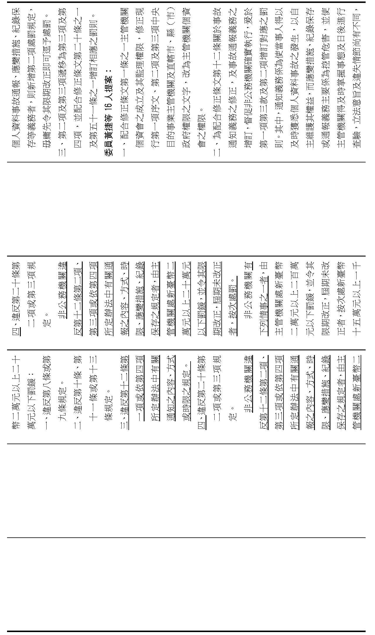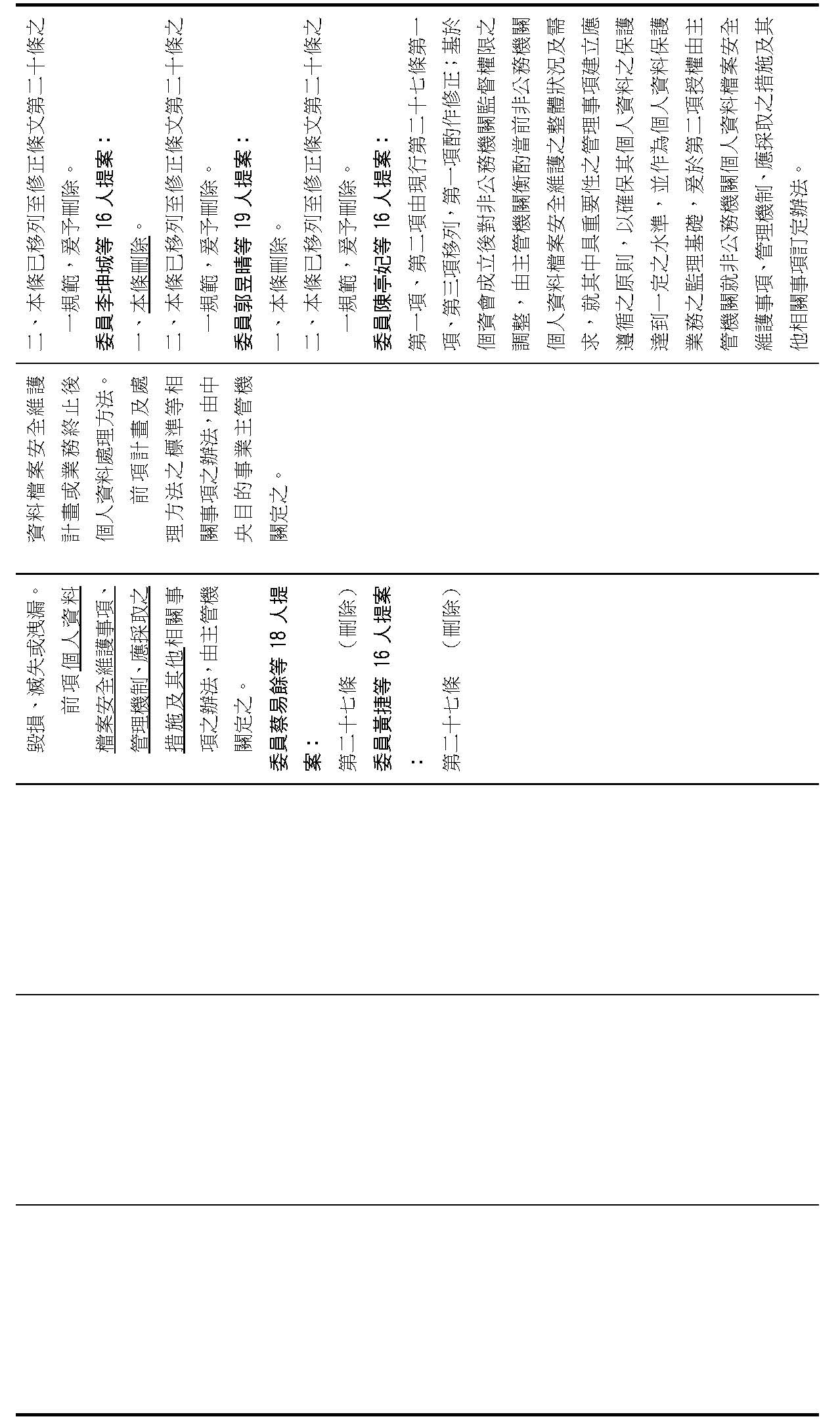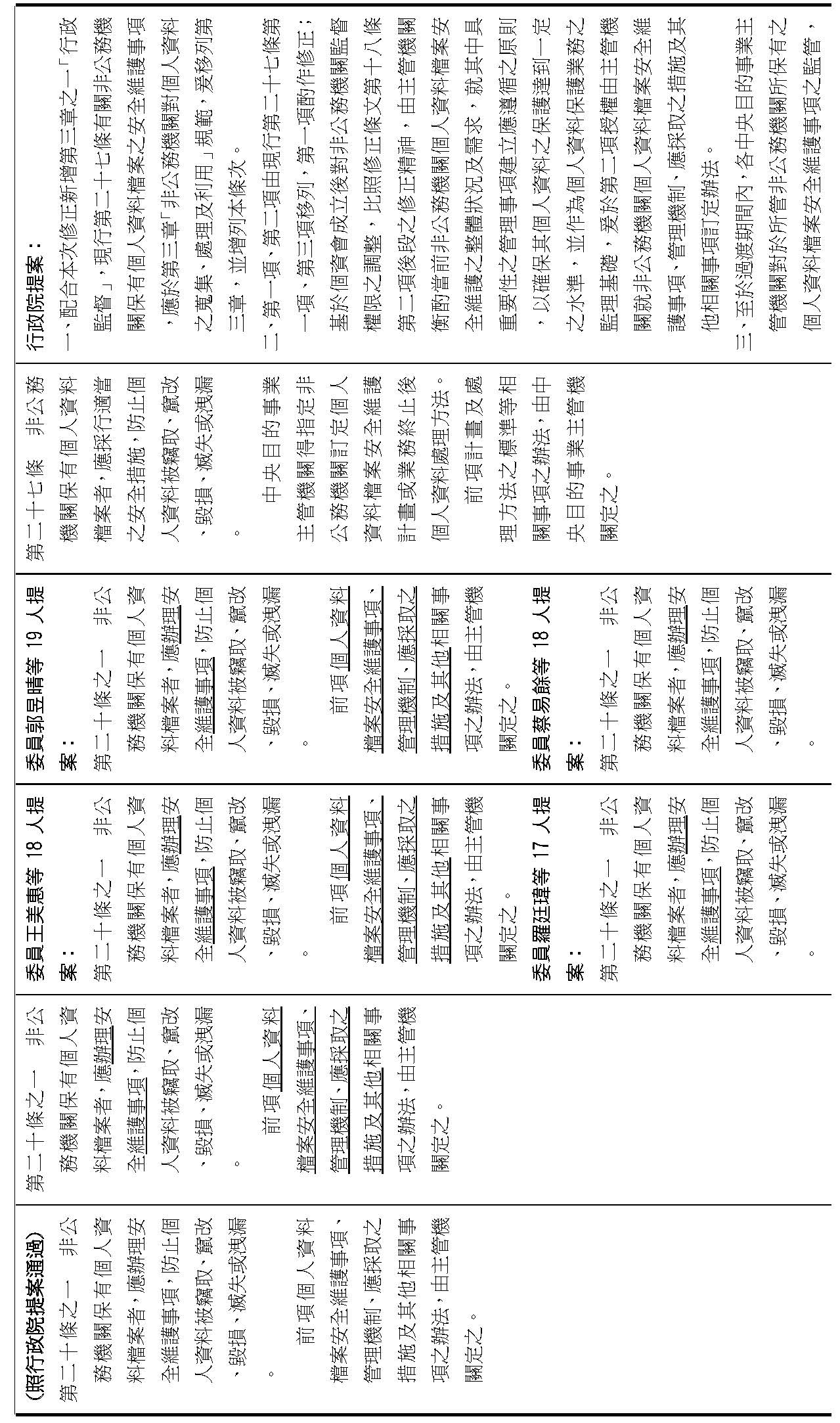 委員陳亭妃等16人擬具「個人資料保護法第十二條、第二十七條及第四十八條條文修正草案」,其中第27條規定非公務機關負有個資檔案安全維護義務,並授權主管機關訂定相關辦法;第48條第3項、第4項則規定違反第27條之相關行政處罰。