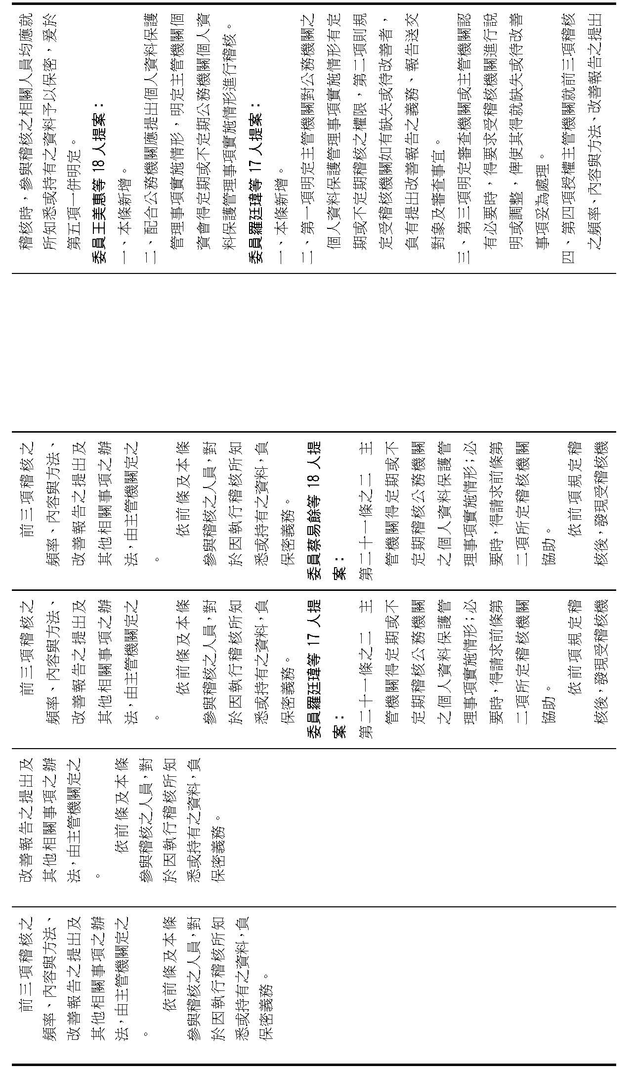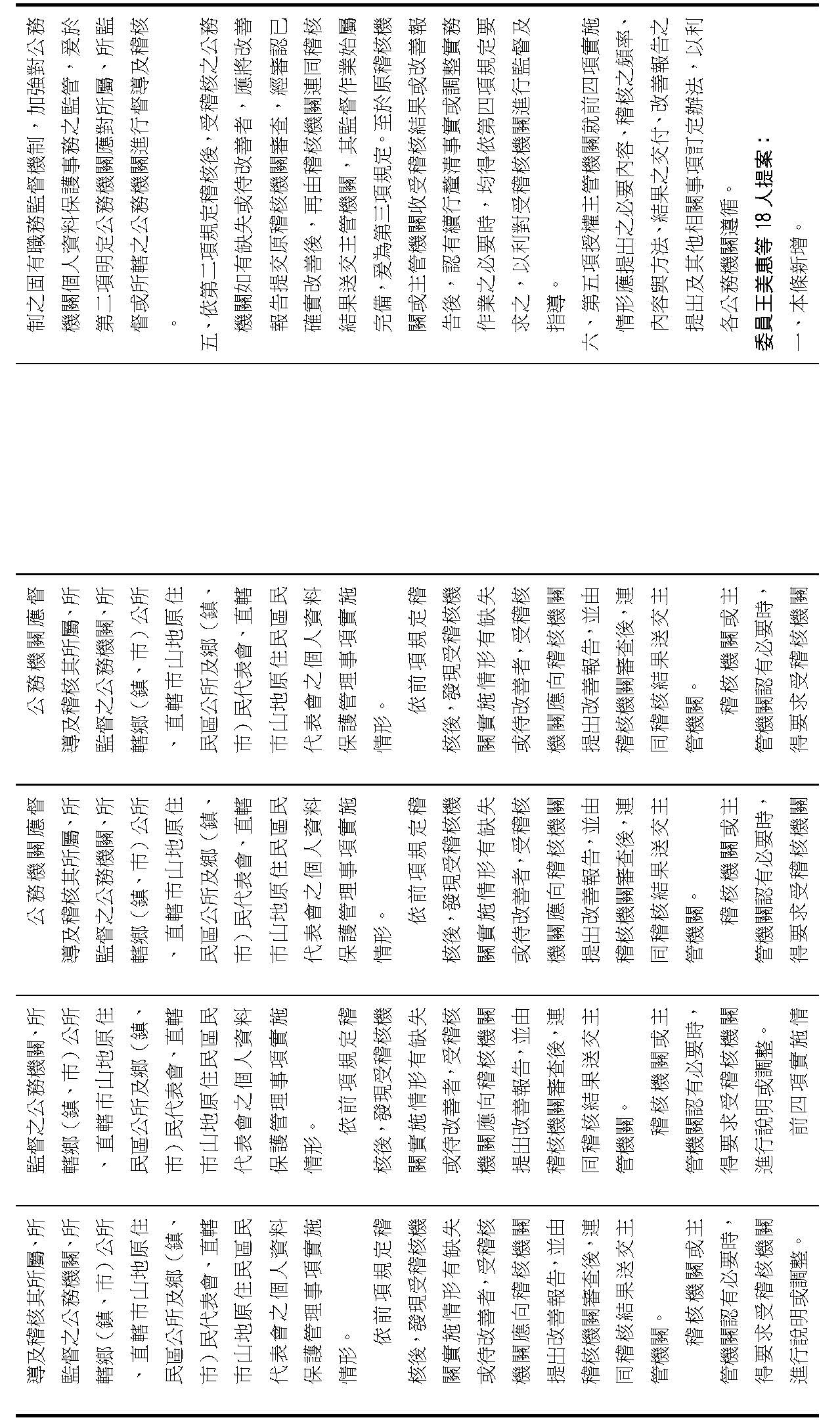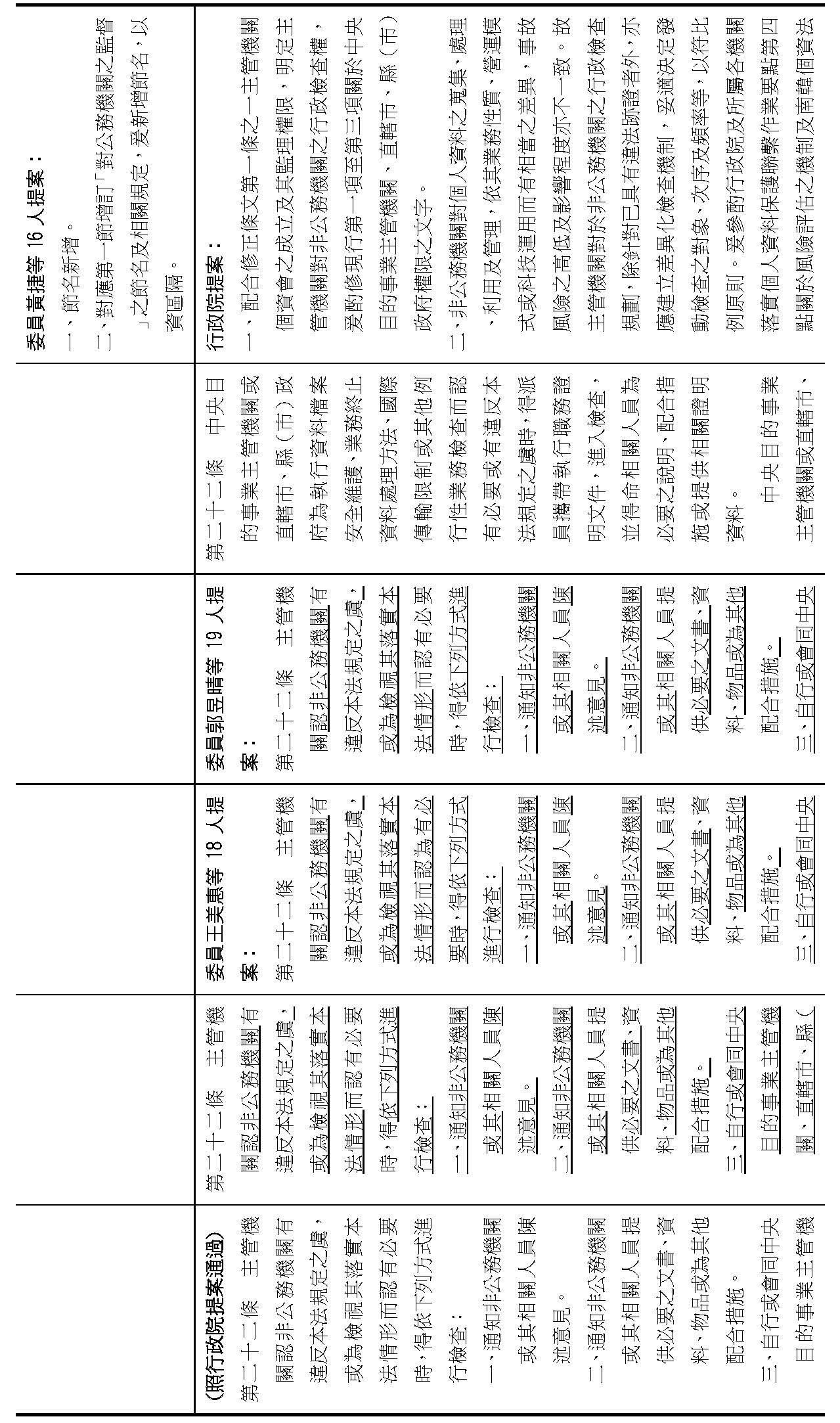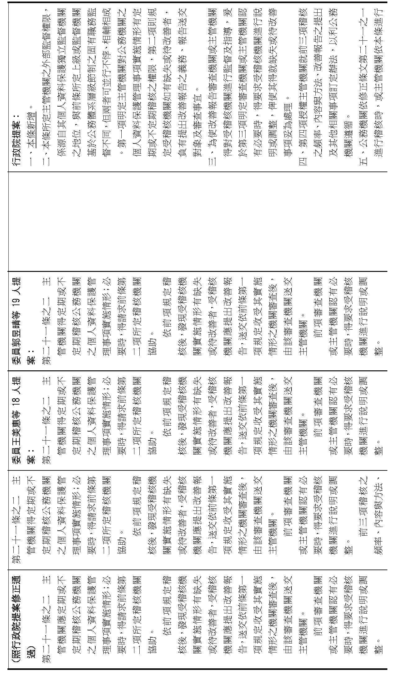 委員李坤城等16人擬具「個人資料保護法部分條文修正草案」第21條之2,第1項明定主管機關應「每2年」對公務機關辦理稽核。委員王美惠等18人擬具「個人資料保護法部分條文修正草案」第21條之4則規定,公務機關未依個資會命令限期改正者,個資會「應」公布其名稱及違法情節。