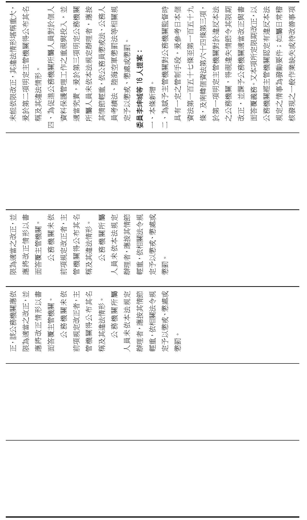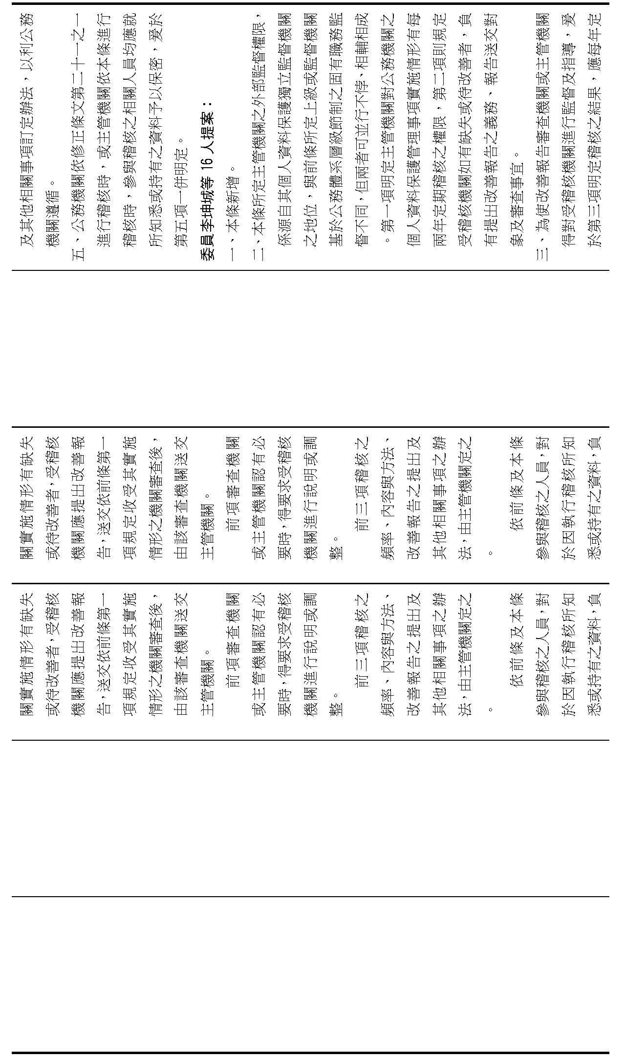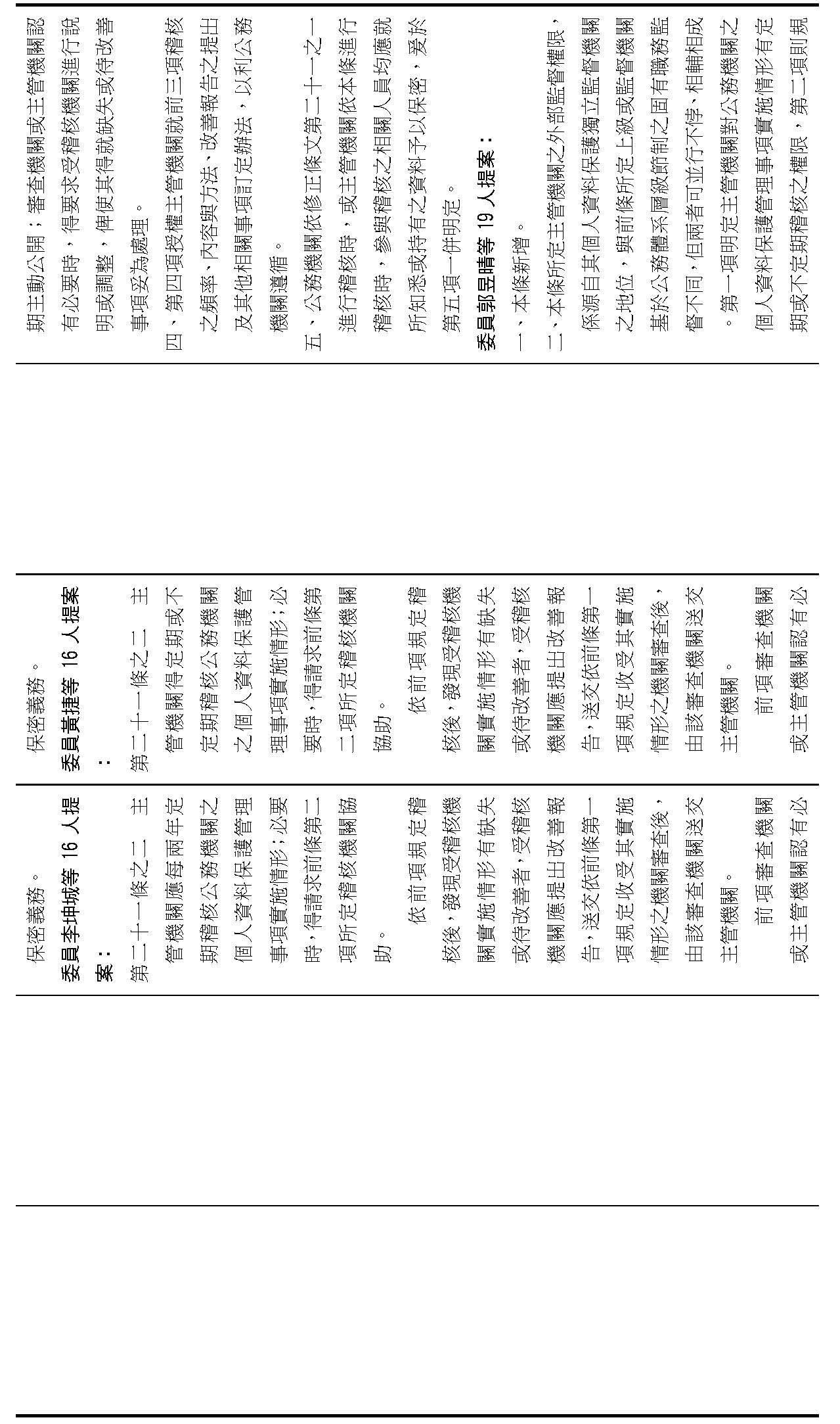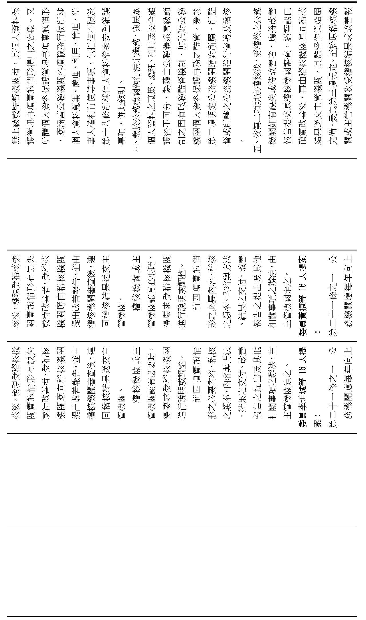 委員李坤城等16人擬具「個人資料保護法部分條文修正草案」第21條之2,第1項明定主管機關應「每2年」對公務機關辦理稽核。委員王美惠等18人擬具「個人資料保護法部分條文修正草案」第21條之4則規定,公務機關未依個資會命令限期改正者,個資會「應」公布其名稱及違法情節。