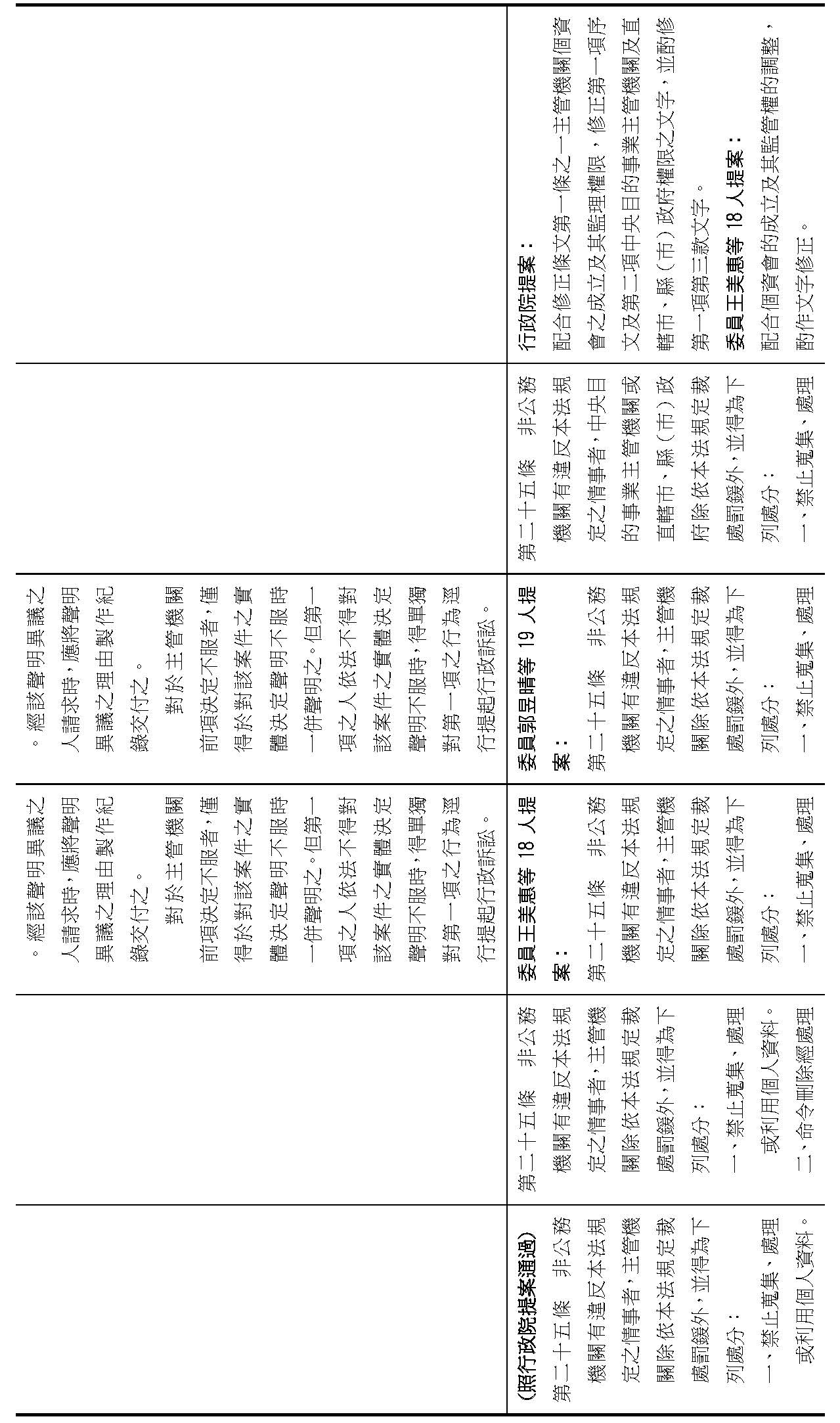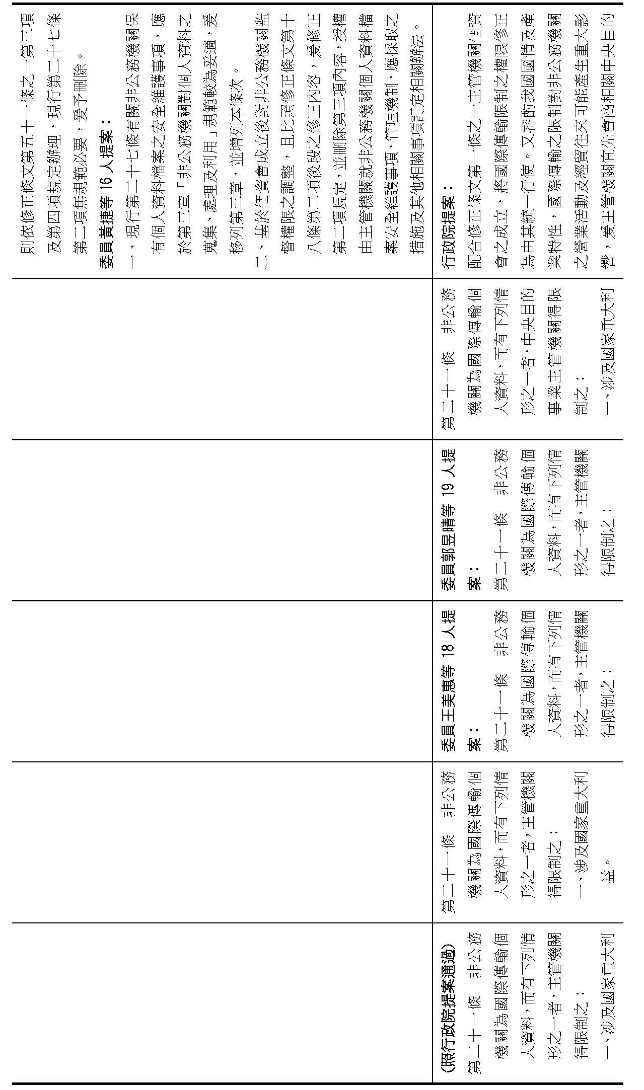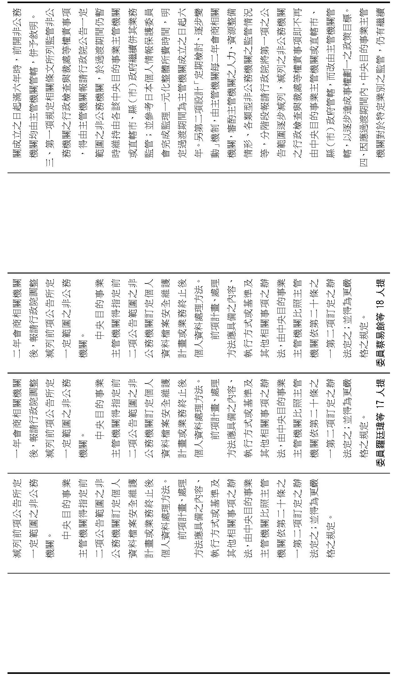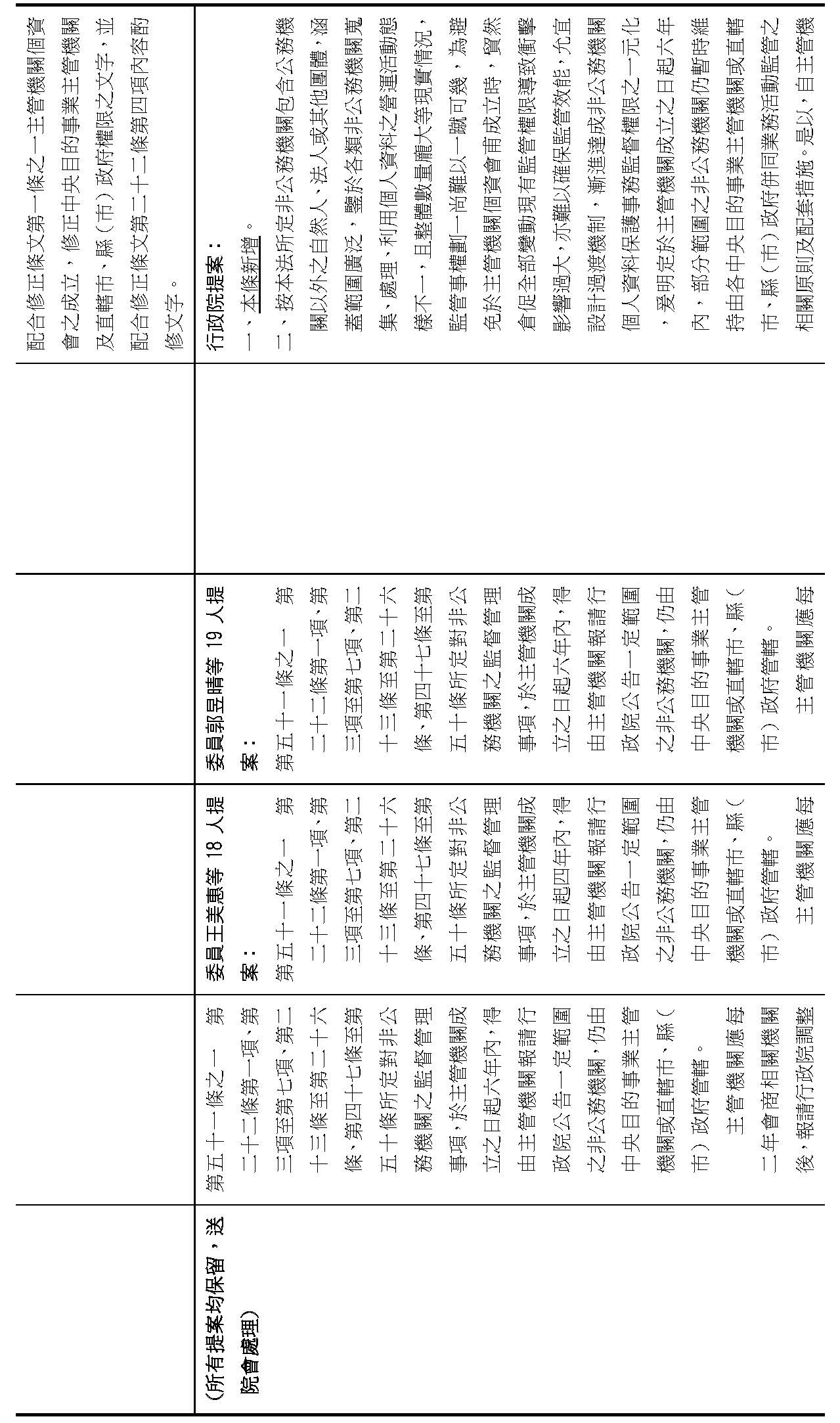 委員王美惠等18人擬具「個人資料保護法部分條文修正草案」第51條之1規定,過渡期間總長為「4年」,並應「每1年」報請行政院檢討減列。委員羅廷瑋等17人擬具「個人資料保護法部分條文修正草案」第51條之1則規定,過渡期間總長為「5年」。