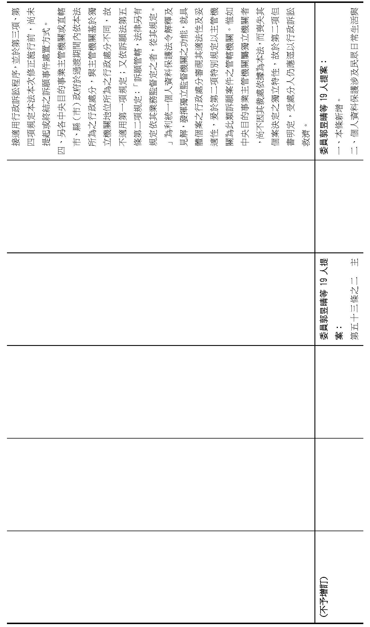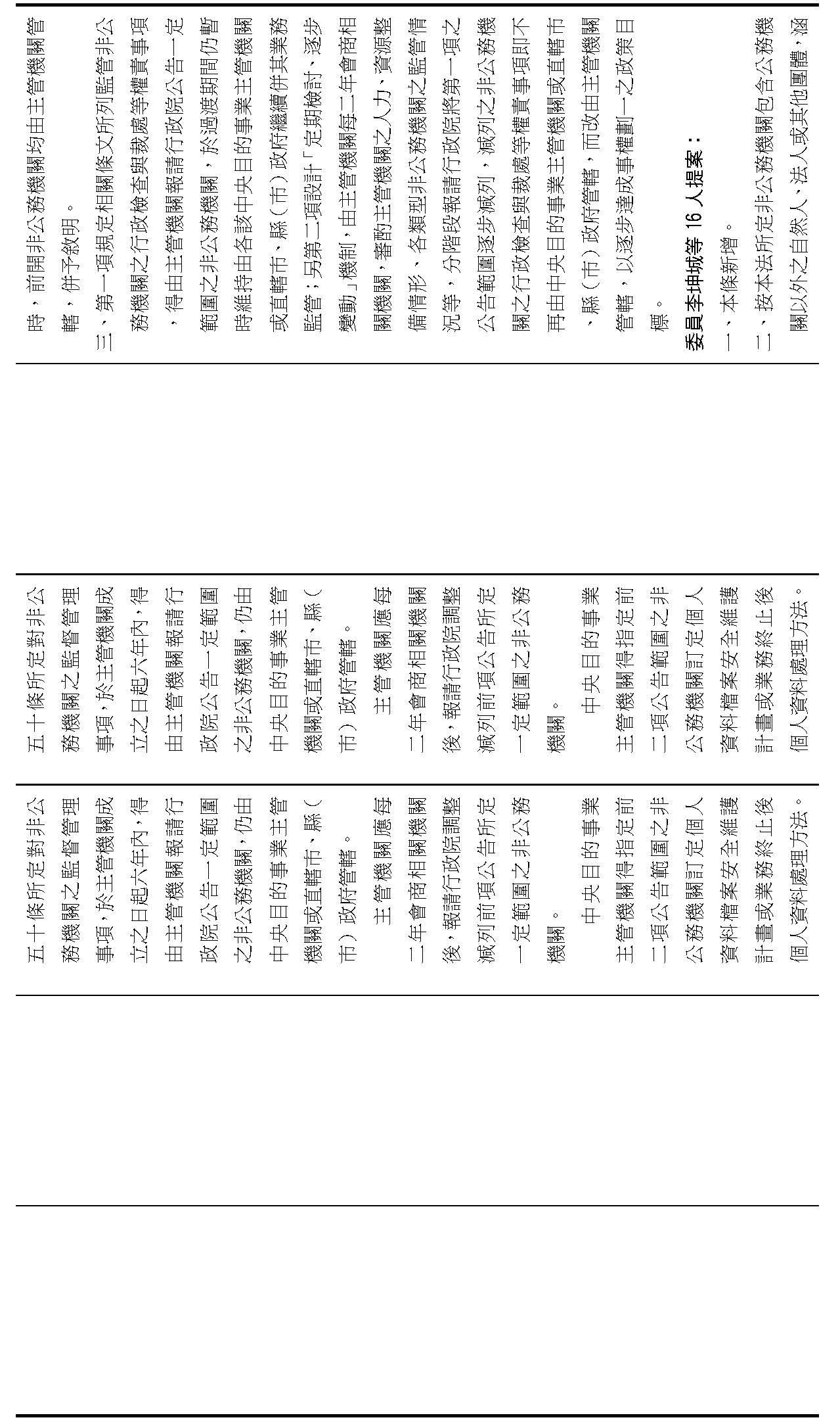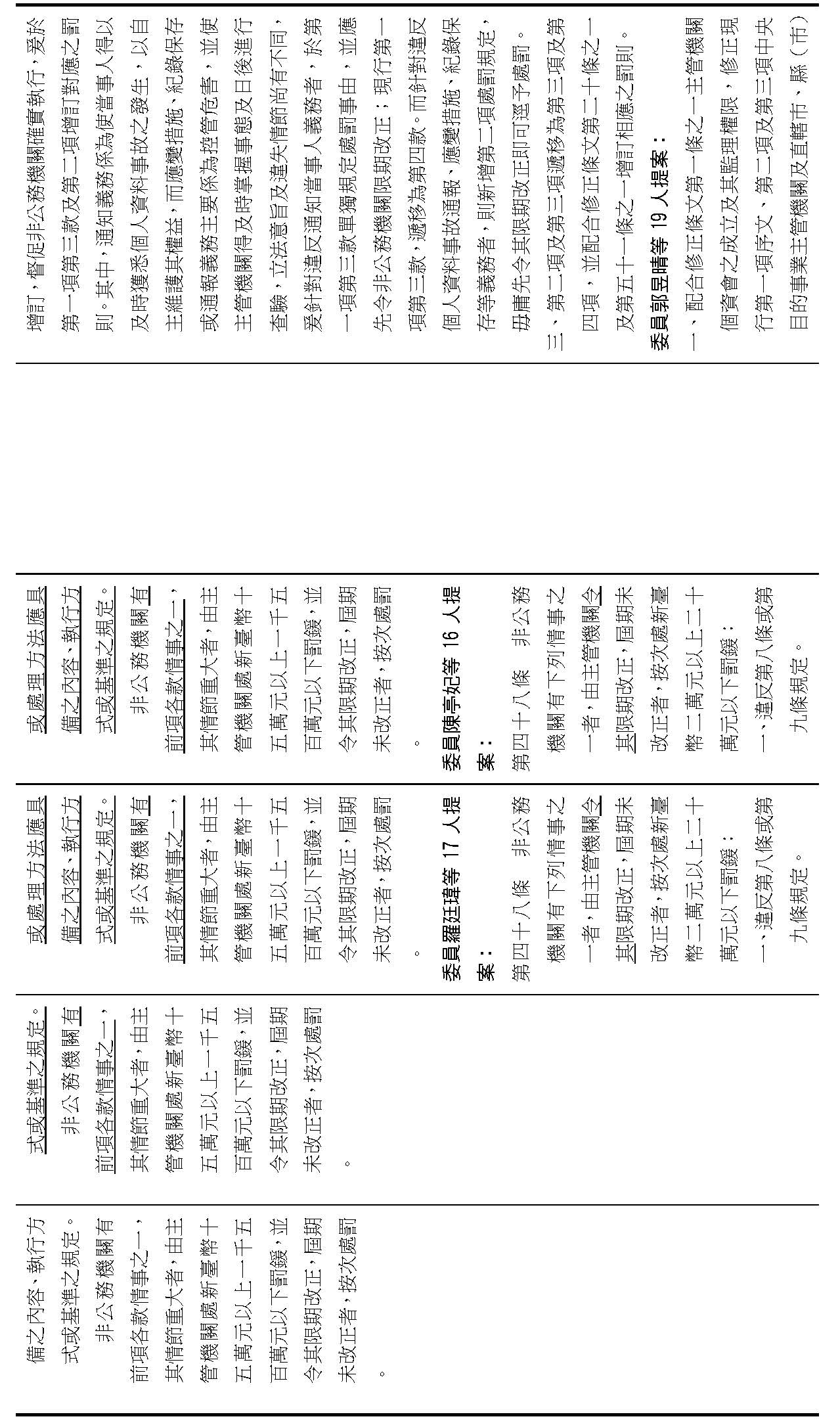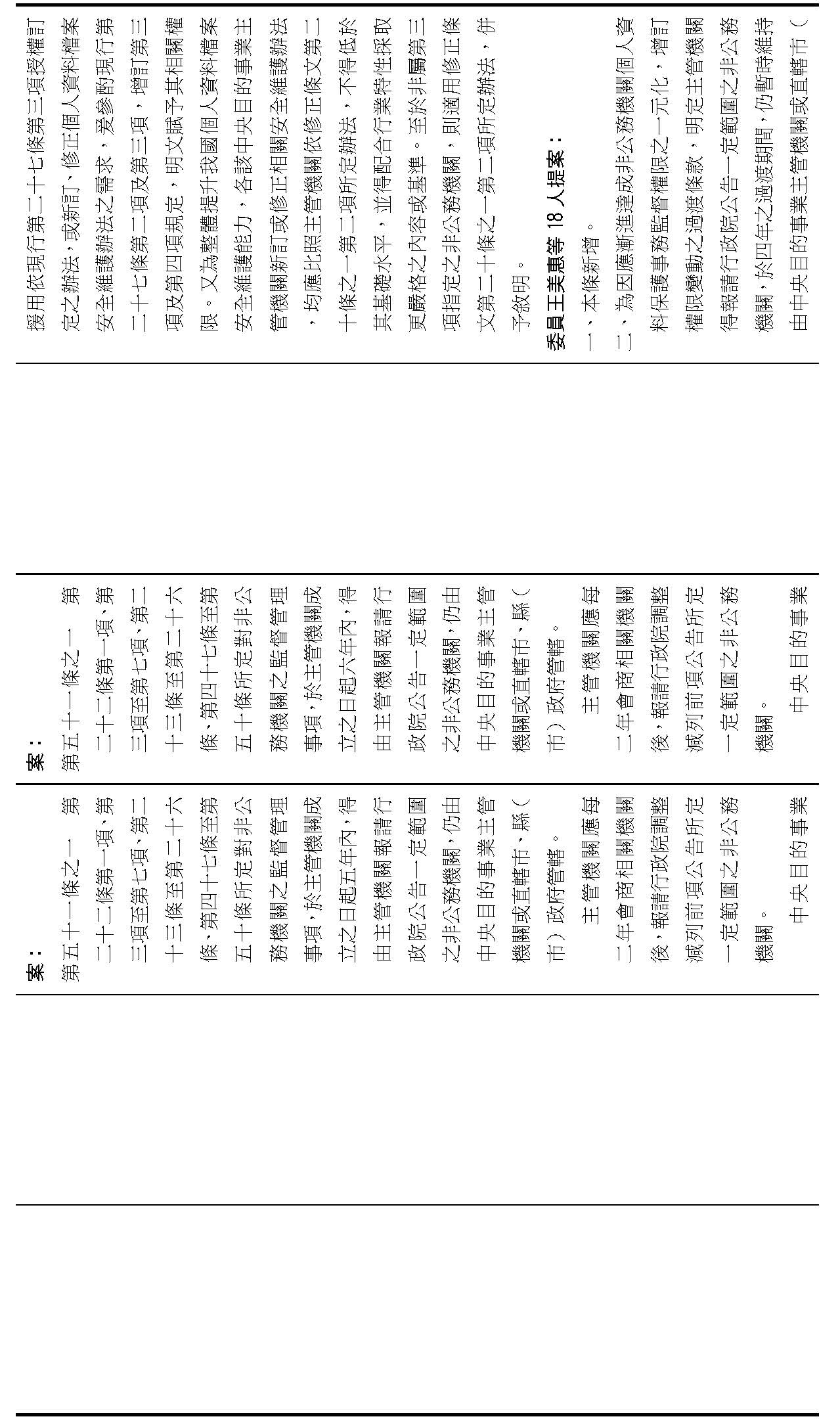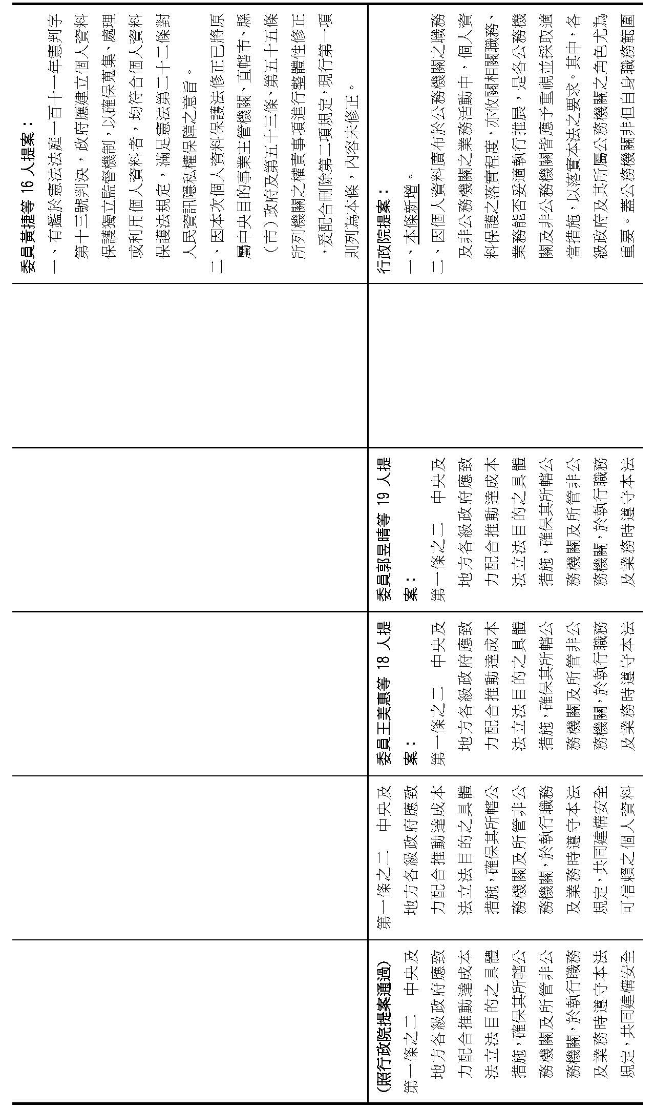 委員王美惠等18人擬具「個人資料保護法部分條文修正草案」第51條之1規定,過渡期間總長為「4年」,並應「每1年」報請行政院檢討減列。委員羅廷瑋等17人擬具「個人資料保護法部分條文修正草案」第51條之1則規定,過渡期間總長為「5年」。