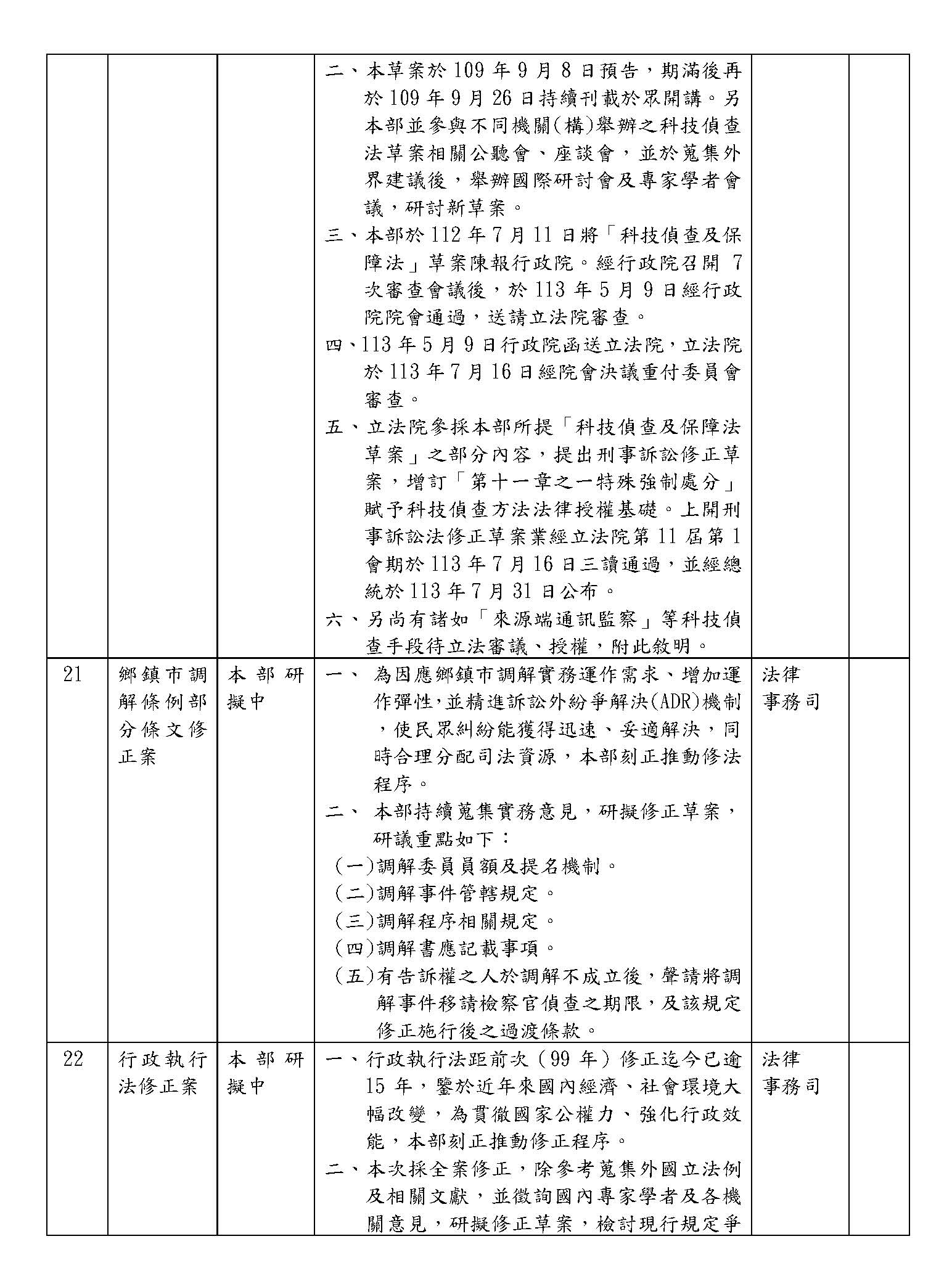 一、落實五打七安政策,強化社會安全:(一)本部依據總統「國家希望工程」治國藍圖,遵循行政院施政方針及行動創新施政理念,賡續落實五打七安政策。(二)執行綠能掃黑肅貪策略,建構防範綠能犯罪之機制,強力掃蕩妨害綠能產業犯罪。(三)推動新世代反毒策略行動綱領,執行第12波「安居緝毒專案」及「0917查緝施用大麻黑數專案」,強化公私協力與全民參與之力道,有效減少阻礙毒品成癮者復歸之因子,逐步達到抑制毒品再犯之目標。(四)落實打詐行動綱領,持續善用打詐四法,強化打詐能量,結合打詐國家團隊,公私協力全民攜手防詐。且臺高檢署推動「可疑帳戶預警中心」機制,成功攔阻含警示帳戶金額達七億三千餘萬元,填補被害人損害。(五)強化婦幼兒少保護及防制家庭暴力網絡,促請檢察官依法妥為強制處分、加強運用附條件命令等規定(六)研修「資恐防制法」,加強打擊資恐及資武擴行為。