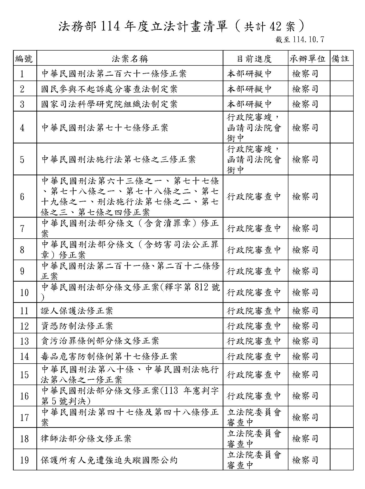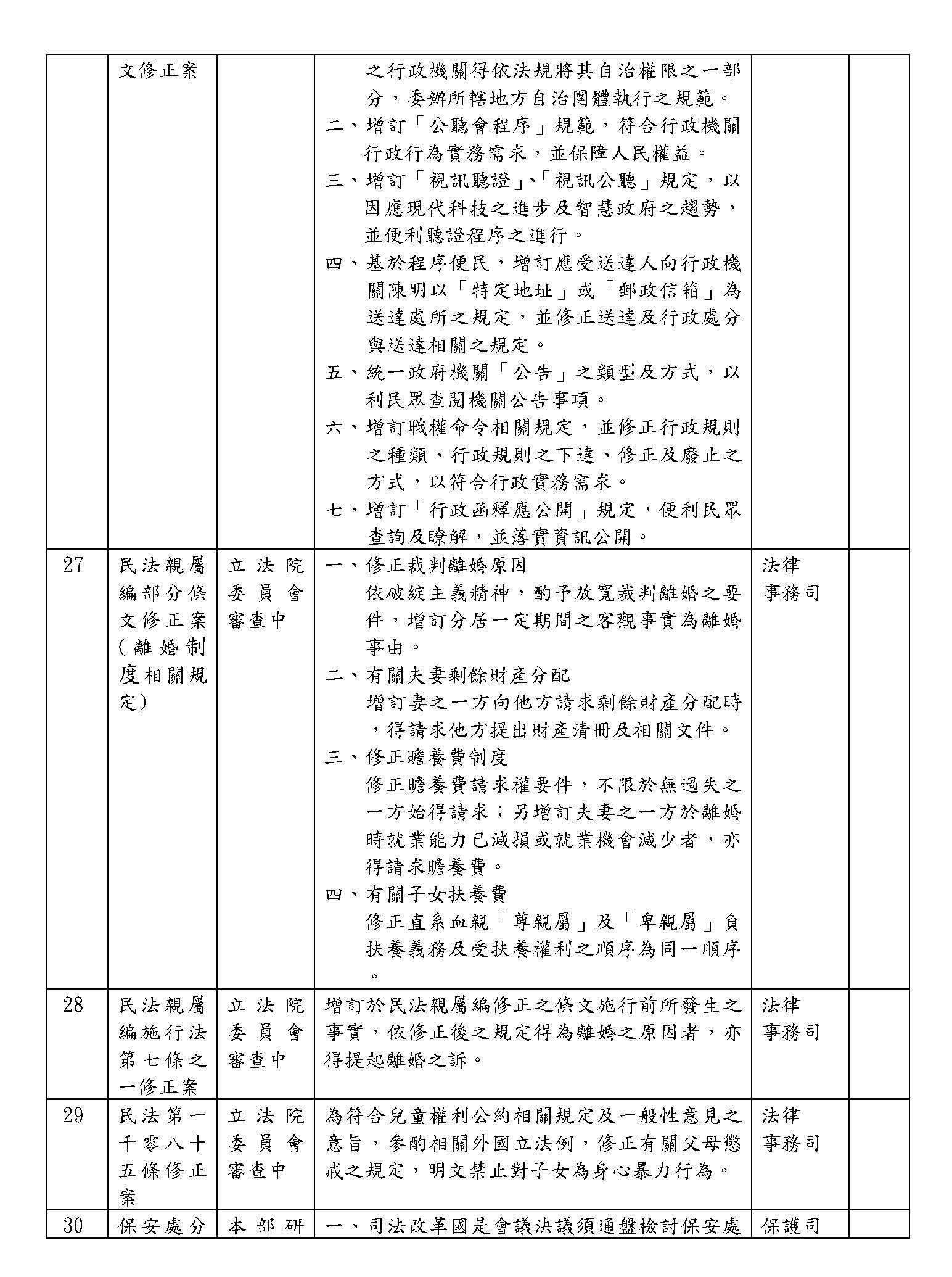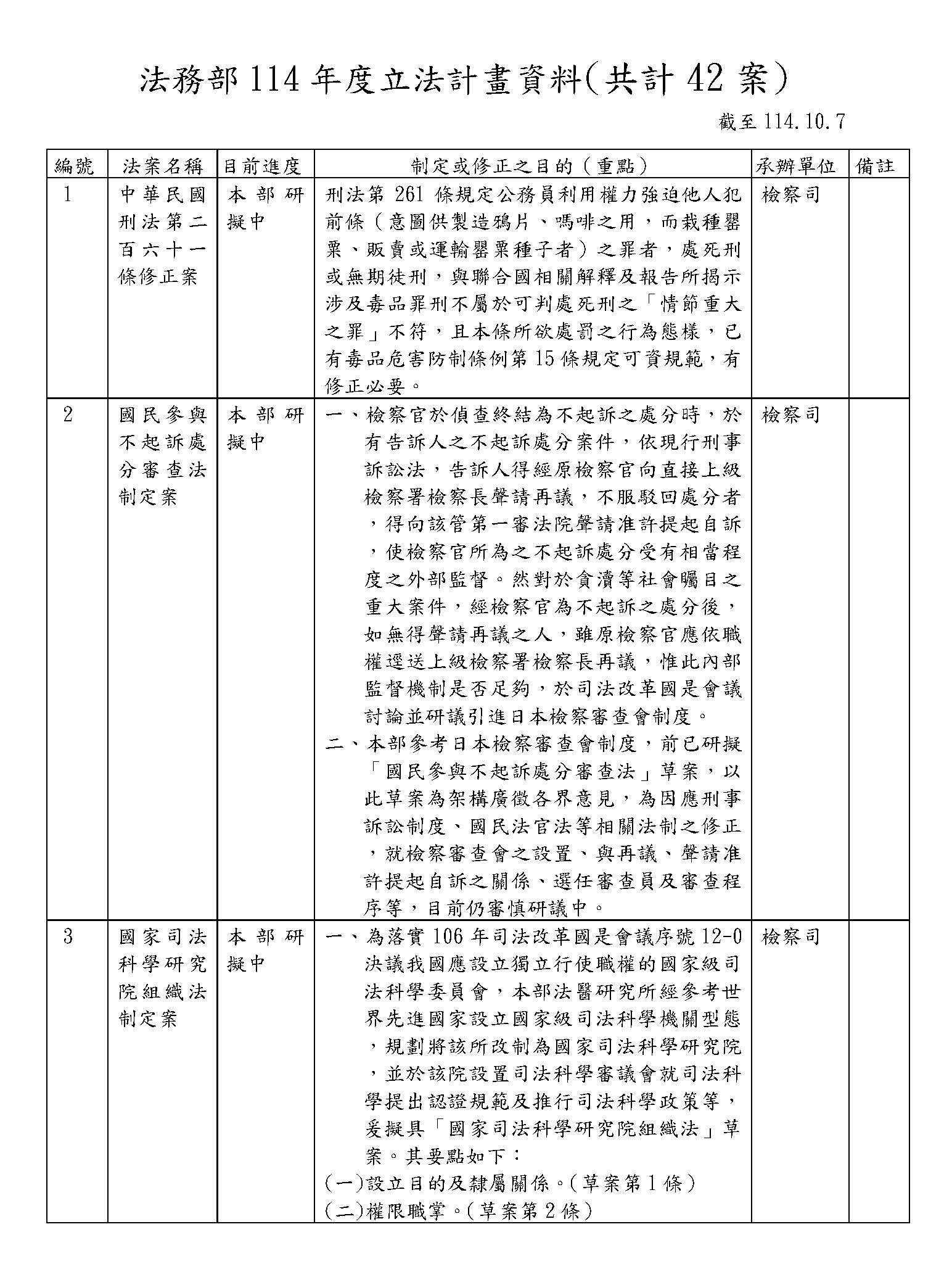 主席:這次的會議是排定週三跟週四兩天一次會,本日的議程是邀請法務部部長率所屬單位主管列席報告業務概況及立法計畫,並備質詢。