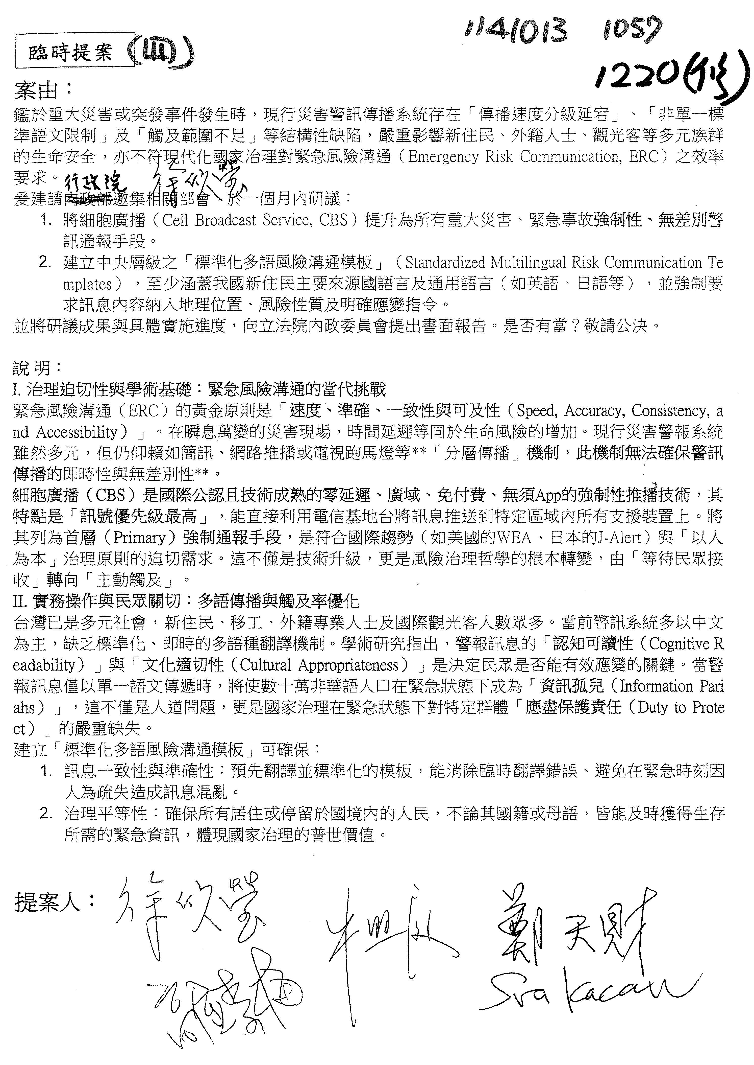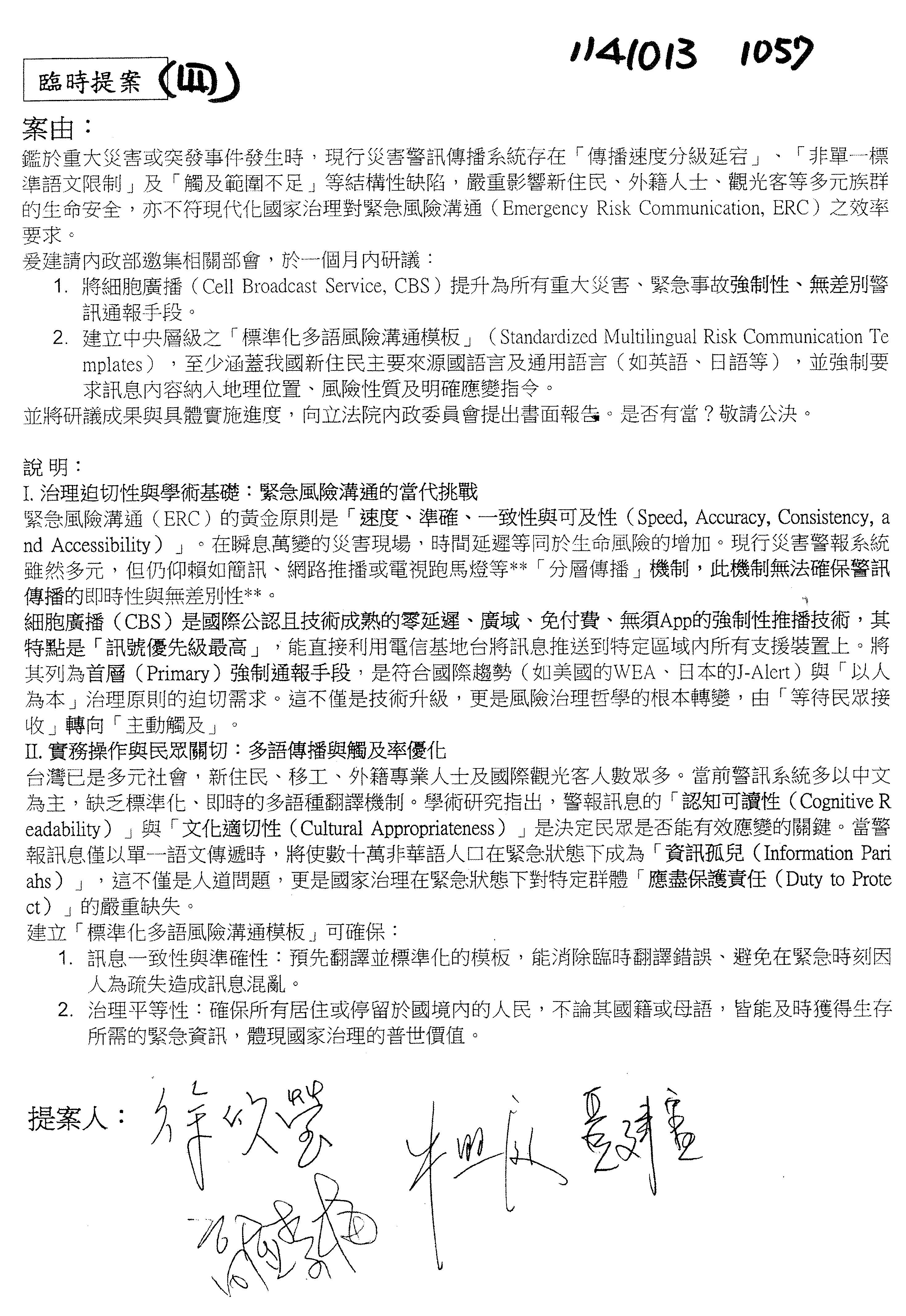 案由:本院翁曉玲委員,對於內政部、農業部、原民會所提出「堰塞湖監測、災害預警通報、疏散機制及災後復原重建」專題報告等議題,特於114年10月13日立法院第11屆第4會期內政委員會第3次全體委員會議,向內政部提出書面質詢。