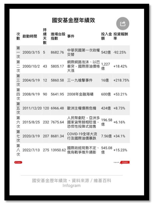 B.國安基金收益:另一隻國庫金雞母──「國安基金」,歷年績效七勝一敗。國安基金長年運作已有穩定盈餘,然而目前僅作為金融市場護盤之用,缺乏長期再投資機制。本席建議,國安基金年度結算後之盈餘一樣可提撥一定比例挹注主權基金,轉化為國家長期資產,兼顧金融穩定與財富累積。