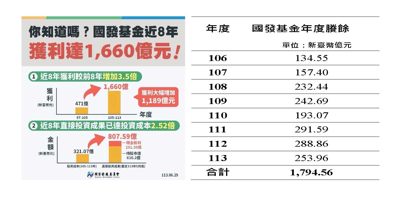 C.國發基金投資回收金:國發基金近八年獲利達1,794億元。國發基金多年投資累積可觀回收金,但目前僅回流國發基金本體。請教院長,是否可以評估將部分回收金挹注未來台灣主權基金,以形成長期穩定財源?讓產業投資收益成為國家永續財政的動能。