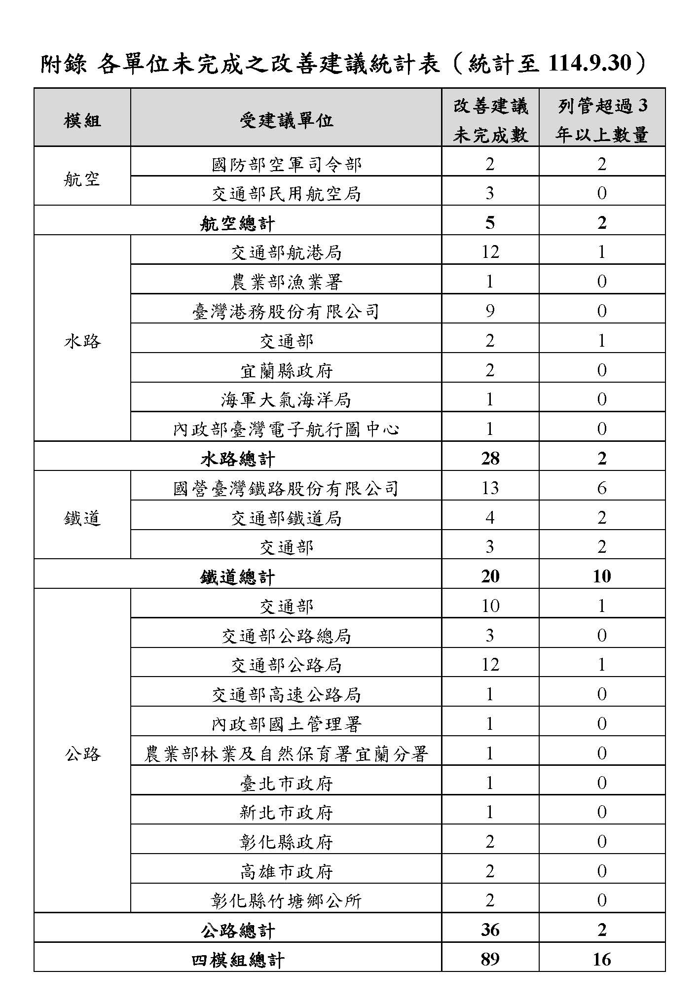 另列管超過3年尚未完成改善者計16項,本會已於今年3月邀集有關機關(構)瞭解原因,主要係相關執行計畫涉及法規標準修正與系統設施工程,爰所需時間較長,已要求各機關儘速完成改善。