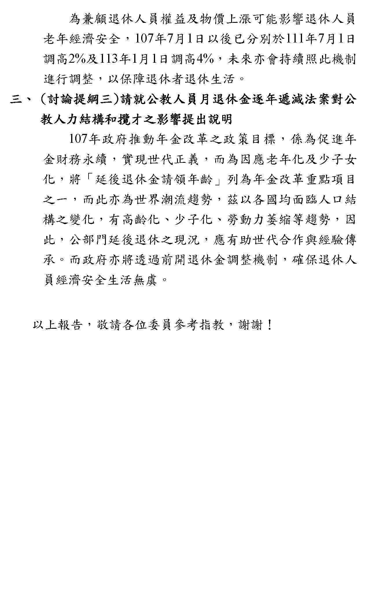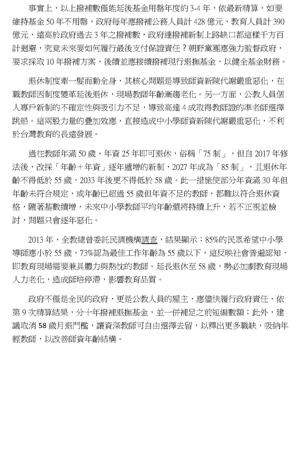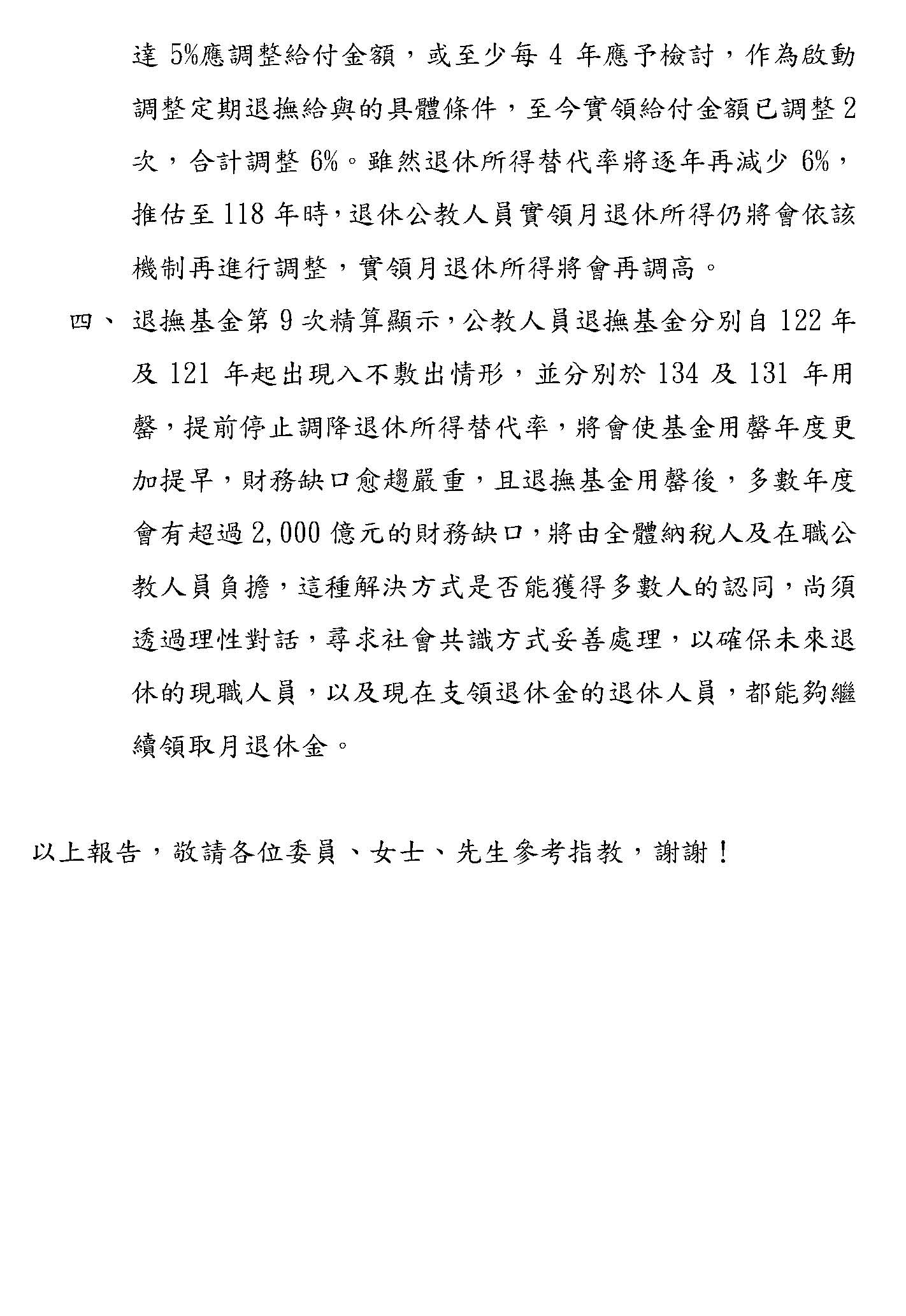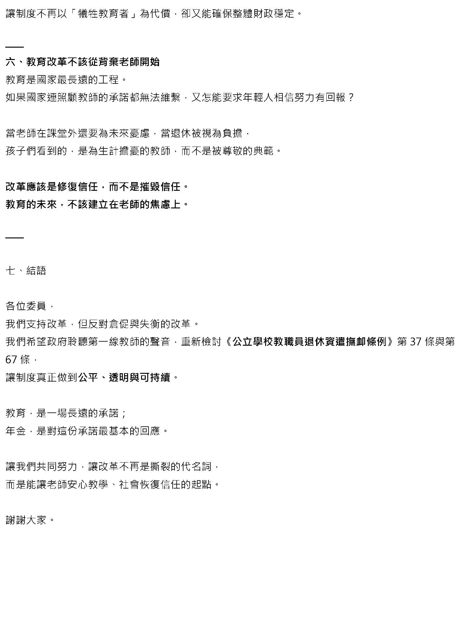 最後,本席要呼籲,各界應該要正視我們修法的訴求,不是停止砍削所得替代率,或者是建立即時與物價指數或調薪連動的調整性機制,而是針對現實困境所提出的具體修補方案,敬請各位與會的代表與社會大眾來理解,我們捍衛退休公教人員權益的立場。此次修法是為臺灣的教育體系與公職人員爭取一個穩定可信的退休保障基礎,謝謝。