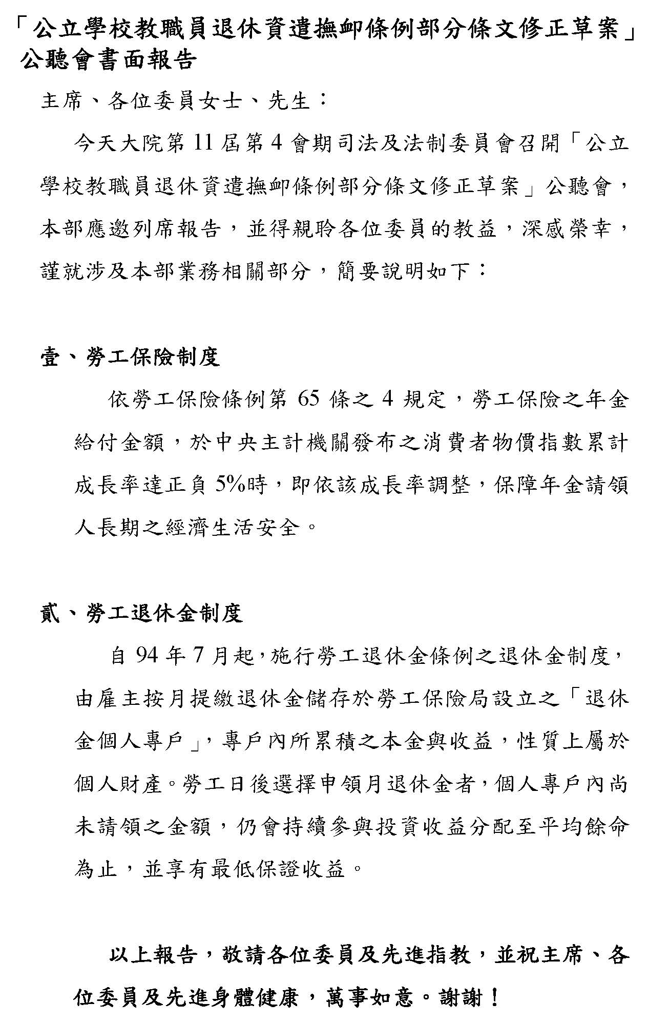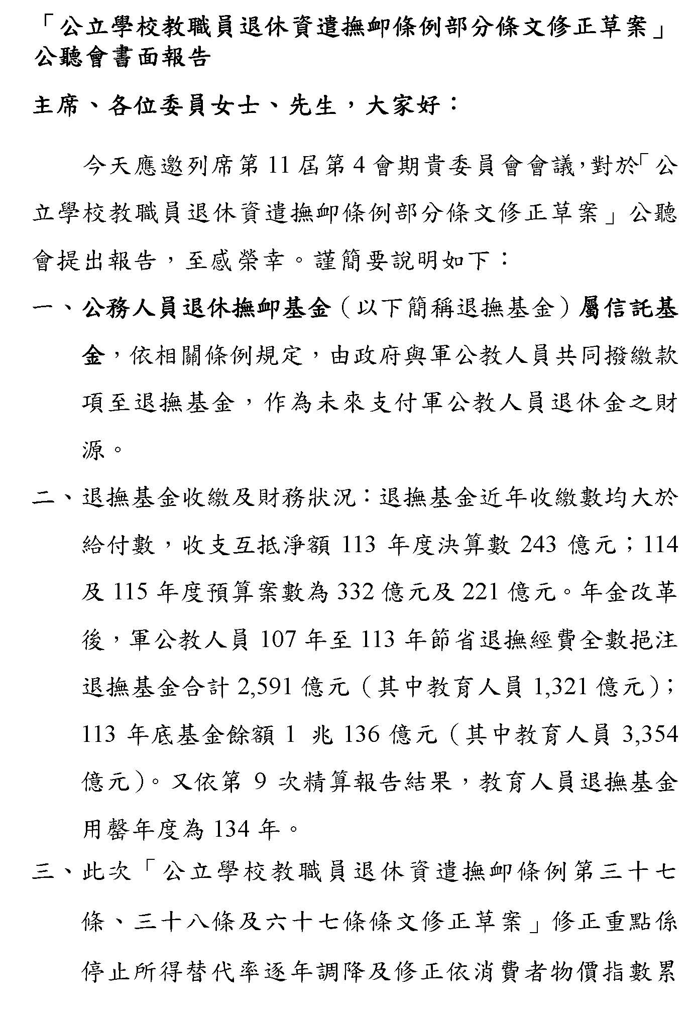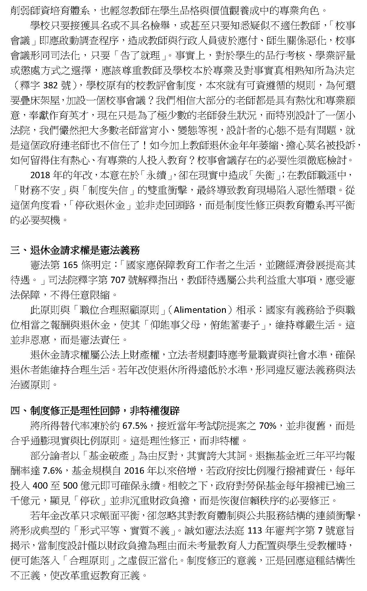 最後,本席要呼籲,各界應該要正視我們修法的訴求,不是停止砍削所得替代率,或者是建立即時與物價指數或調薪連動的調整性機制,而是針對現實困境所提出的具體修補方案,敬請各位與會的代表與社會大眾來理解,我們捍衛退休公教人員權益的立場。此次修法是為臺灣的教育體系與公職人員爭取一個穩定可信的退休保障基礎,謝謝。
