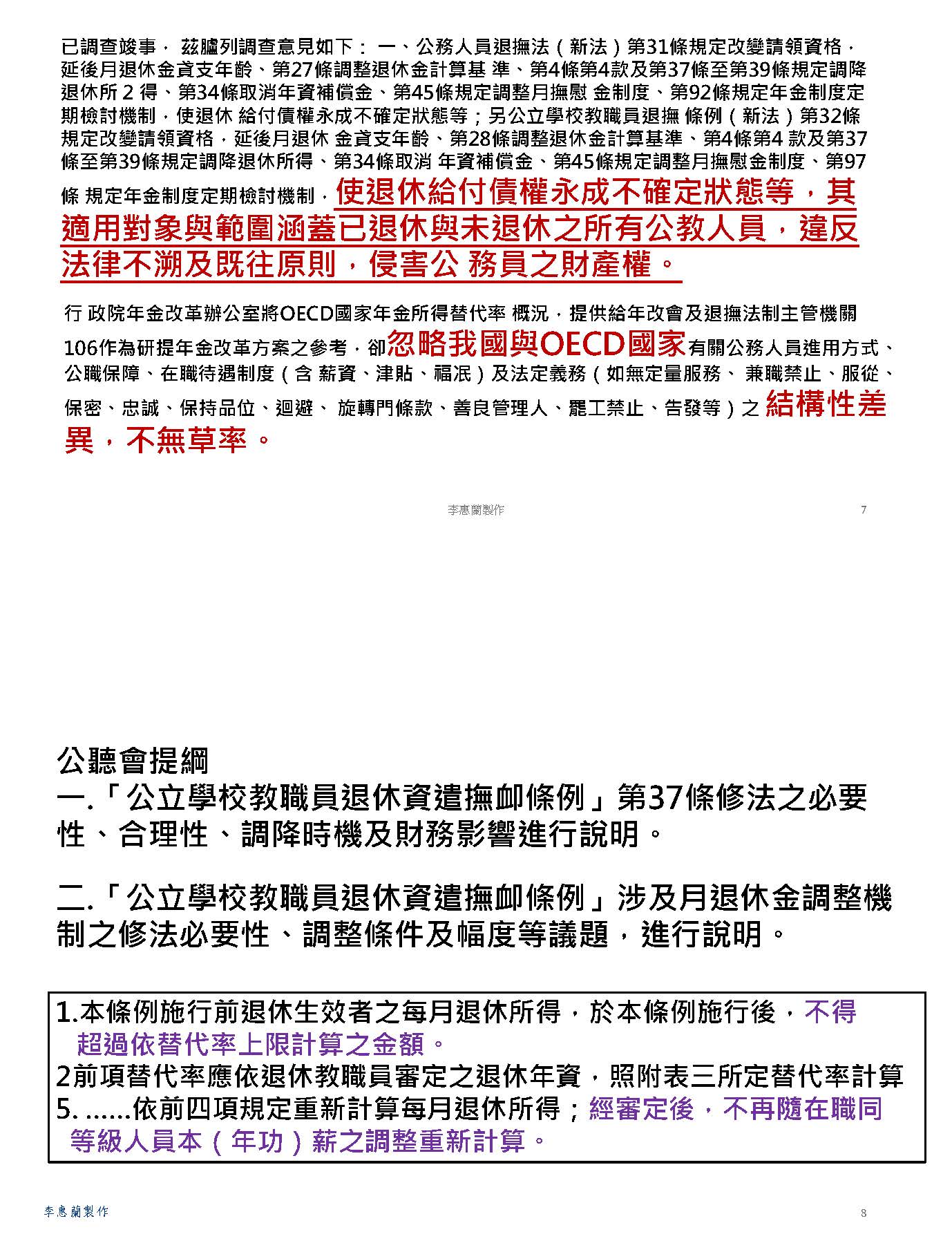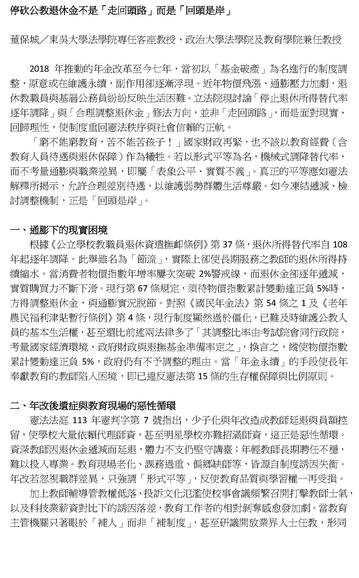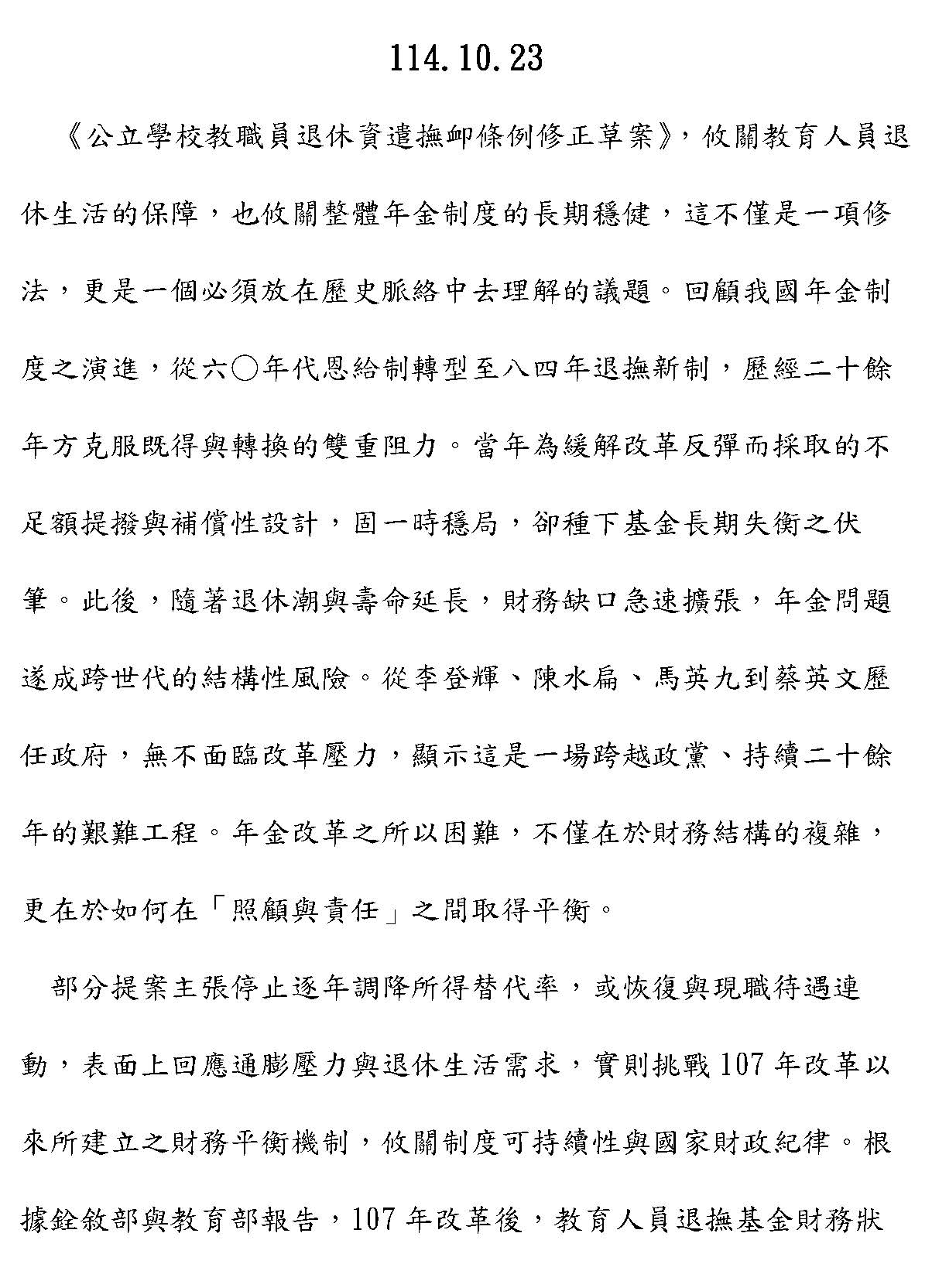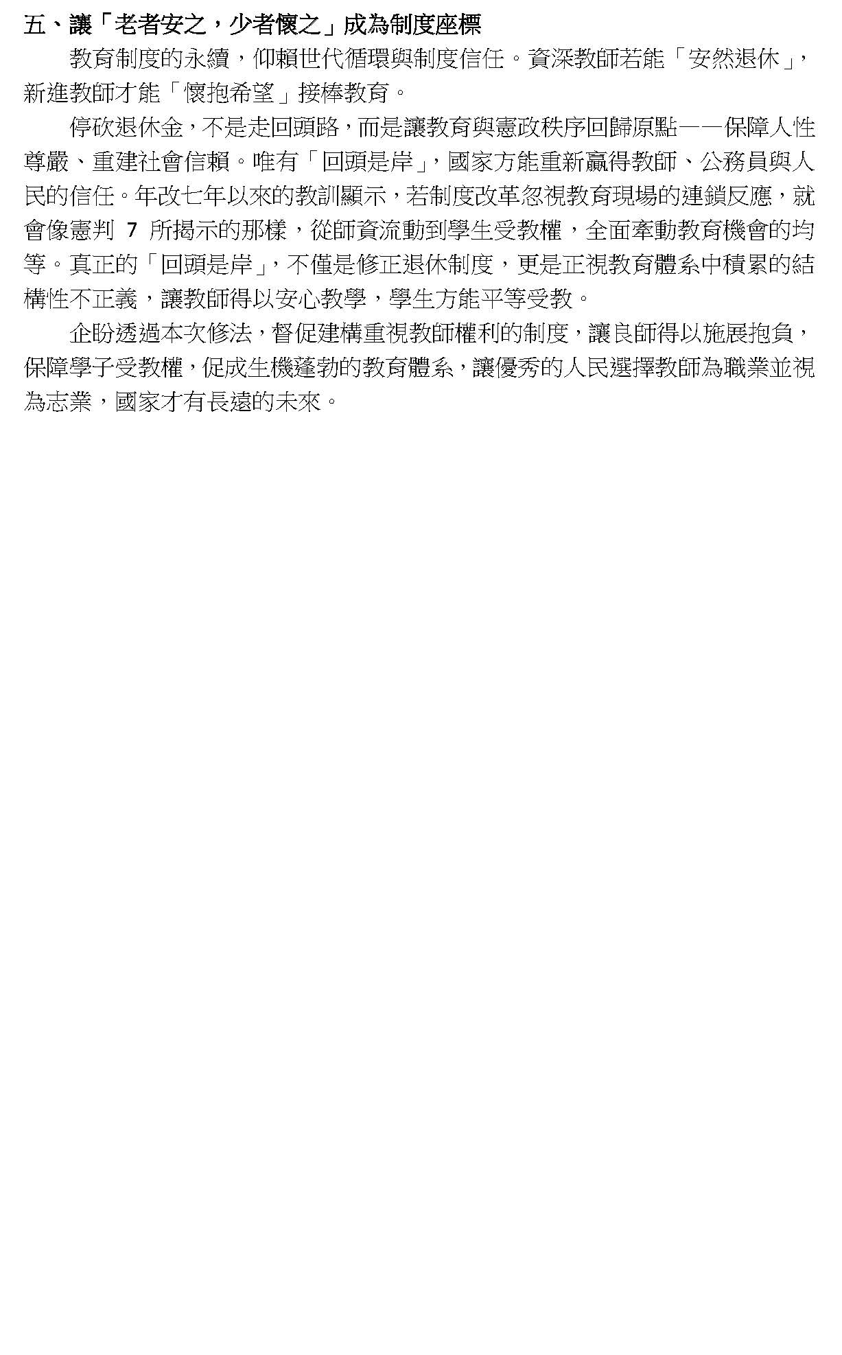 最後,本席要呼籲,各界應該要正視我們修法的訴求,不是停止砍削所得替代率,或者是建立即時與物價指數或調薪連動的調整性機制,而是針對現實困境所提出的具體修補方案,敬請各位與會的代表與社會大眾來理解,我們捍衛退休公教人員權益的立場。此次修法是為臺灣的教育體系與公職人員爭取一個穩定可信的退休保障基礎,謝謝。