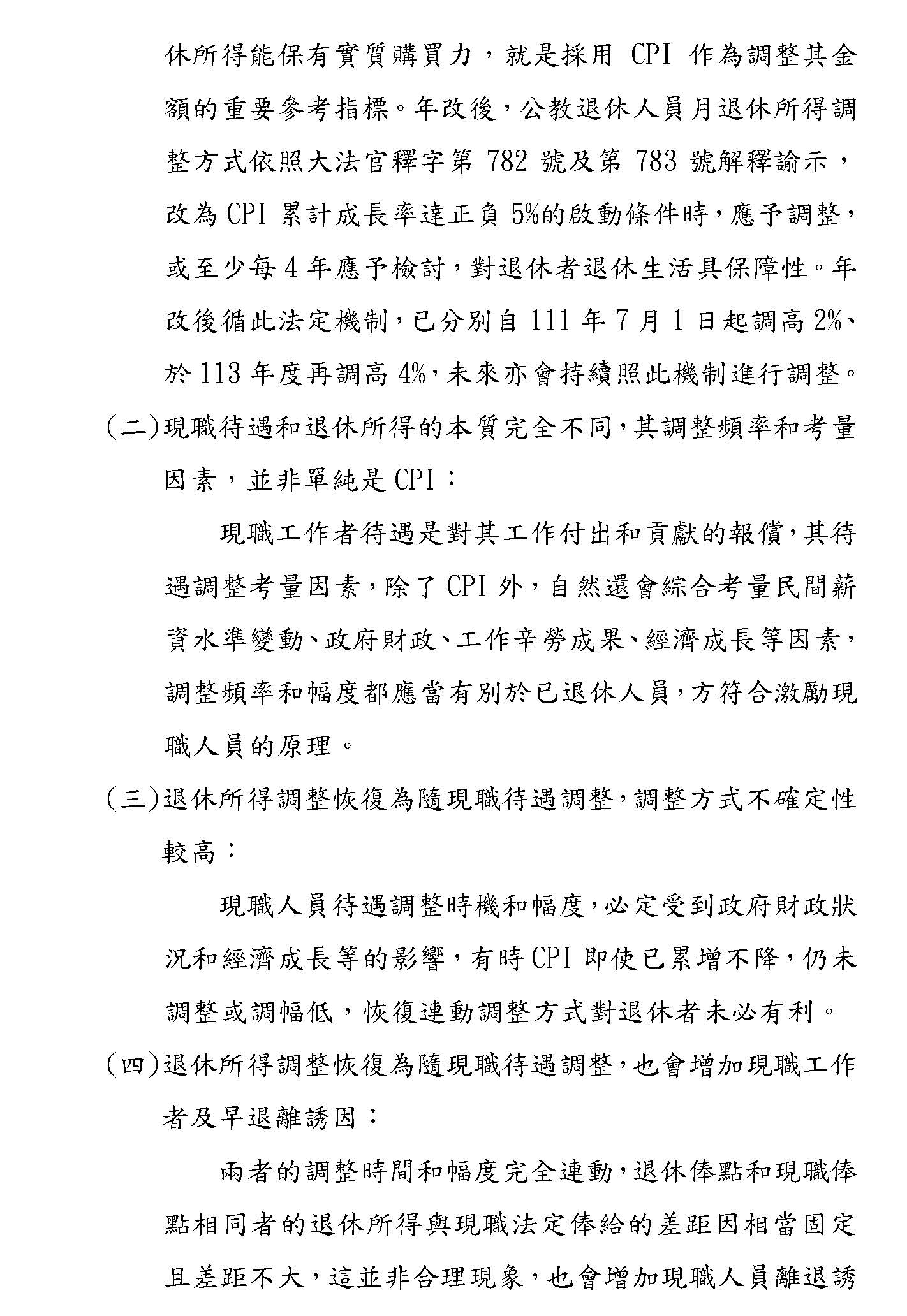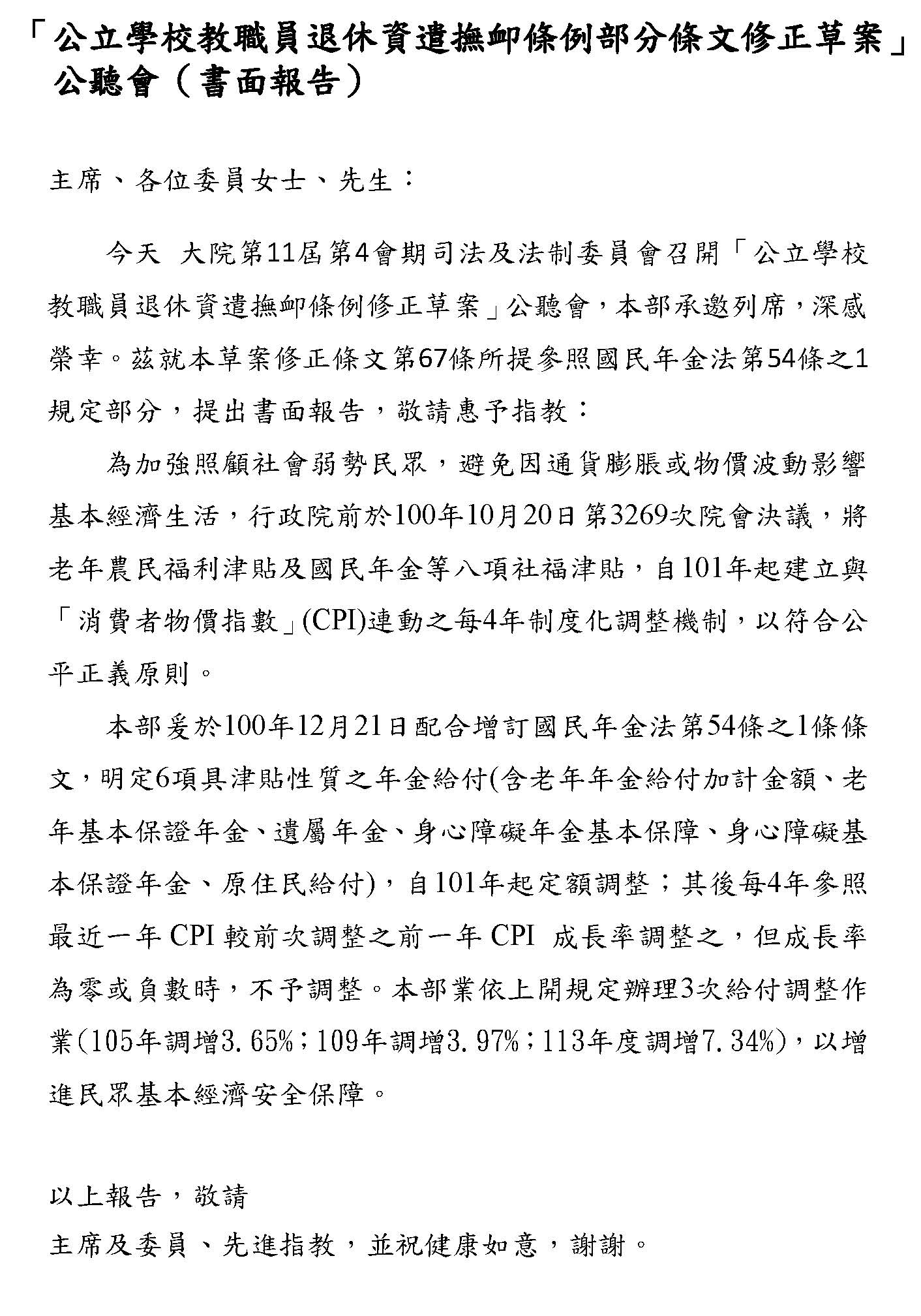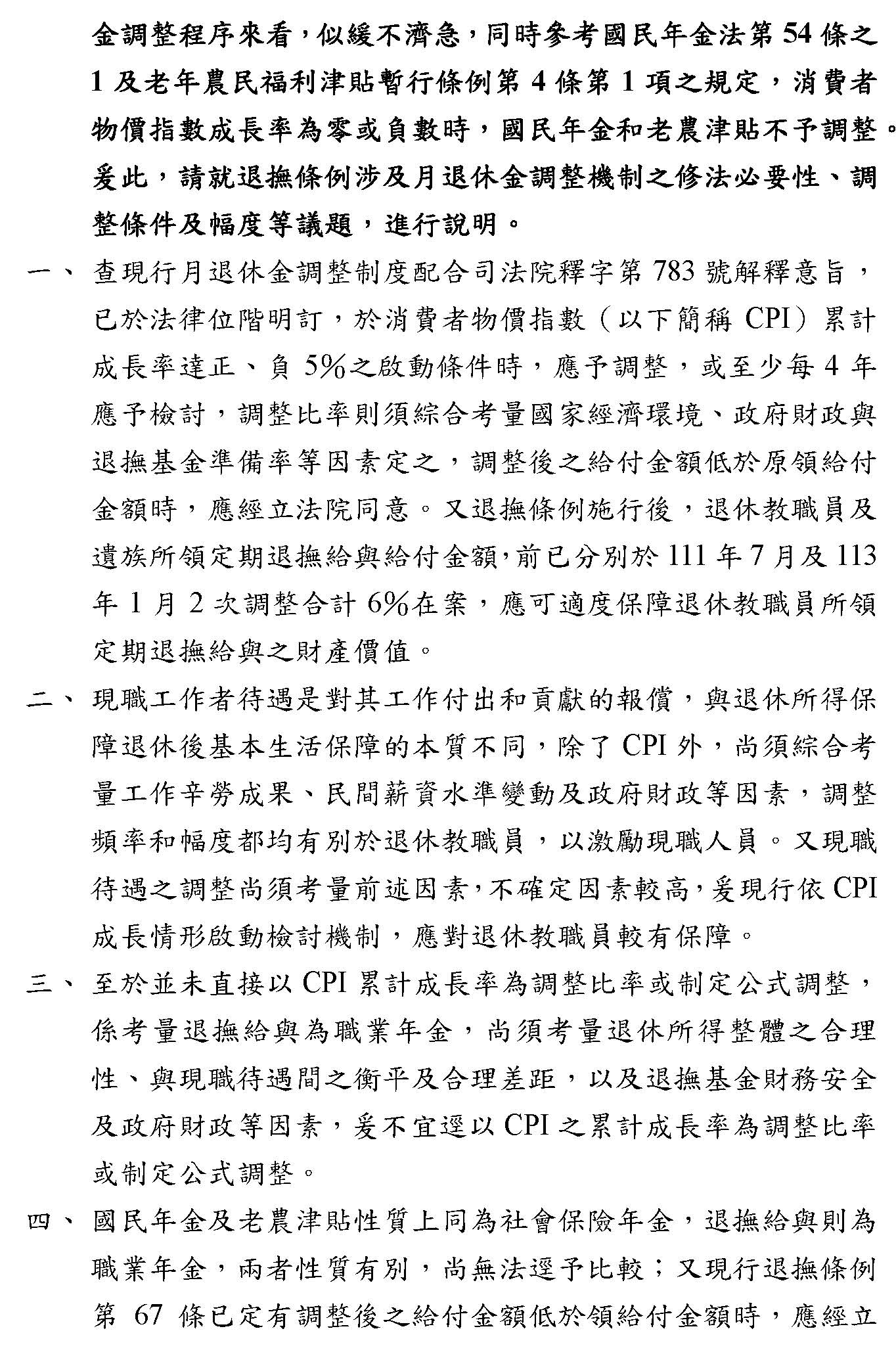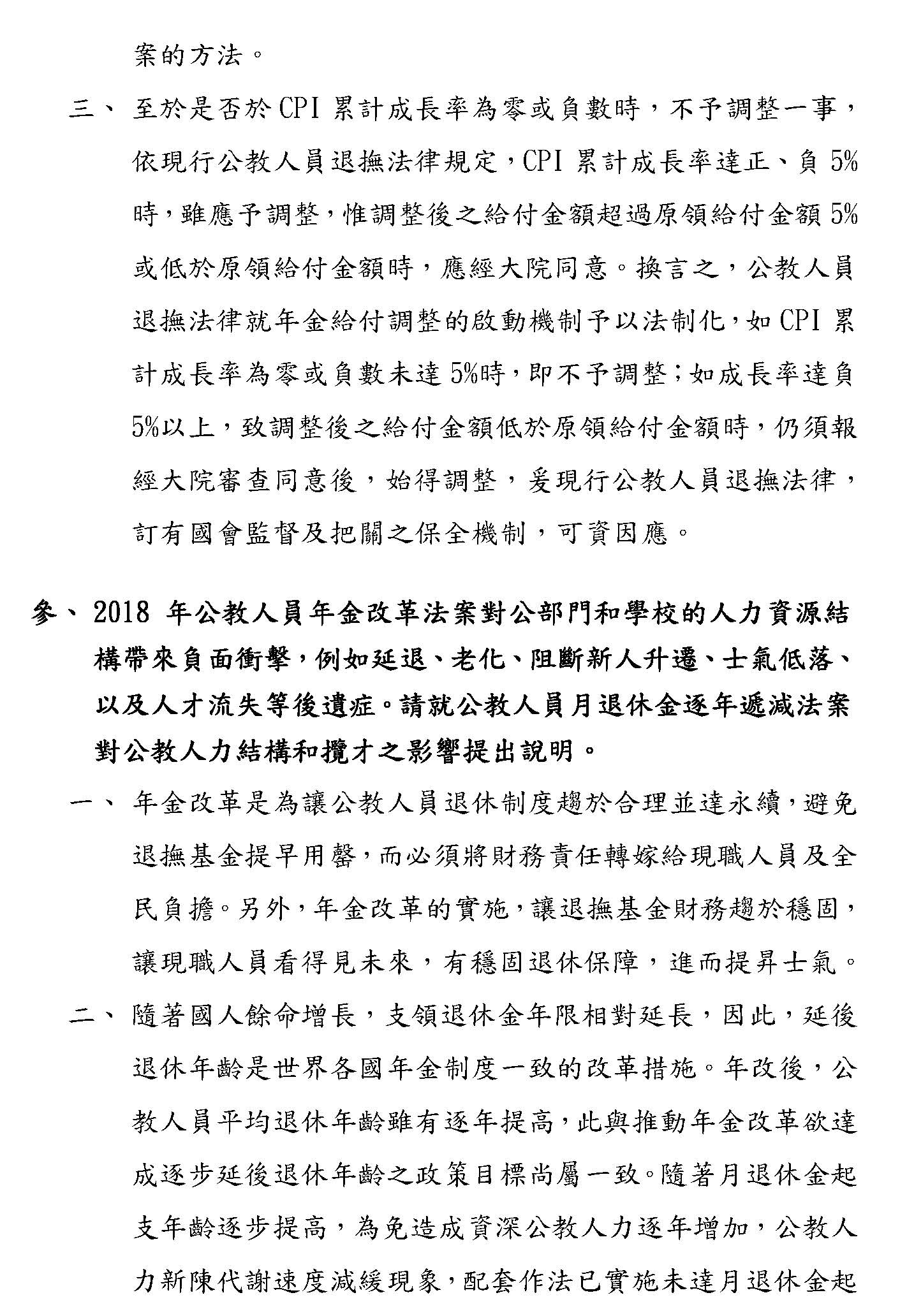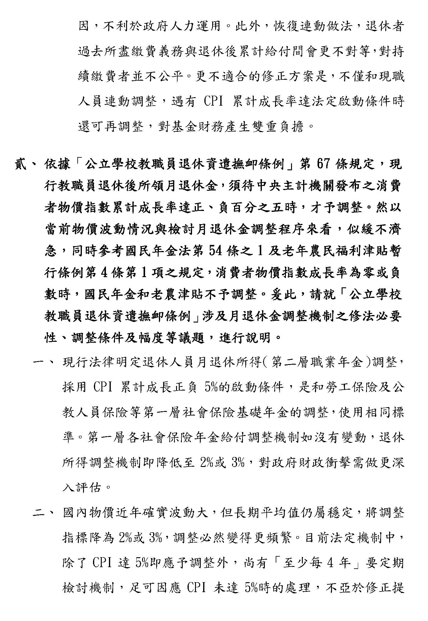 其他像隨CPI調整的部分,確實最近大家都對這個很關注,我們部裡面的立場只是想,因為畢竟隨CPI調整在國內各個職域都是先採5%,假設真的要調整,我們也希望要做一致性的,譬如我們主管的公保也是用5%,如果退休金先調了,這些都要連動考慮的,所以這個都可以調,大家可以就這個部分再做深入的討論,之後我們希望在逐條的時候,大家都可以理性好好地看待這個制度,我們最終的目的,以我當司長的角度來想,我們真的只是為了要守護這個制度而已,謝謝。