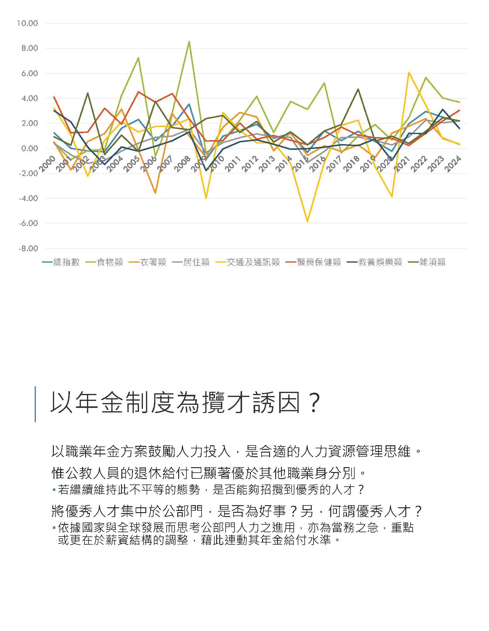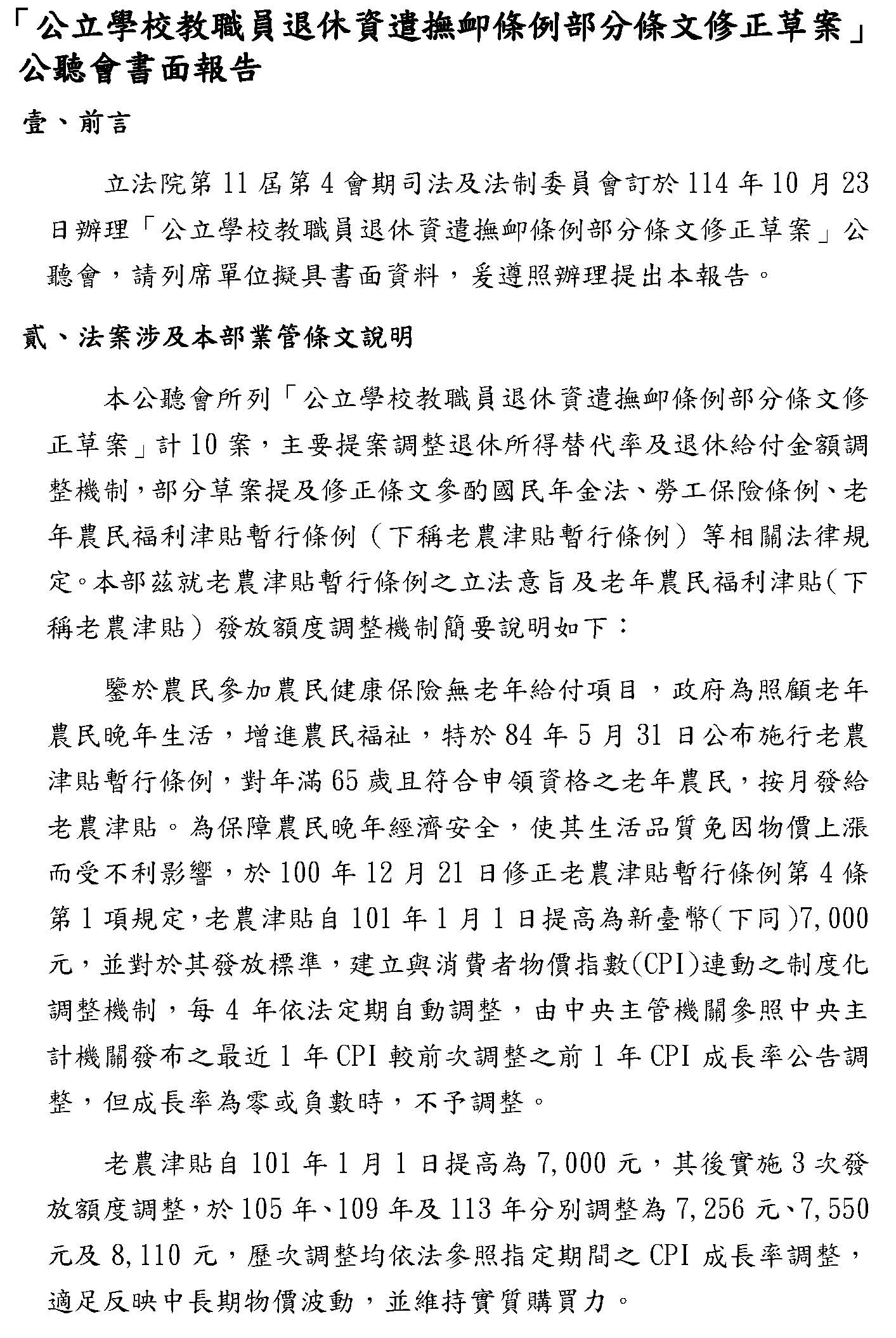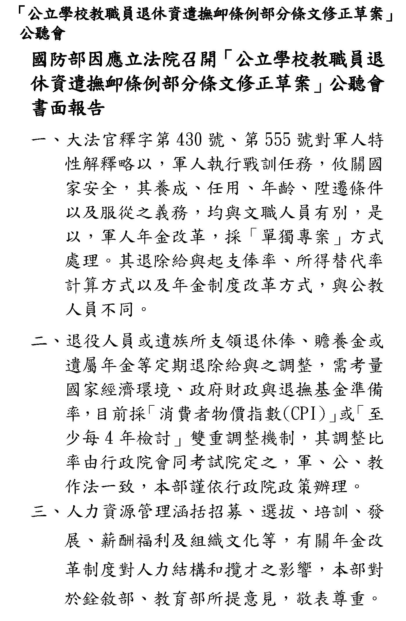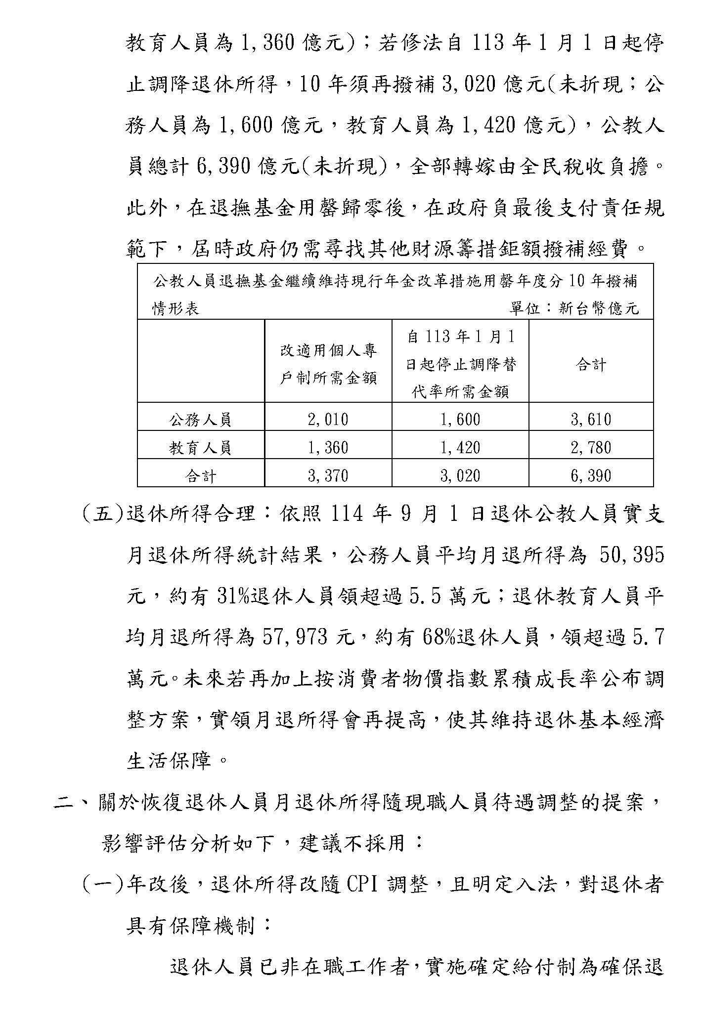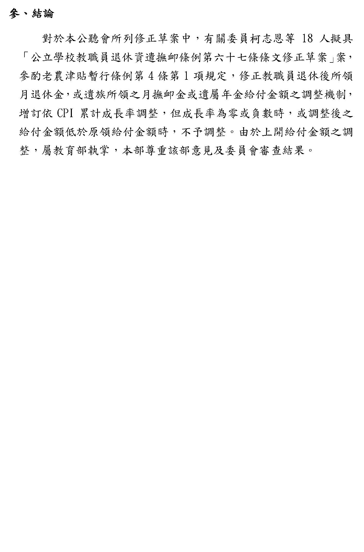 其他像隨CPI調整的部分,確實最近大家都對這個很關注,我們部裡面的立場只是想,因為畢竟隨CPI調整在國內各個職域都是先採5%,假設真的要調整,我們也希望要做一致性的,譬如我們主管的公保也是用5%,如果退休金先調了,這些都要連動考慮的,所以這個都可以調,大家可以就這個部分再做深入的討論,之後我們希望在逐條的時候,大家都可以理性好好地看待這個制度,我們最終的目的,以我當司長的角度來想,我們真的只是為了要守護這個制度而已,謝謝。