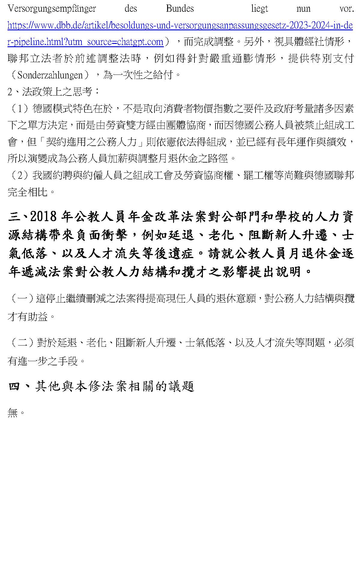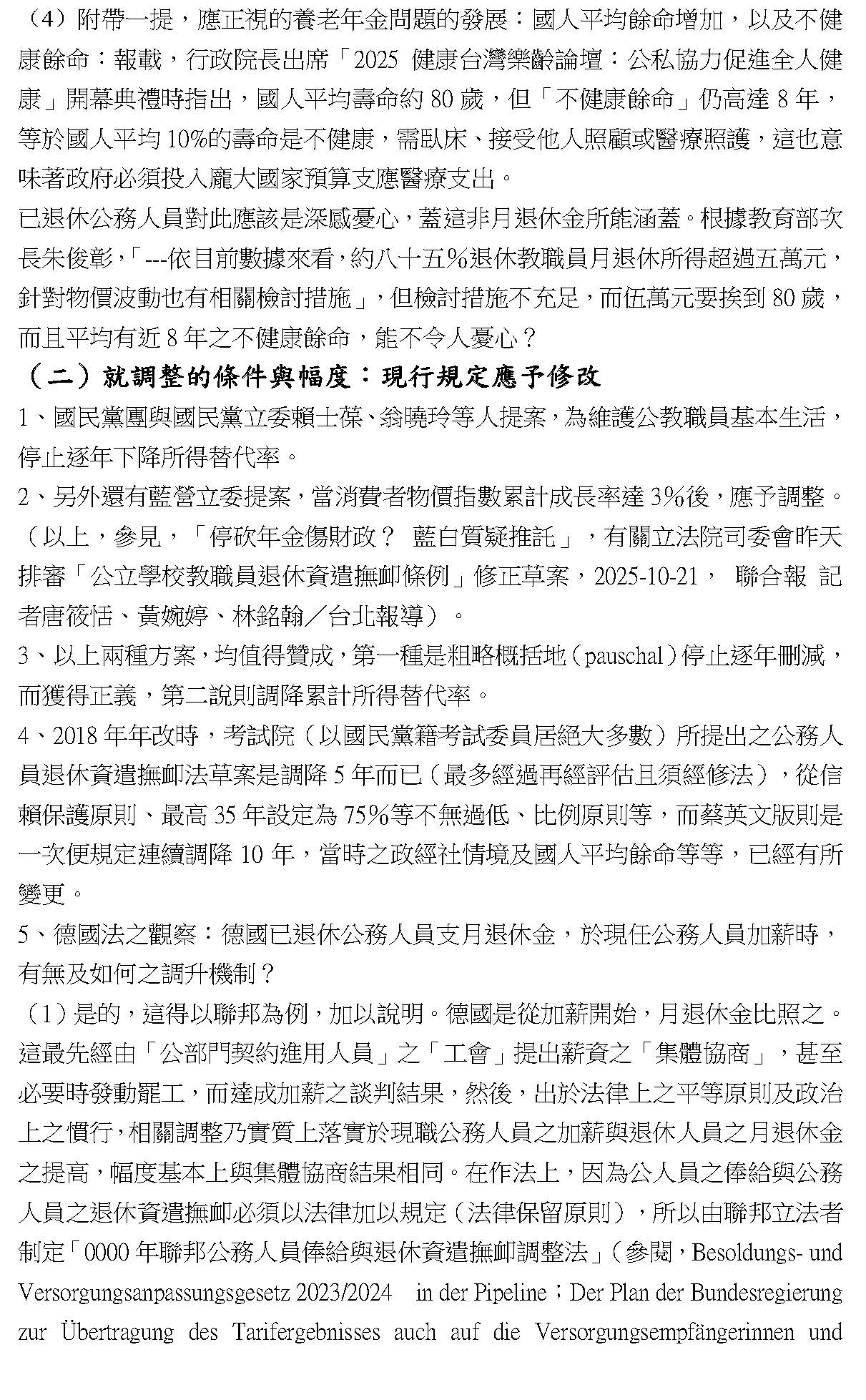 接下來要講第二種方法,是不是隨同現職人員調薪,有一些委員的提案是這樣,比如說傅崐萁、洪孟楷、林思銘委員,剛剛張智倫委員的發言也是這樣。那我在這邊要講,德國就是隨同現職人員調薪,我特別要講德國就是這樣做,德國第一個是規定在他們的公務人員退休資遣撫卹法第七十條第一項,在我的書面意見裡面沒有這個,這是我今天早上查到的,這一條就明白規定月退休金的調整應該依據現職人員的俸給調整,而在同一個時間點調整。第二個,他們實際上現職人員的薪水是怎麼調?他們的公務人員是可以組工會,但是這個工會是比較有限度的工會,它不能罷工,也沒有團體的協商權,所以德國的公務人員怎麼加薪?他是從公部門的契約進用人員,契約進用人員就是約聘約僱這些人,他們可以組工會,而且他們的工會是有談判權的,可以協商也可以罷工,所以發動都是來自契約進用人員工會去罷工,然後得到一個薪資談判的結論,就是加薪多少,這些契約進用人員加多少,公務人員就加多少,接下來退休人員就加多少,是一樣的數字。因為公務人員俸給法及退休法都有所謂的法律保留原則,所以都要經過修法,你注意看德國動不動兩、三年就在修法,修法的時候第一個當然就是有關退休金的部分;第二部分就是繼受整個談判的結果,我書面上有引述一個最新的資料,大家可以上網去看。第二個,有時候聯邦立法者會針對特殊的、困難的情況,比如俄烏戰爭造成能源短缺、物價上漲難以承受,特別再加一筆特別支付,所以不是只有照月退休金調漲,而是要看需要,立法者可以來做一個必要的安排。