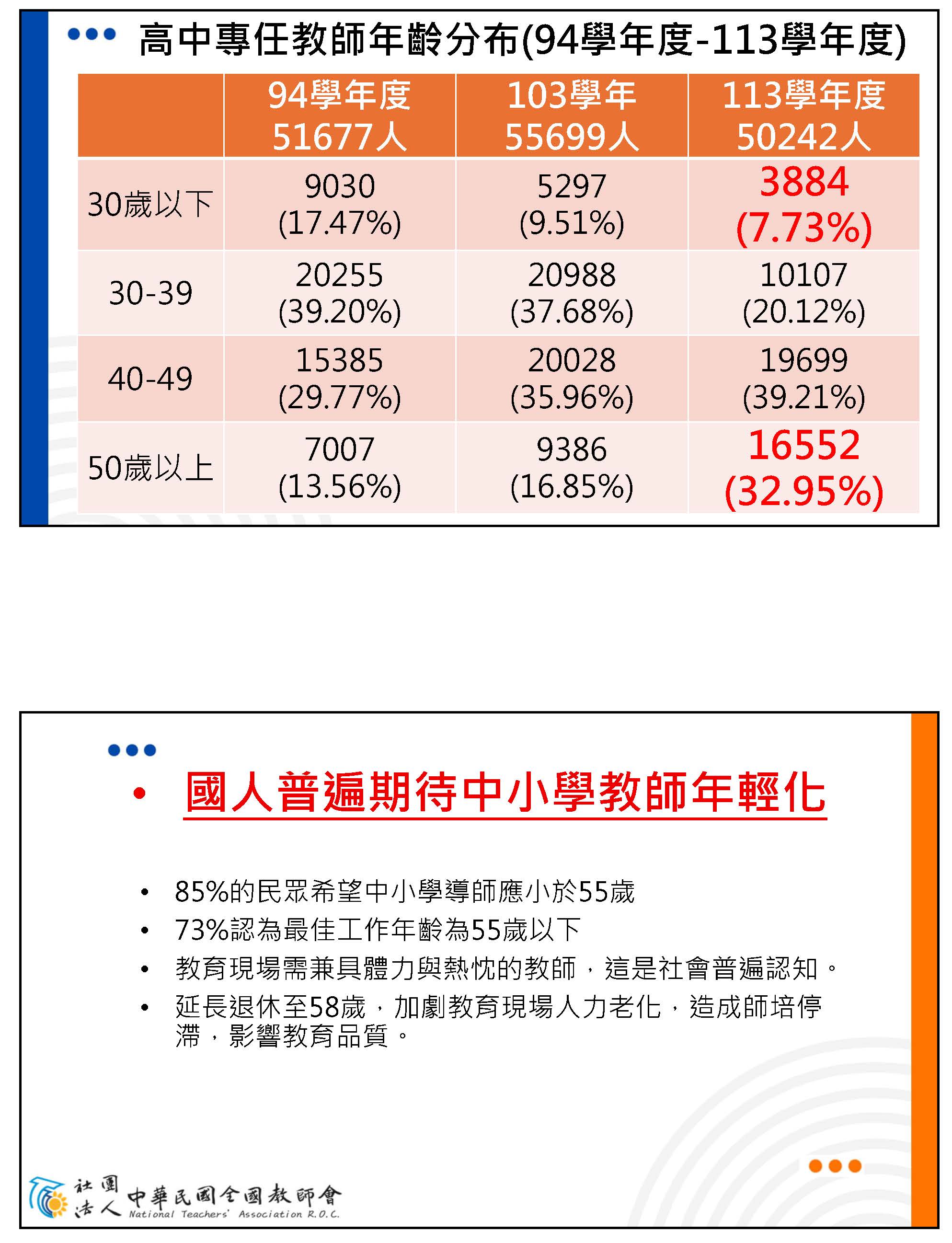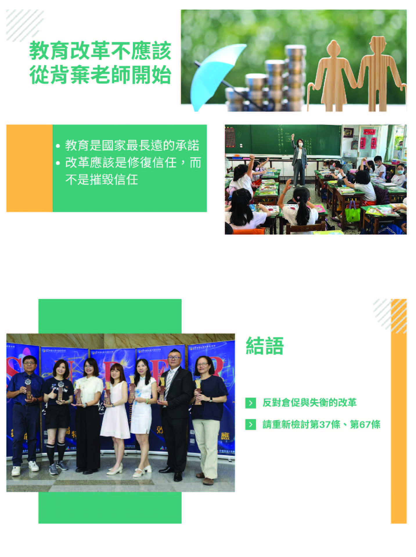最後我們做一個收尾,第一個是反對倉促跟失衡的改革;第二個,請重新檢討公立學校教職員退休資遣撫卹條例的第三十七跟第六十七條。這張照片是今年度杏壇芬芳獎的合照,大家可以看看上面有多少資深的老師在為教育現場做服務,我們希望今天的公聽會,不會再把這個議題重重地提起,卻是輕輕地放下。改革不是撕裂的代名詞,而是讓老師安心的教學、社會恢復信任的起點。我的報告到此,謝謝大家。