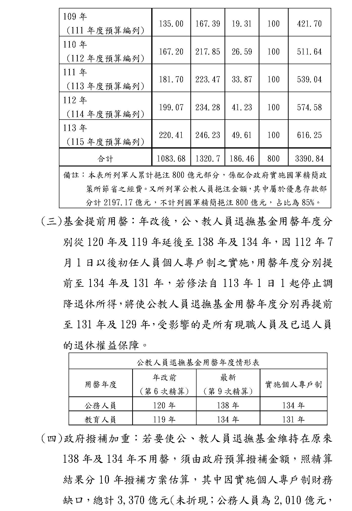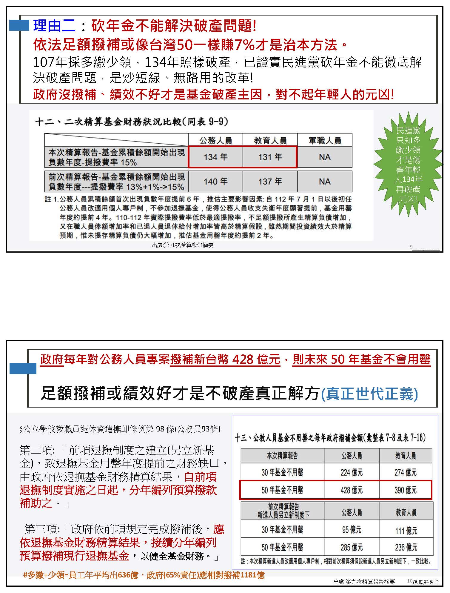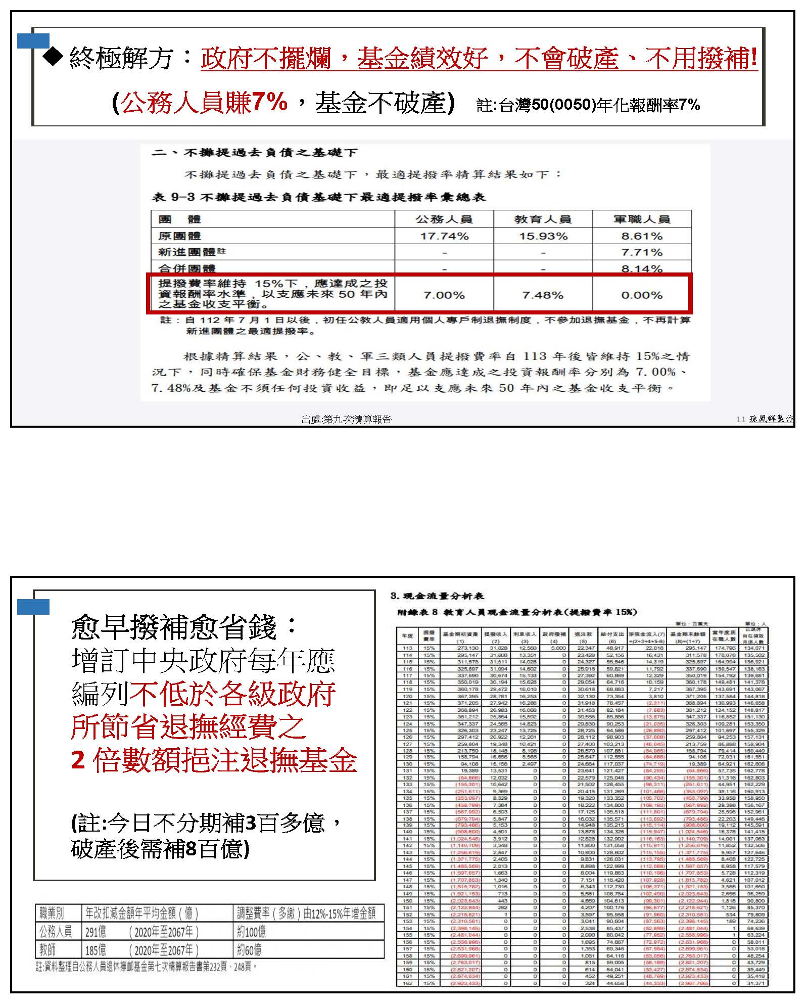 用撥補來解決,這也不是我說的,這是政府自己出的精算報告就明白地寫出,每年對公務人員專案撥補新臺幣428億元,則未來50年基金不會用罄,也就是未來50年基金不會破產,不會用罄就是不會破產,那麼教師是390億元,所以足額撥補或是績效好才是不破產的真正解方。當然我們更希望如果能夠像精算報告講的一樣,基金績效夠好的話,就好像精算報告顯示的,公務人員跟教師賺7%左右的話,這個基金自己就會賺到前面所講的那七、八百億元,甚至政府也不用撥補了,當然也不會破產。