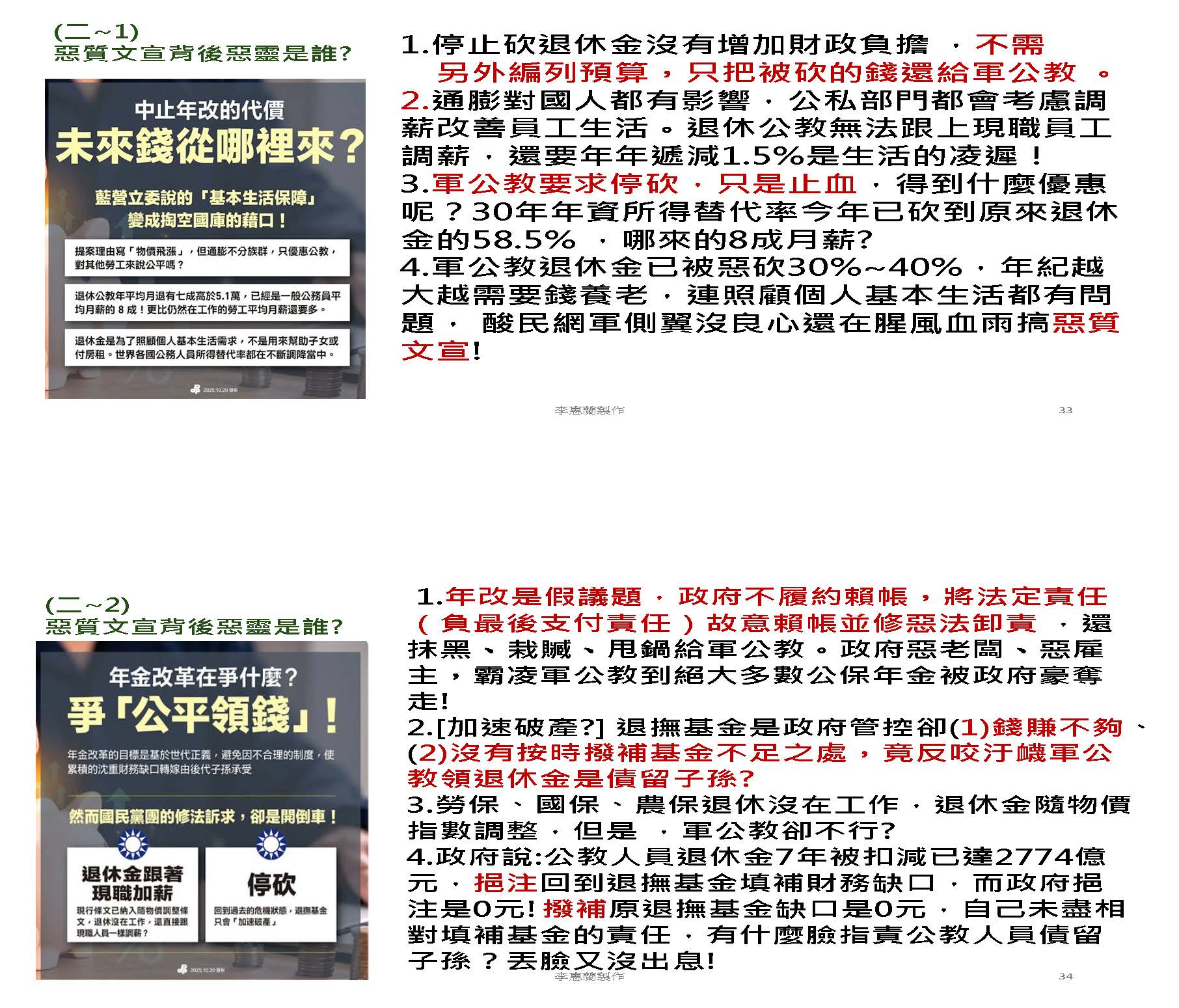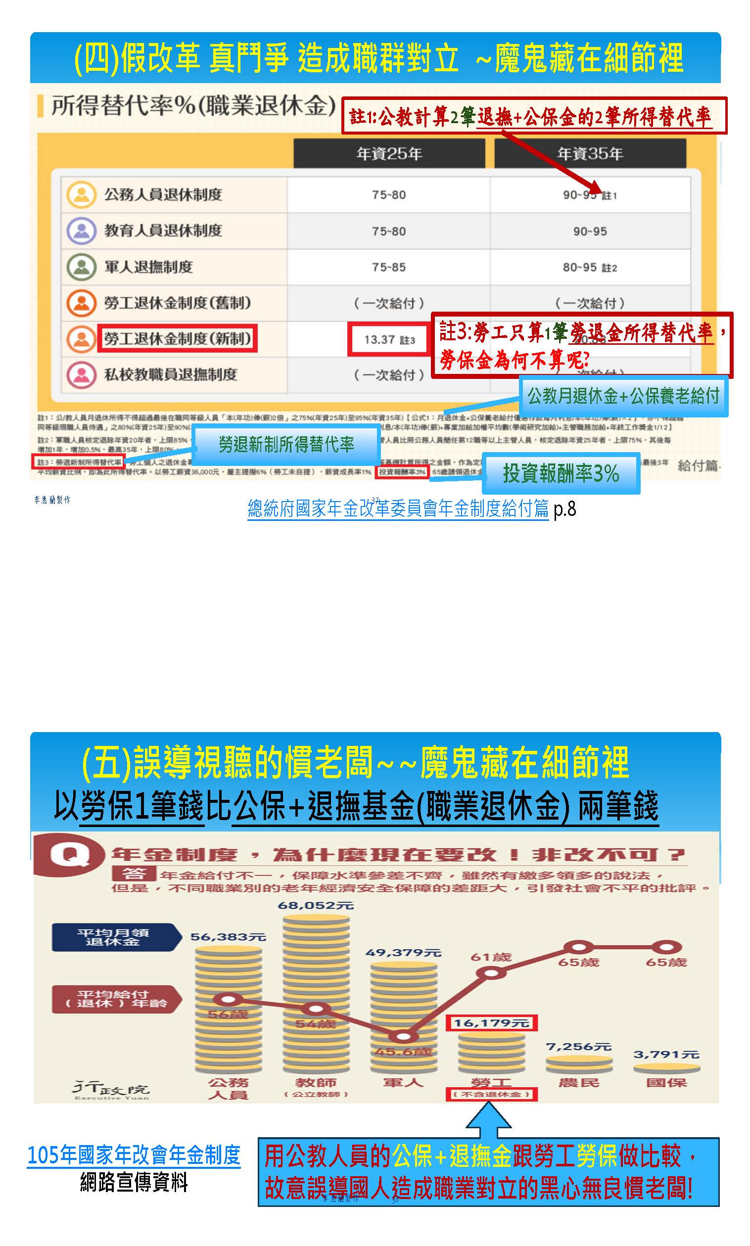 可是很多綠委、綠媒還有綠嘴,老是就在帳面大做文章、老是惡意的扭曲,造成很多民眾無知的誤解,認為公教退休金雖然被砍,但是你每個月領很多錢,勞工跟公教之間有職業不公的問題,像剛剛那位賴什麼的,他就講了一些挑撥離間的話,他不講公務員繳了多少錢,才能領這麼多啊!