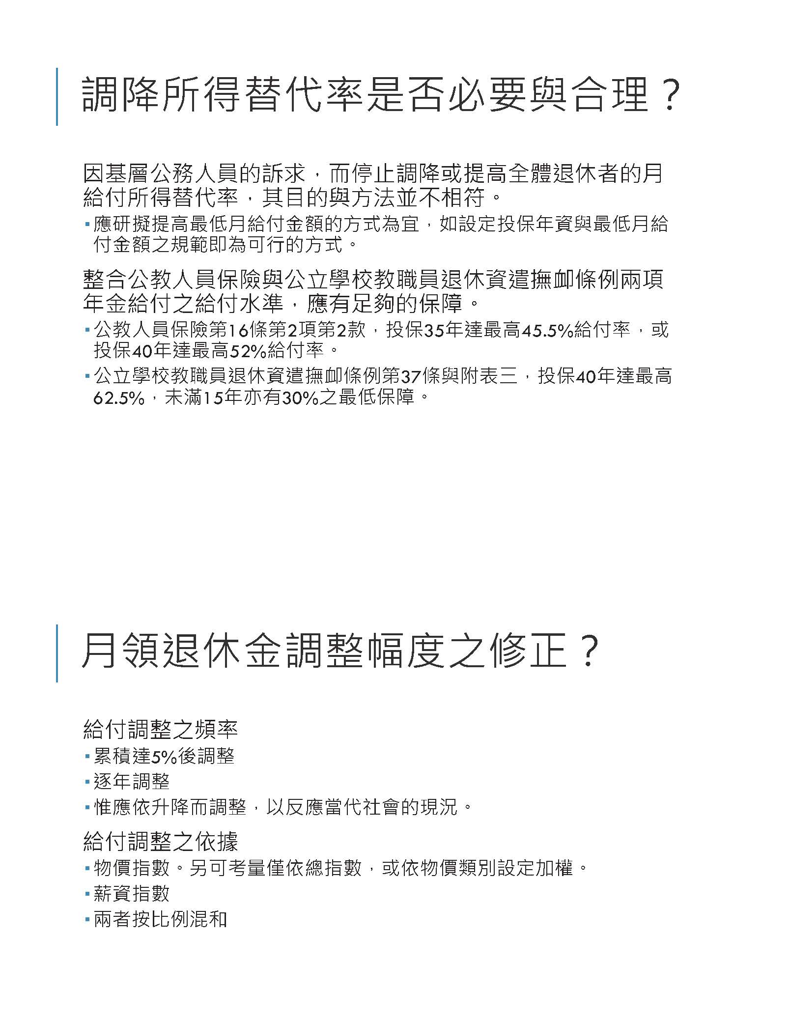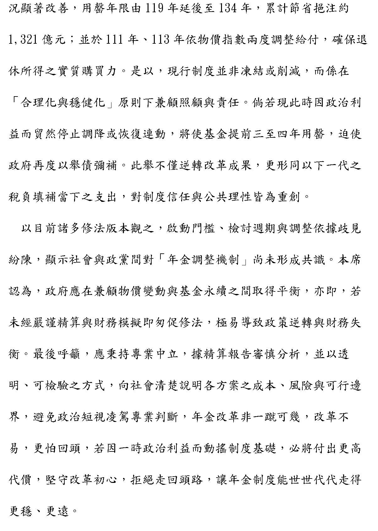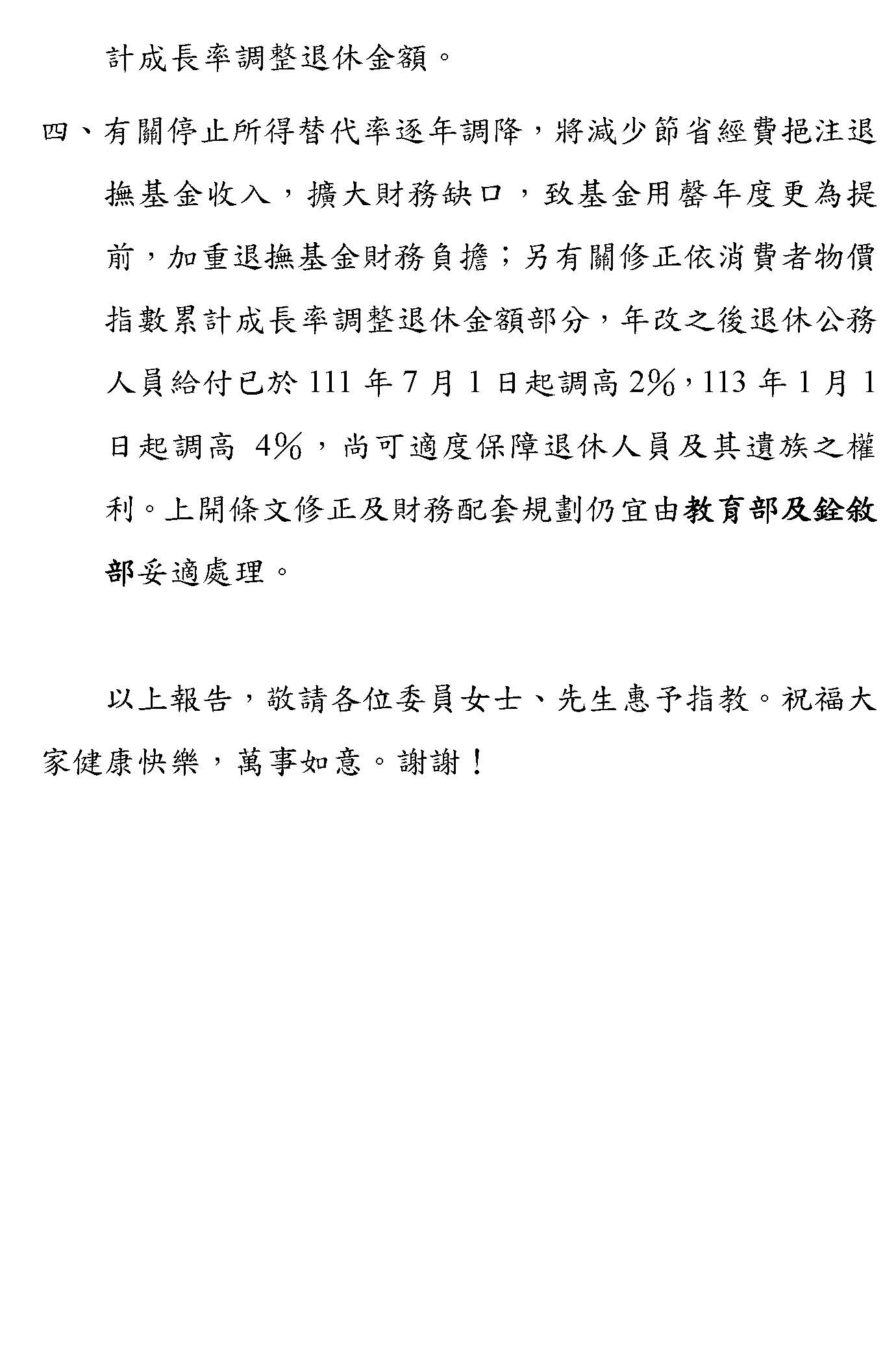 本席與本黨及眾多黨團的同仁都認為應該停止年金所得替代率的持續削減,並建立與物價指數連動的年金調整機制,這個是重新校正制度的失衡,保障退休教職員的老年生活,是國家應有的誠信體現。