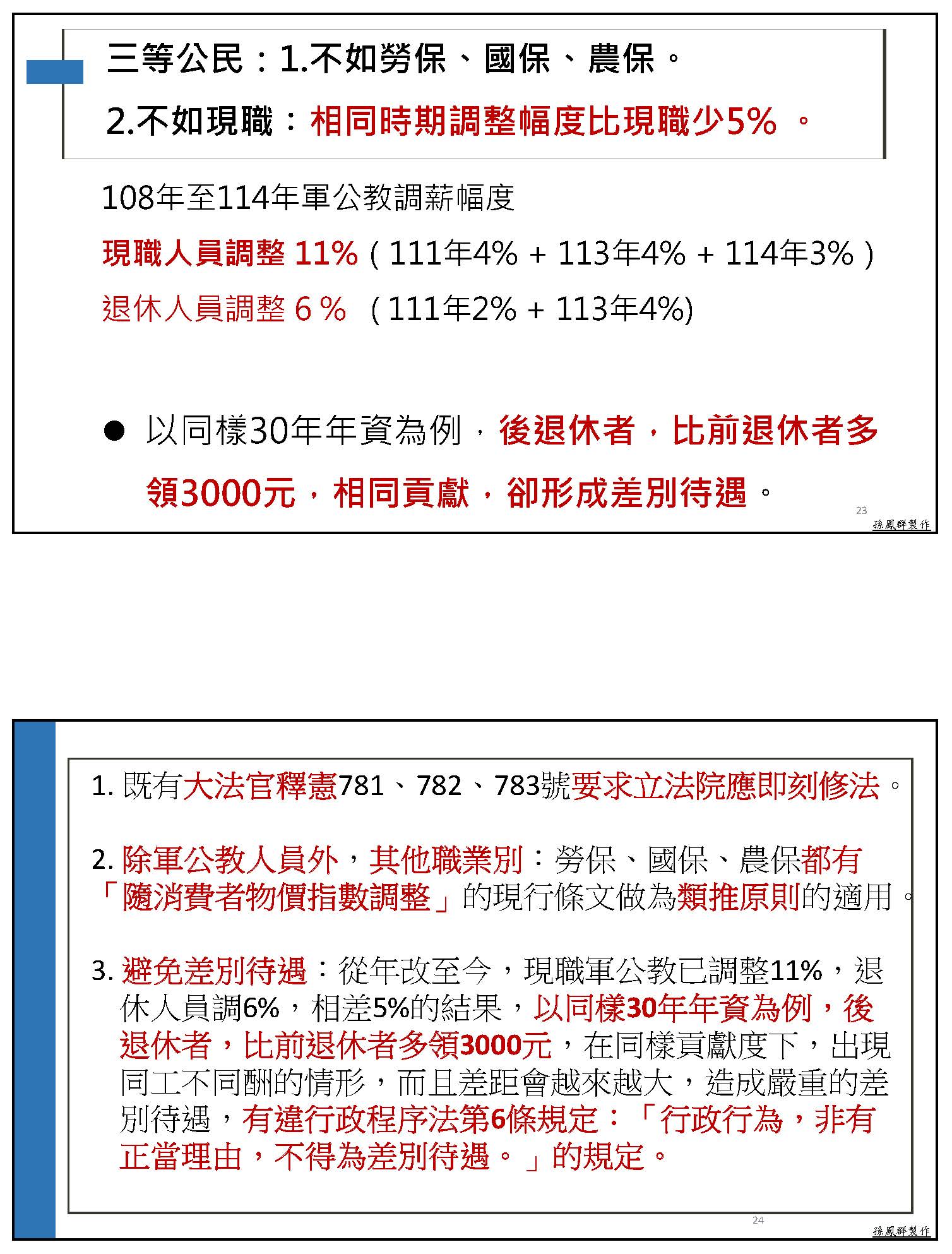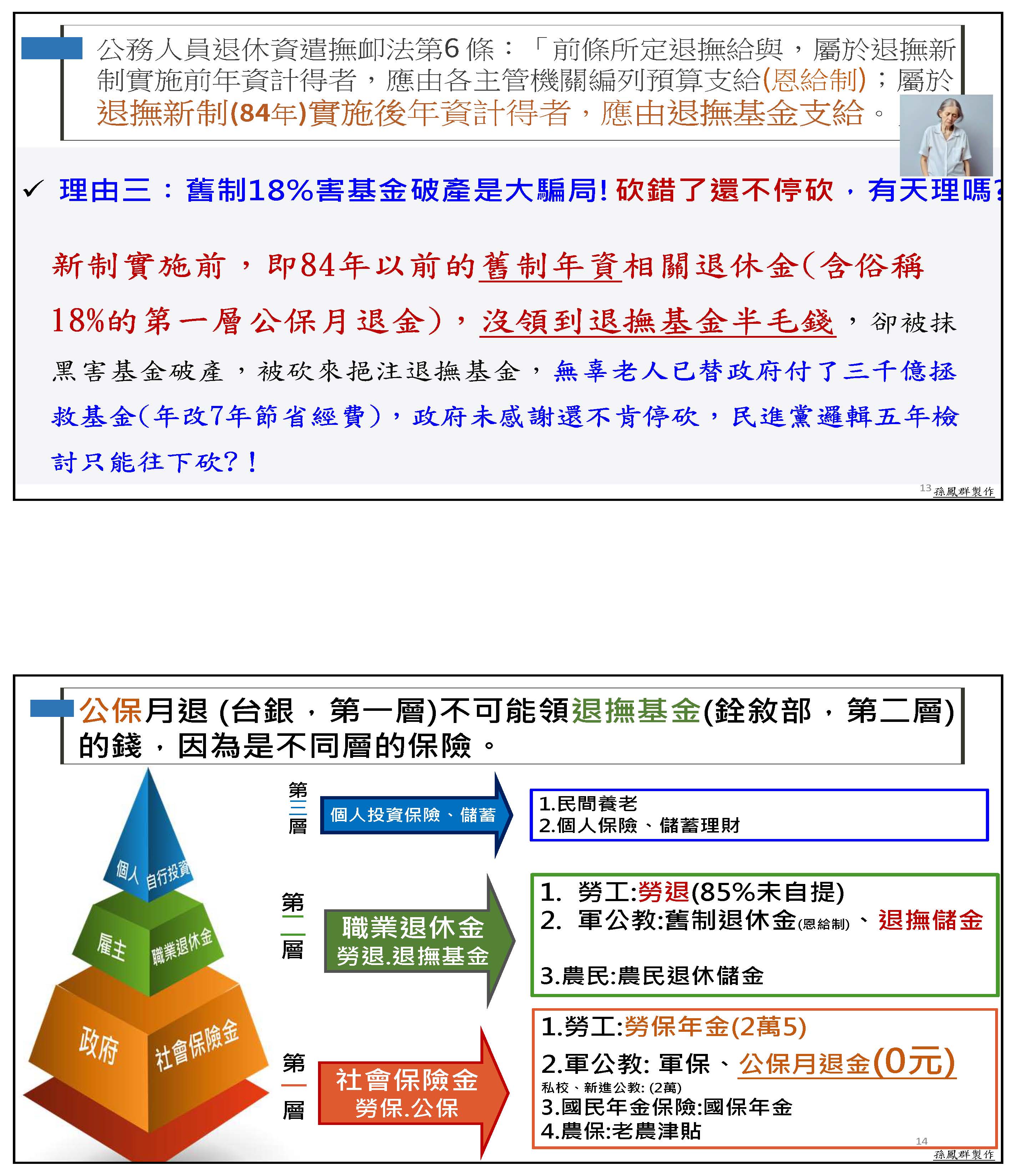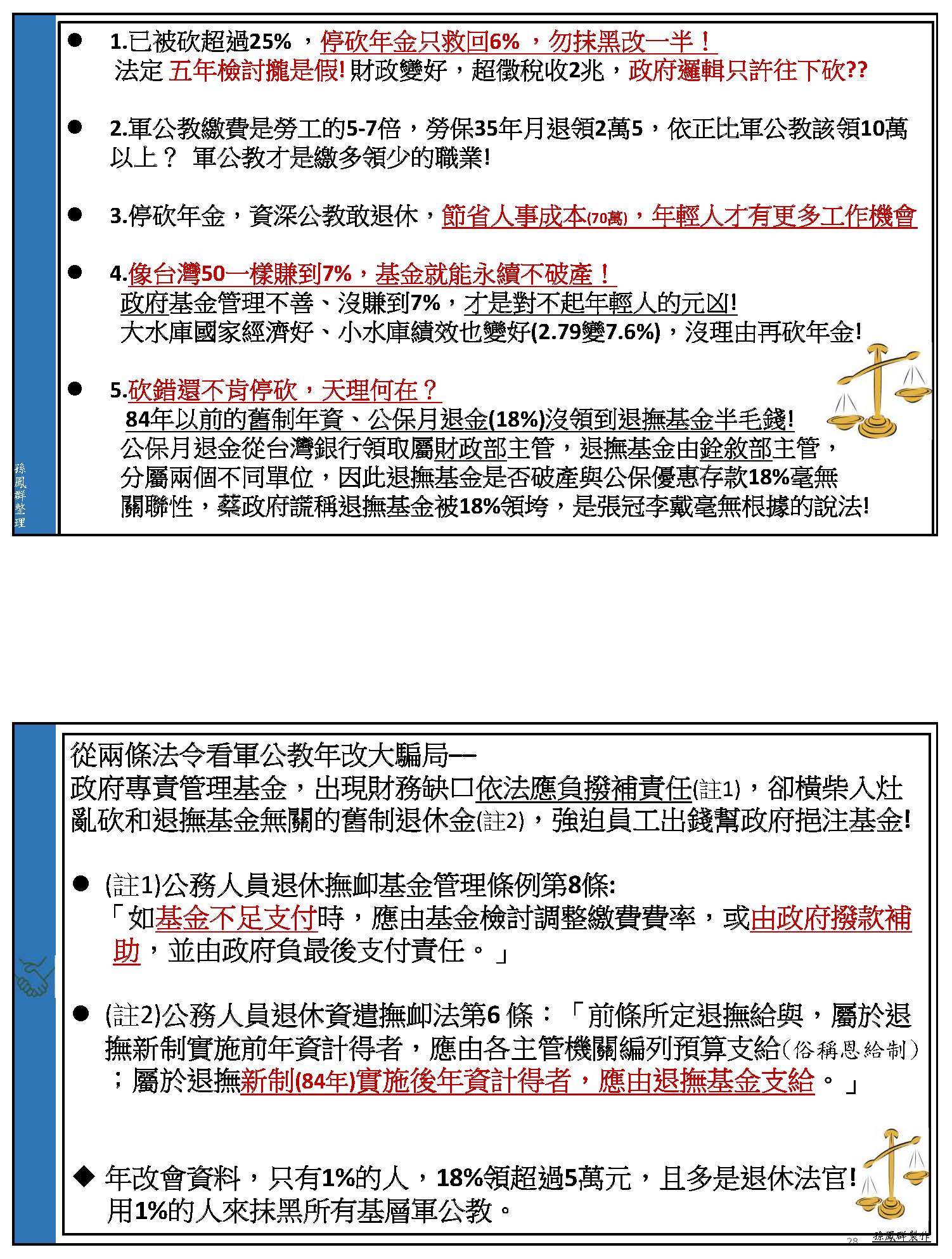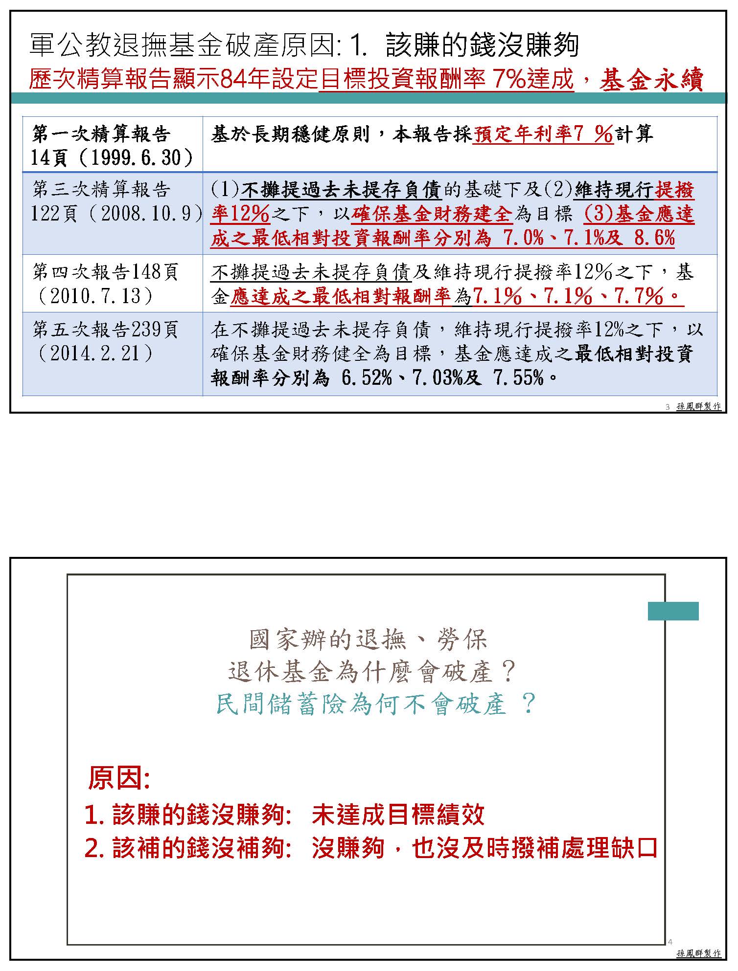 孫副理事長鳳群:主席、各位委員,以及在座各位先進,大家好。我們一開始就先來講砍年金是不是屬於正當的改革,我們先從公務人員退休撫卹基金管理條例第八條來看,這一條就明白顯示,如基金不足支付時,應由基金檢討調整繳費費率,或由政府撥款補助,並由政府負最後支付責任。在年改的時候,軍公教已經配合調整繳費費率,由繳費12%調整為15%,未來甚至可能到18%,可是員工多繳少領,每年已經平均挹注636億,但舊有的財務缺口,占65%責任的政府雇主卻是一毛不拔,這樣公平嗎?而且從這條法令可以看得出來,當基金財務出問題的時候,解決方法就是只有這兩條。所以我的停砍理由第一點就是砍年金本來就是屬於違法改革,因為通膨年年有,退休金只能多不能少,所以年改前的法規,你找不到任何一條是允許可以用砍年金的方式來進行改革。像國民黨就比較有guts,他們在民國88年跟99年,當公保跟私校退撫基金有破產風險的時候,他們都是採用足額撥補的方式處理舊的財務缺口。