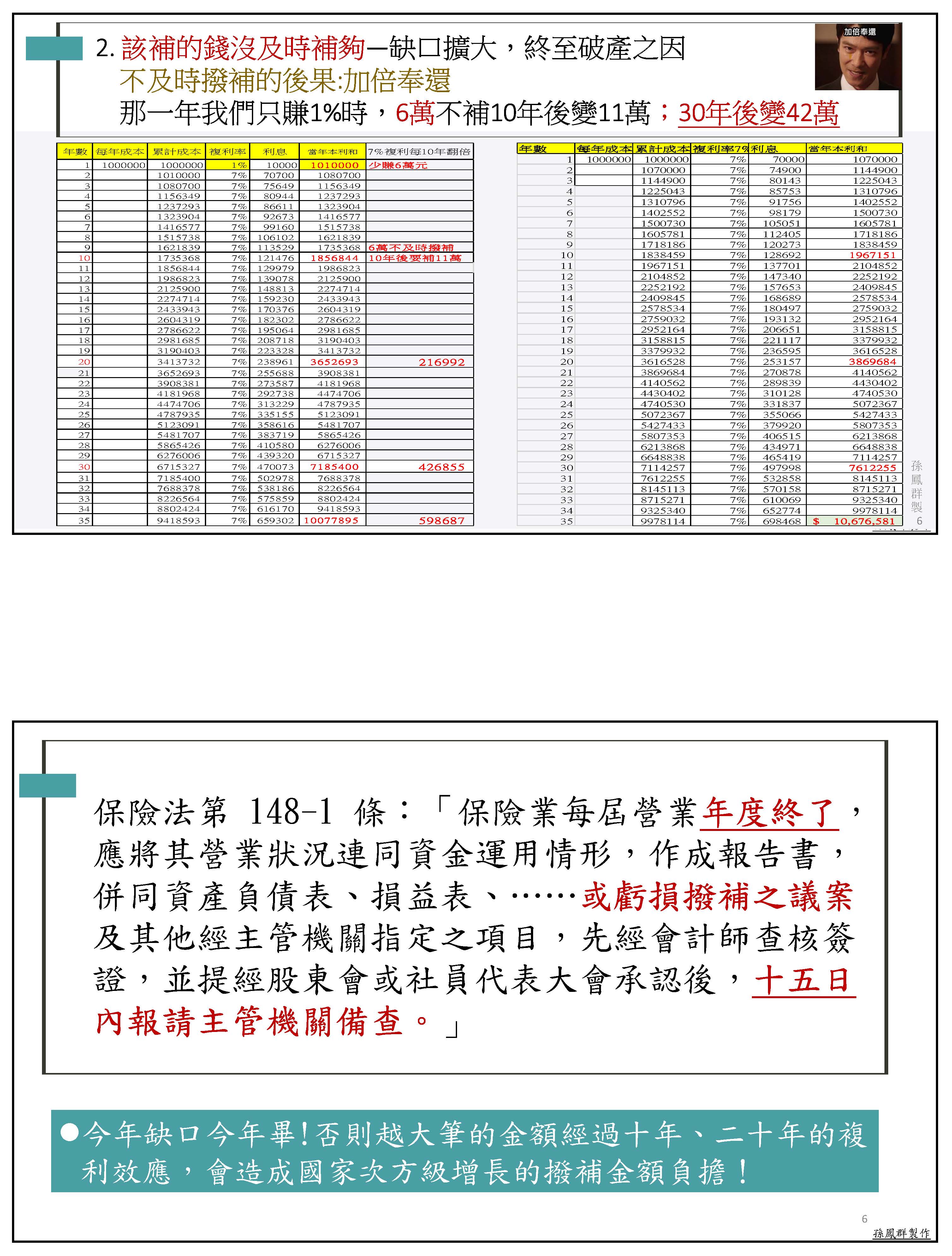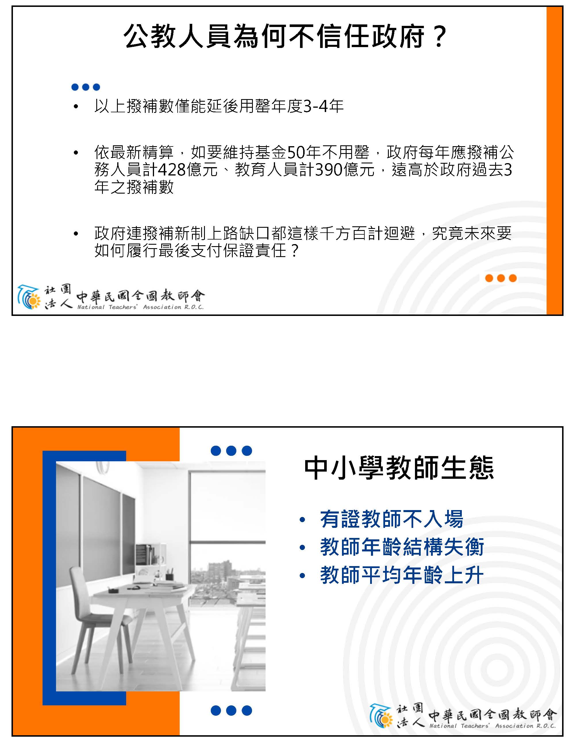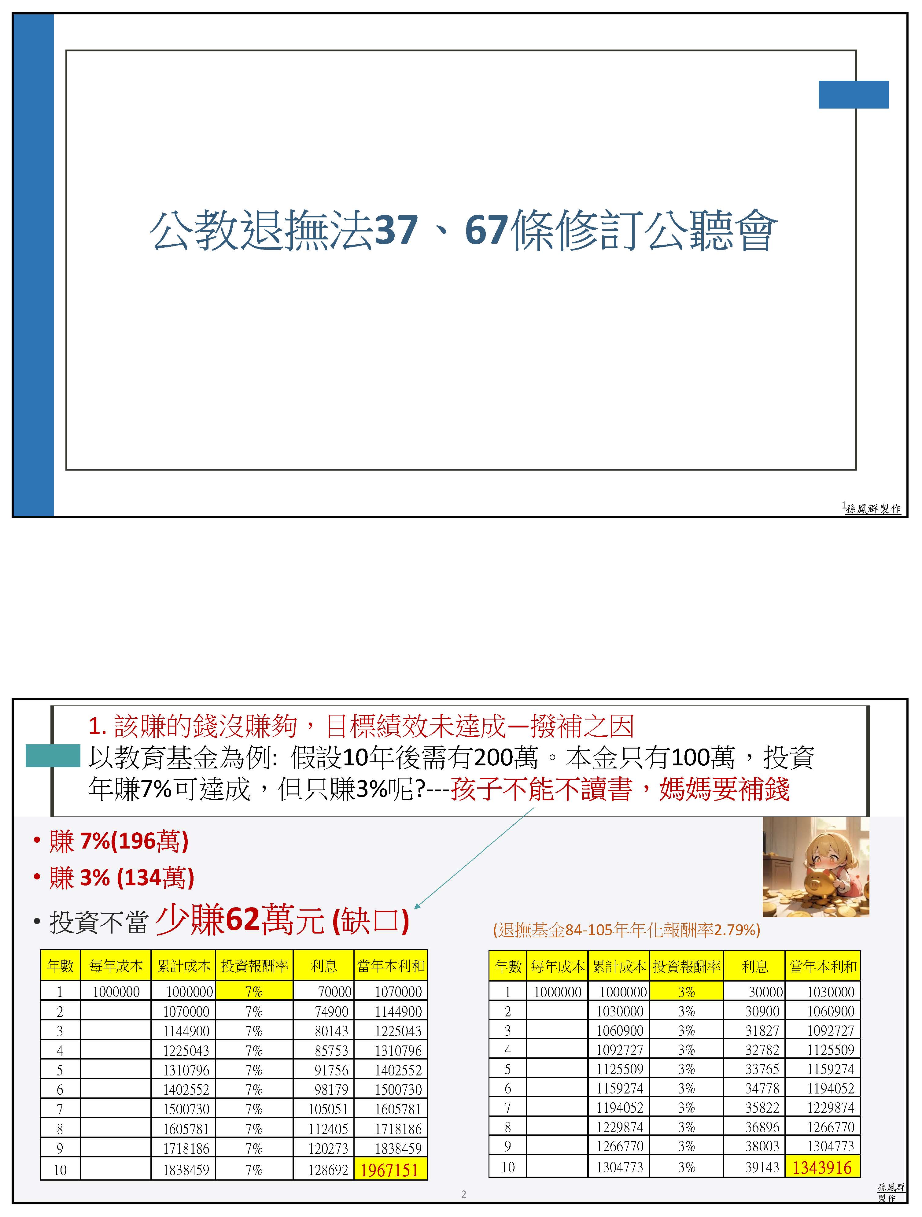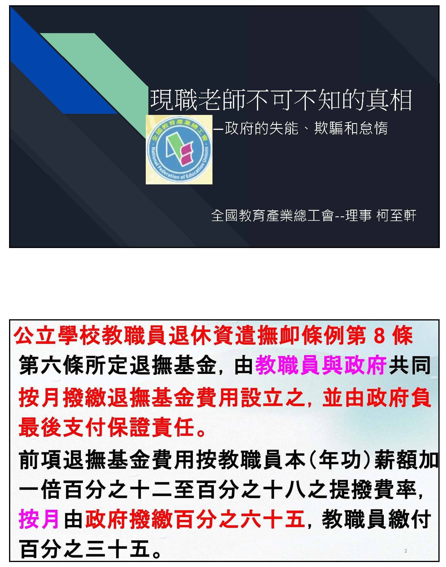 孫副理事長鳳群:主席、各位委員,以及在座各位先進,大家好。我們一開始就先來講砍年金是不是屬於正當的改革,我們先從公務人員退休撫卹基金管理條例第八條來看,這一條就明白顯示,如基金不足支付時,應由基金檢討調整繳費費率,或由政府撥款補助,並由政府負最後支付責任。在年改的時候,軍公教已經配合調整繳費費率,由繳費12%調整為15%,未來甚至可能到18%,可是員工多繳少領,每年已經平均挹注636億,但舊有的財務缺口,占65%責任的政府雇主卻是一毛不拔,這樣公平嗎?而且從這條法令可以看得出來,當基金財務出問題的時候,解決方法就是只有這兩條。所以我的停砍理由第一點就是砍年金本來就是屬於違法改革,因為通膨年年有,退休金只能多不能少,所以年改前的法規,你找不到任何一條是允許可以用砍年金的方式來進行改革。像國民黨就比較有guts,他們在民國88年跟99年,當公保跟私校退撫基金有破產風險的時候,他們都是採用足額撥補的方式處理舊的財務缺口。