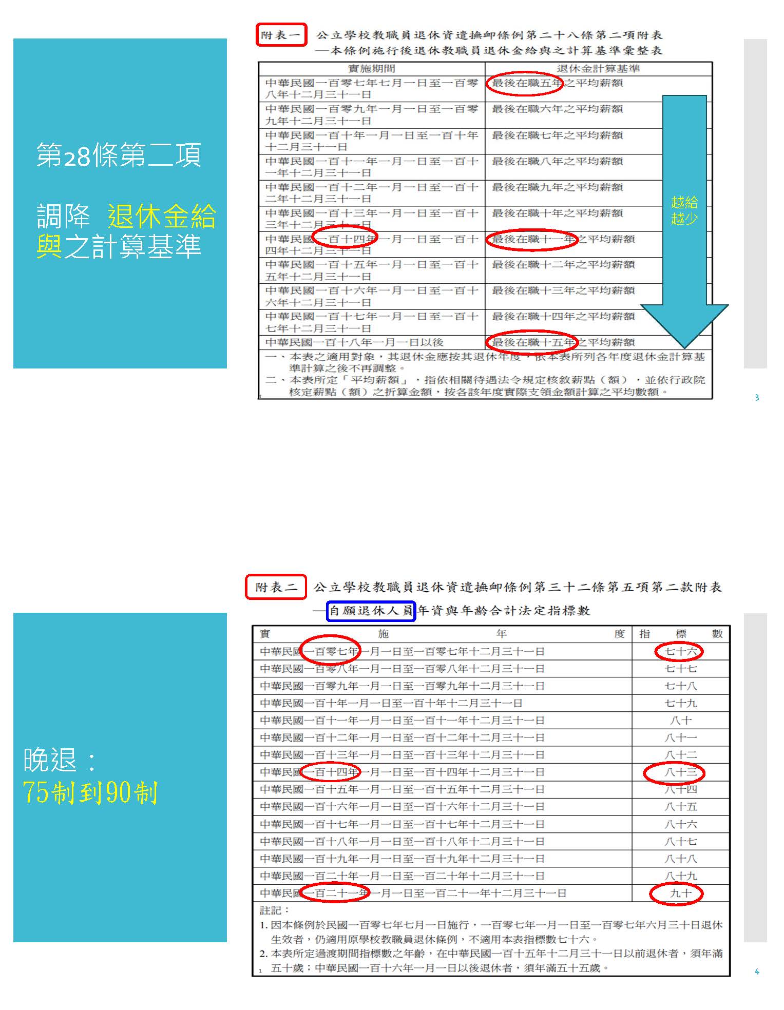 107年的公教年改造成了重大傷害,從這個畫面各位可以看到,主要是三降,第一個降低替代率,10年降15%;第二個,廢掉18%;第三個就是把退休金計算基準調降。這三降加上溯及既往就是附表一所顯示的,各位可以看到像退休金給與標準就是用平均薪資,拉低他的平均薪資;第二個就是對自願退休人員從七五制改成九十制;然後第三個就是替代率10年降15%。從這個表各位看到,這個設計本身就是違反人性,為什麼呢?因為人愈老,經濟上越不安全的時候,退休金就砍得越多,所以比如說看這個表的左邊,當你在65歲的時候退休,你的替代率是45%,到你75歲的時候會降到30%,75歲比60歲還要窮、還弱的時候,你的替代率又被降低了。
