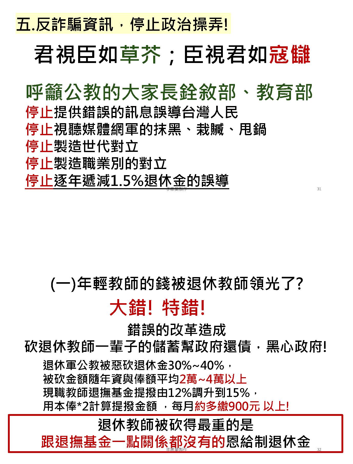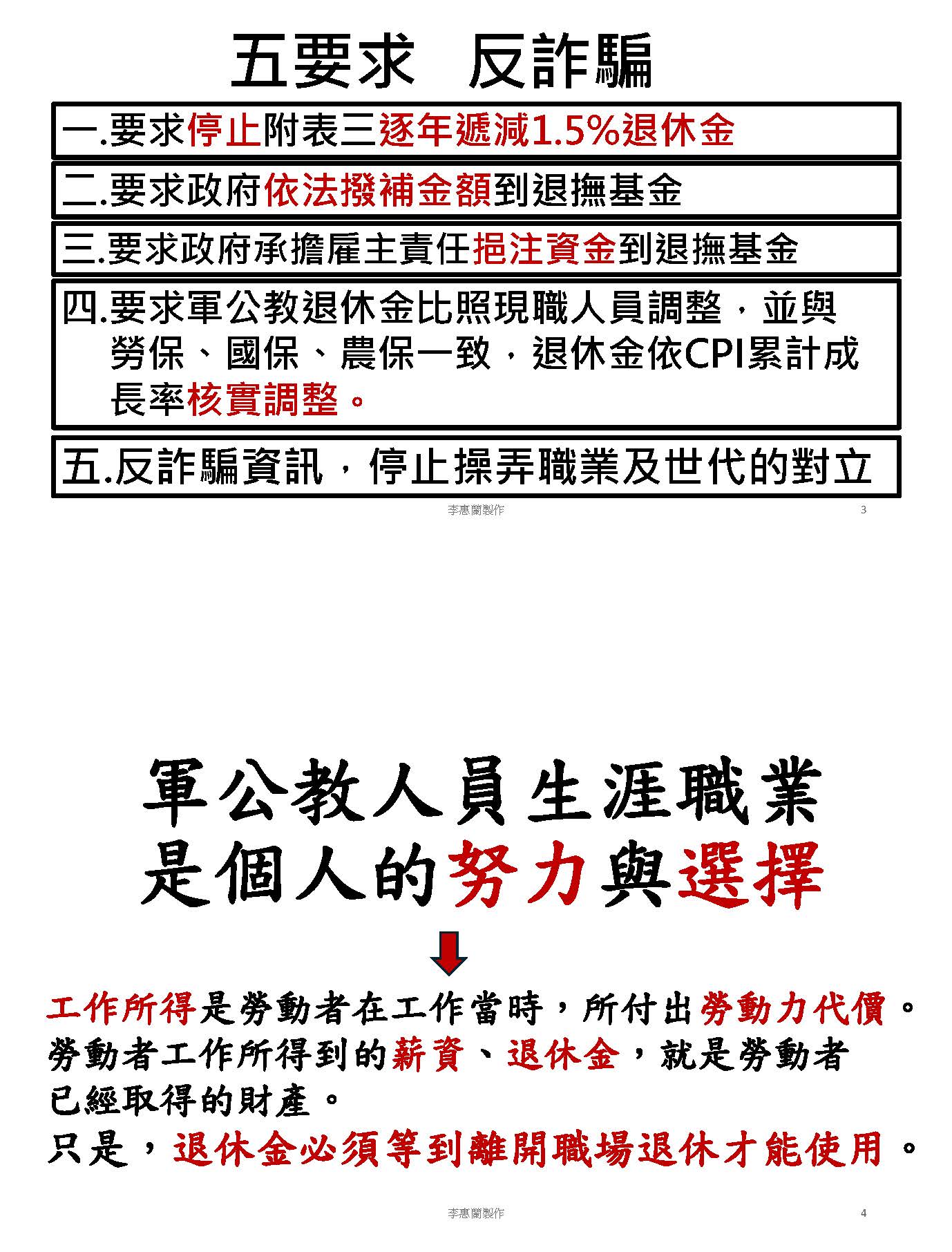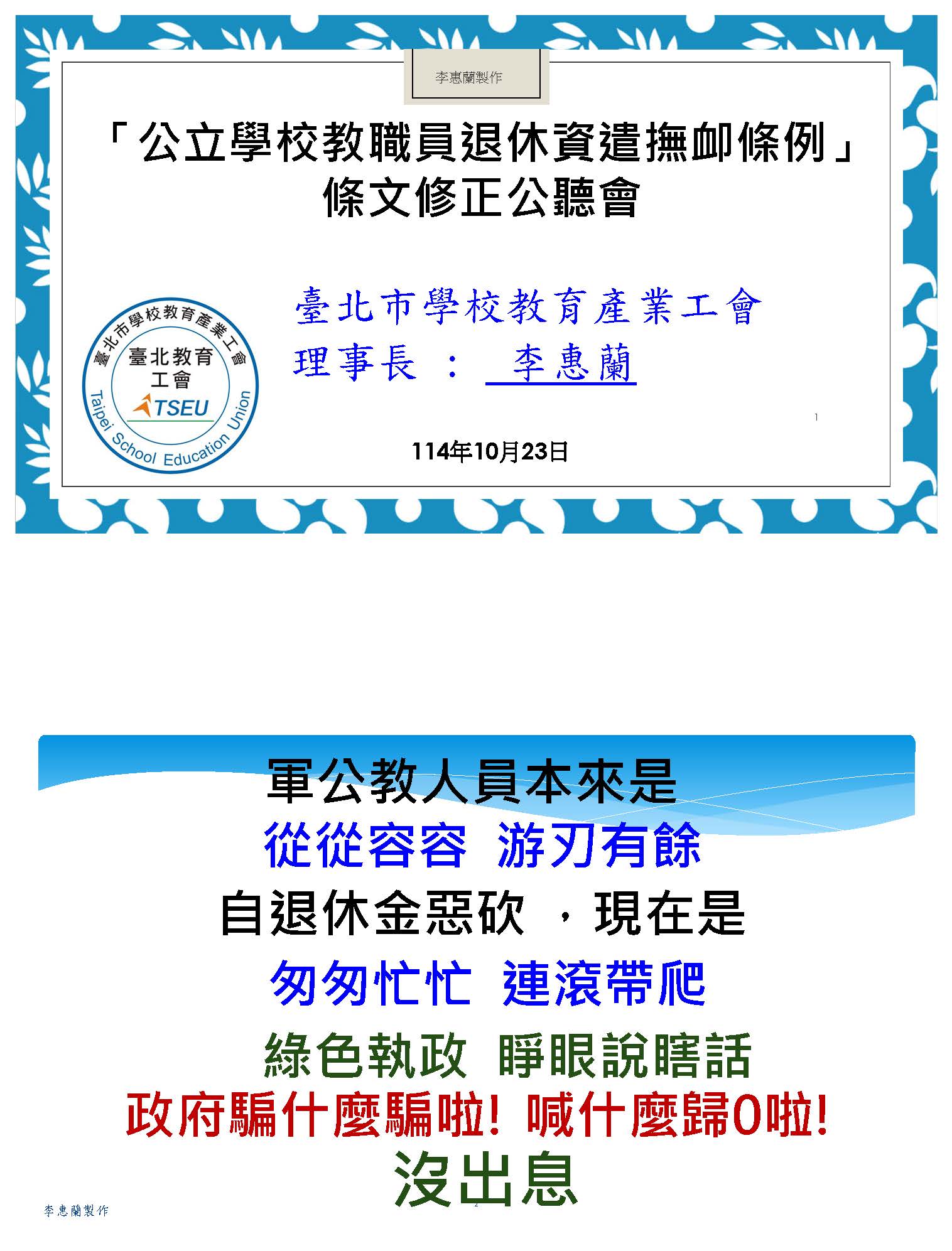 本人在此以現職教師和工會成員的身分沉重呼籲,除了修正公立學校教職員退休資遣撫卹條例,月退休金、月撫卹金、遺屬年金,依照消費者物價指數CPI比照勞保、國保何時調整,並立即依法憑精算報告逐年撥補足額進入退撫基金,盡好政府的責任。政府如果把基金的績效維持在預設好的7%以上,當然可以更優化,積極為員工經營好基金,盡好照顧員工的責任,不要抹黑軍公教、不要搞世代鬥爭。依法撥補讓基金缺口不要擴大,才是真正把關稅金。