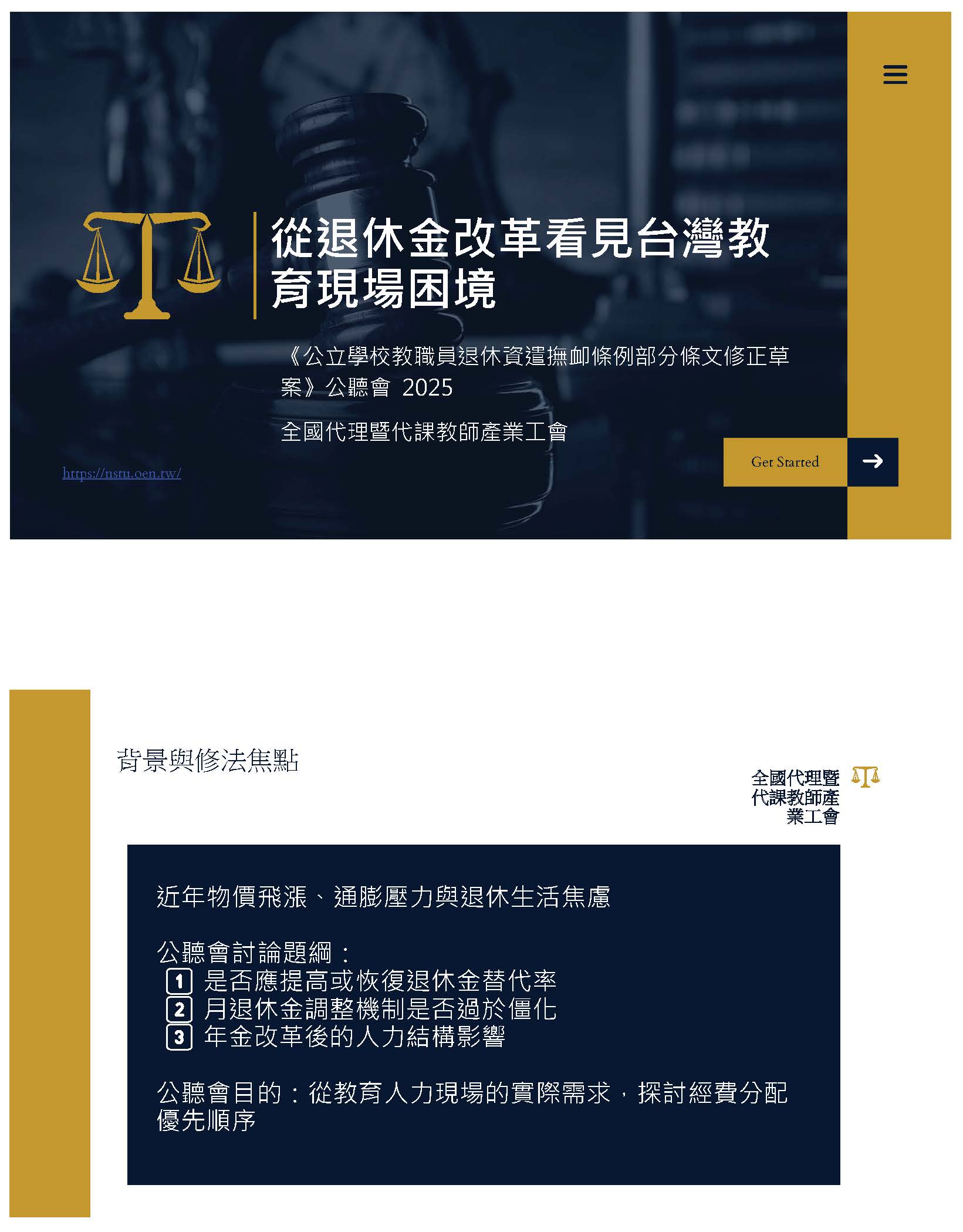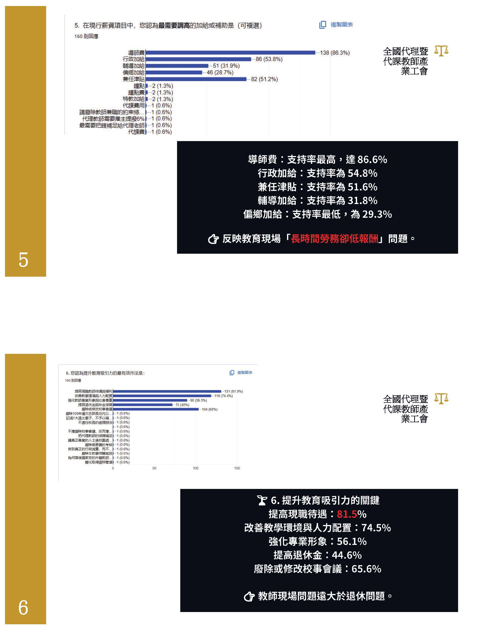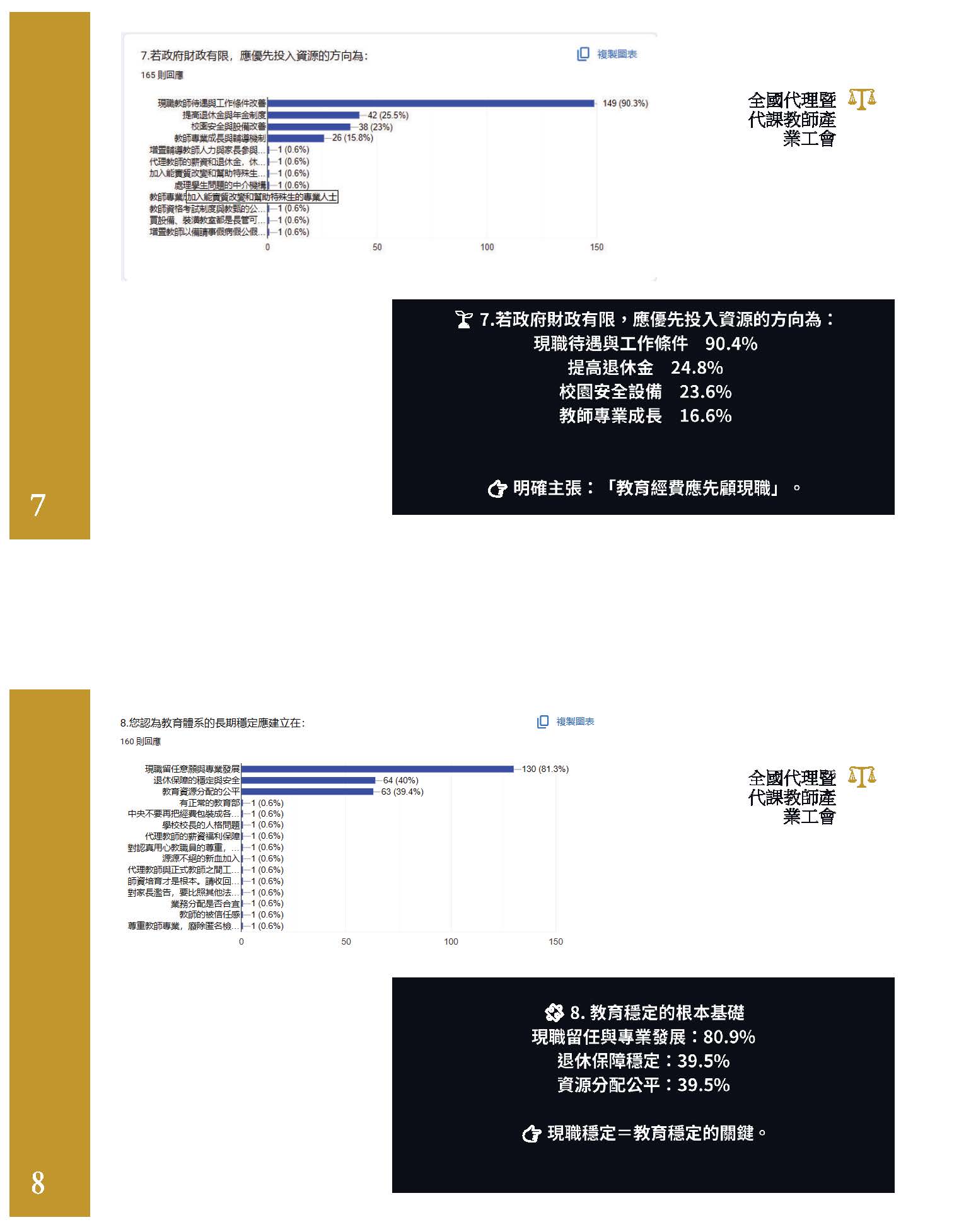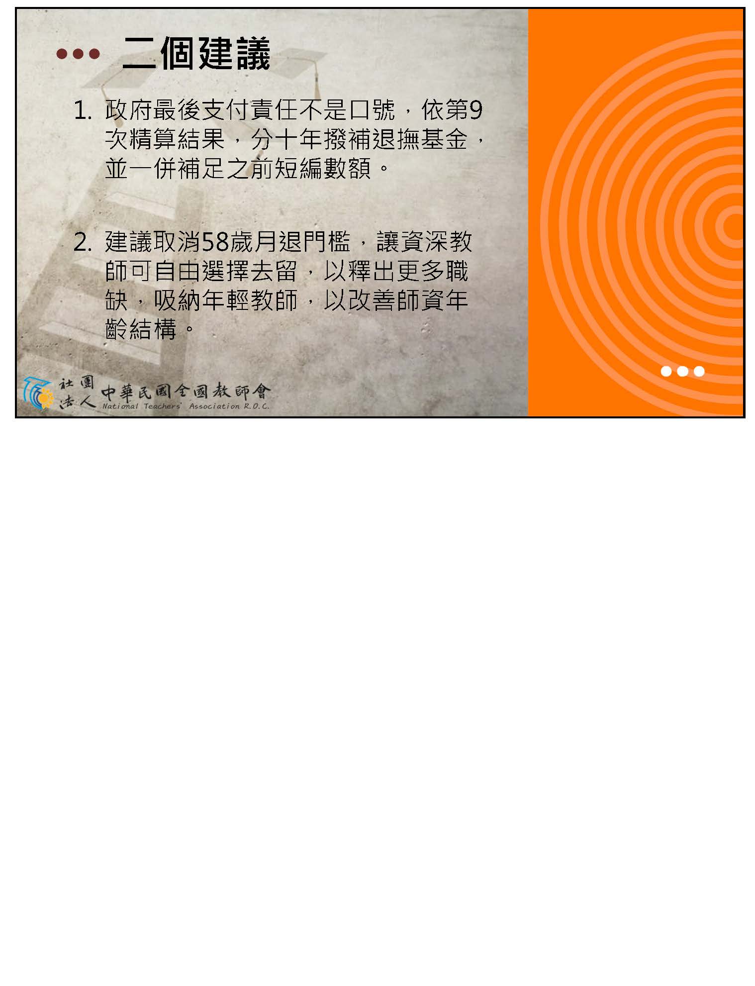 本人在此以現職教師和工會成員的身分沉重呼籲,除了修正公立學校教職員退休資遣撫卹條例,月退休金、月撫卹金、遺屬年金,依照消費者物價指數CPI比照勞保、國保何時調整,並立即依法憑精算報告逐年撥補足額進入退撫基金,盡好政府的責任。政府如果把基金的績效維持在預設好的7%以上,當然可以更優化,積極為員工經營好基金,盡好照顧員工的責任,不要抹黑軍公教、不要搞世代鬥爭。依法撥補讓基金缺口不要擴大,才是真正把關稅金。