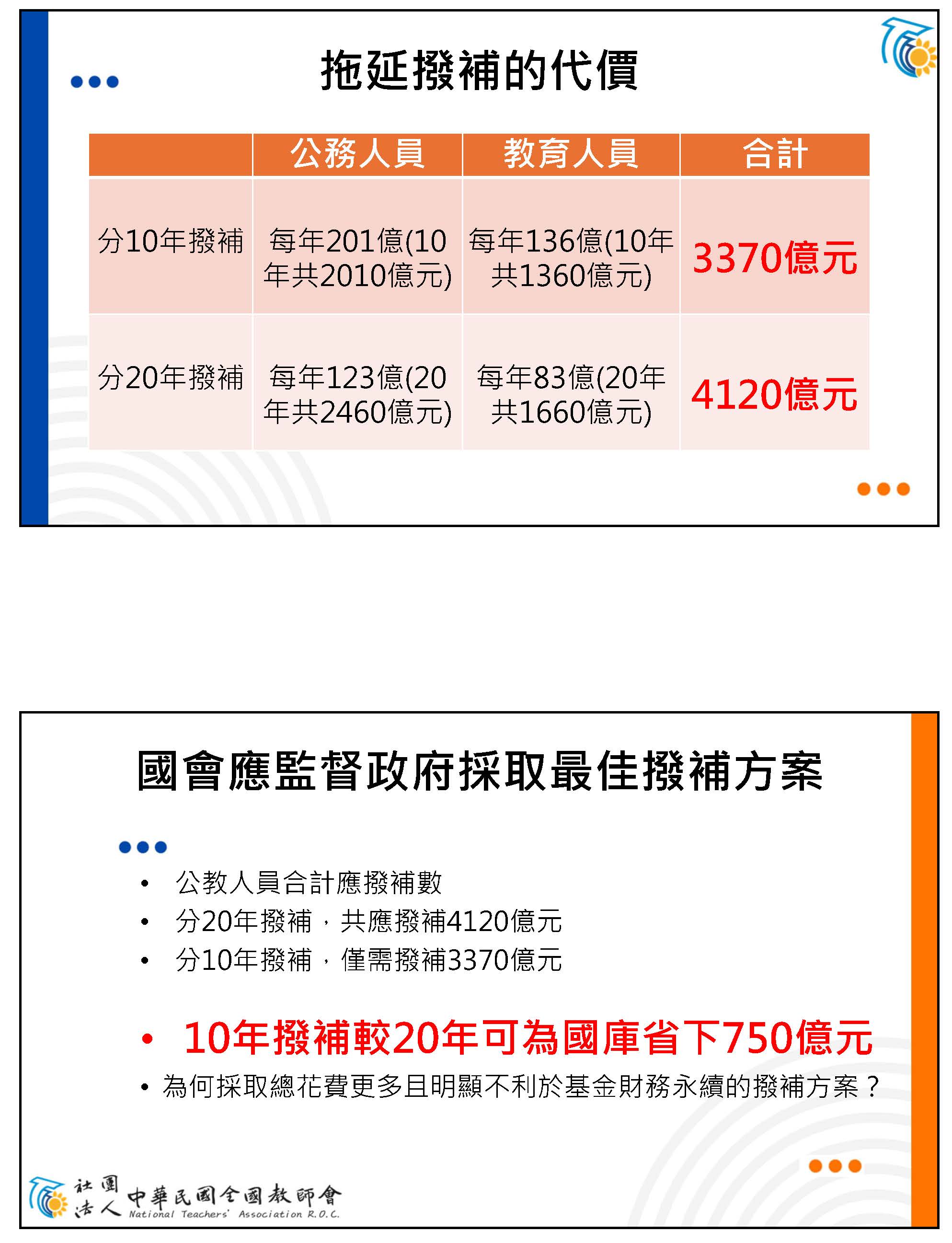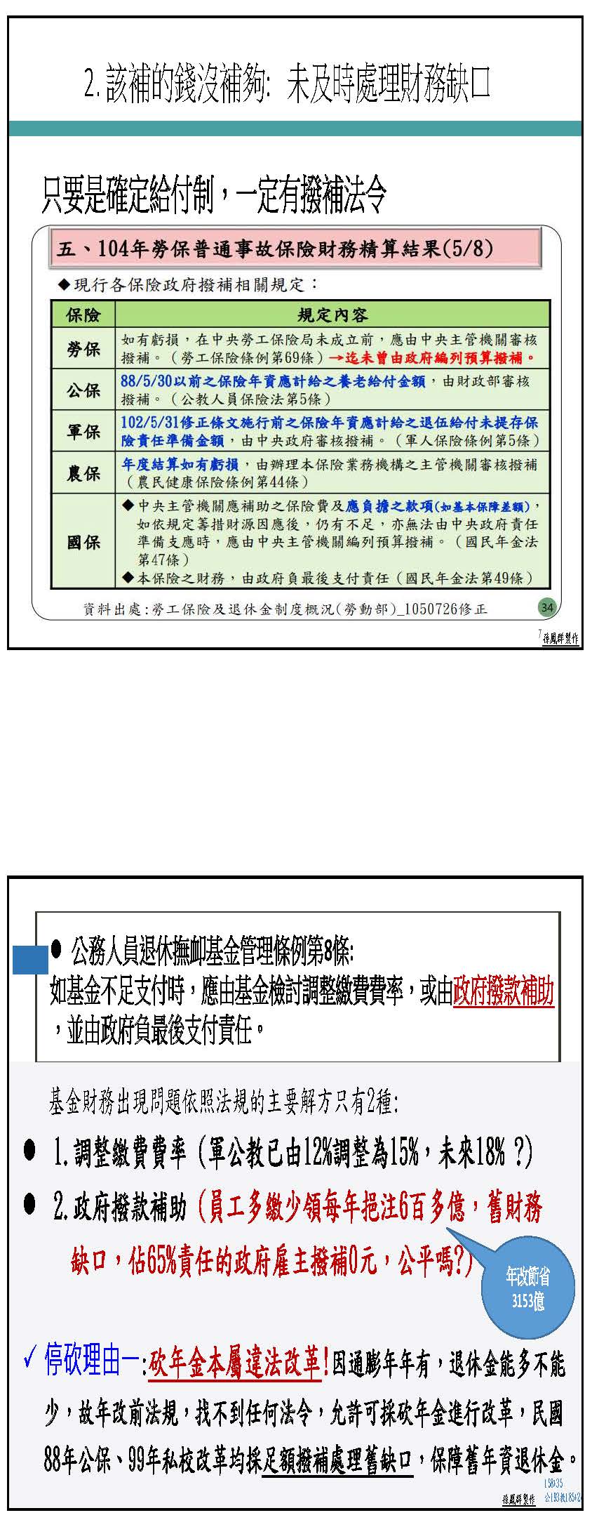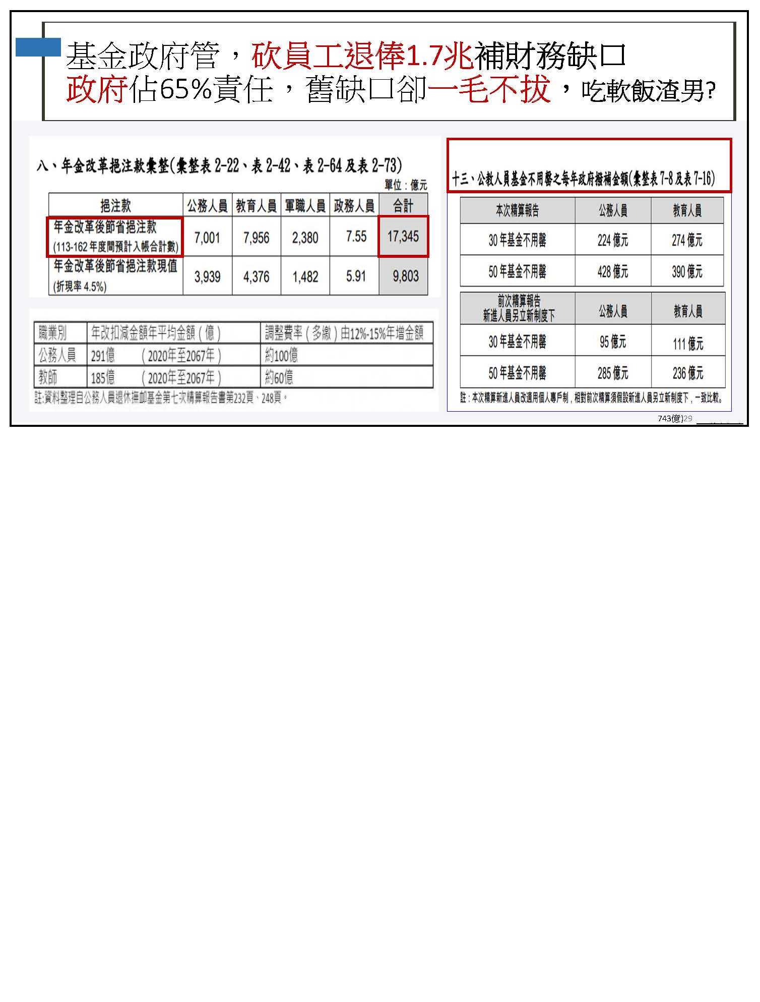 不過政府又搞出了另立新基金的洞,所以我們也希望初期能夠先像張智倫委員幫我們提案的:增訂中央政府每年應編列不低於各級政府所節省退撫經費之2倍數額挹注退撫基金。也就是說,以我們每年被砍的四百多億來挹注退撫基金;相對的,我們是繳35%、政府提繳65%,相當於我們的2倍,所以相對撥補我們挹注金額的2倍也是合理的事情。而且現在不逐年撥補、分期撥補三百多億的話,等到破產以後再來撥補,就要撥補八百多億,我之前算過,公務人員跟教師如果現在就開始撥補的話,可以幫國家省各1兆,總共可以省2兆,所以越早撥補越省錢!