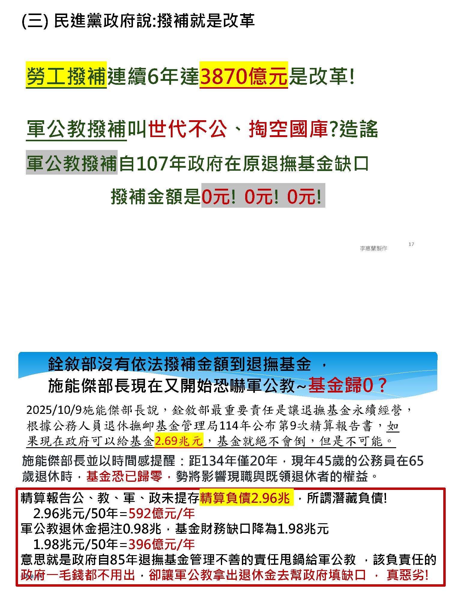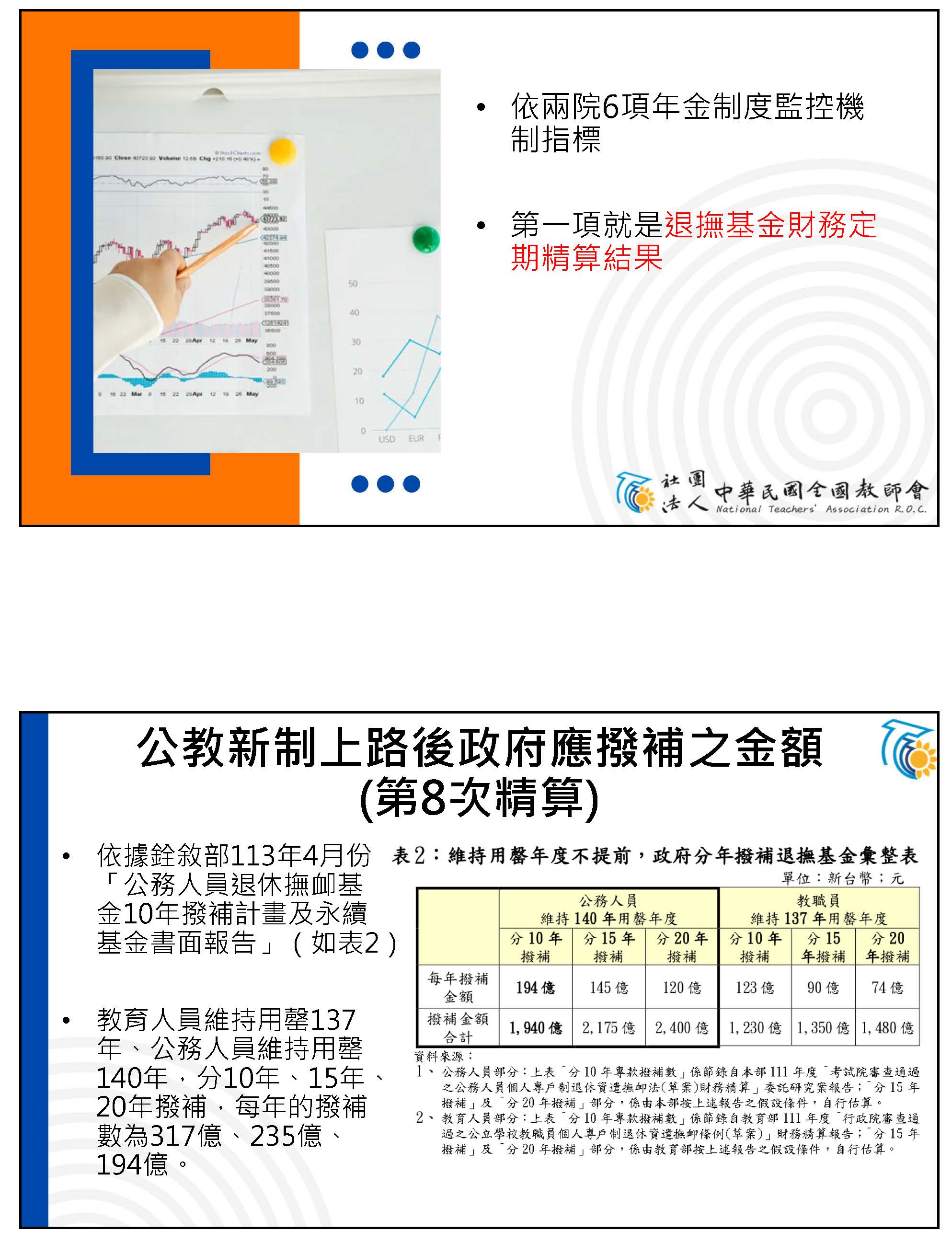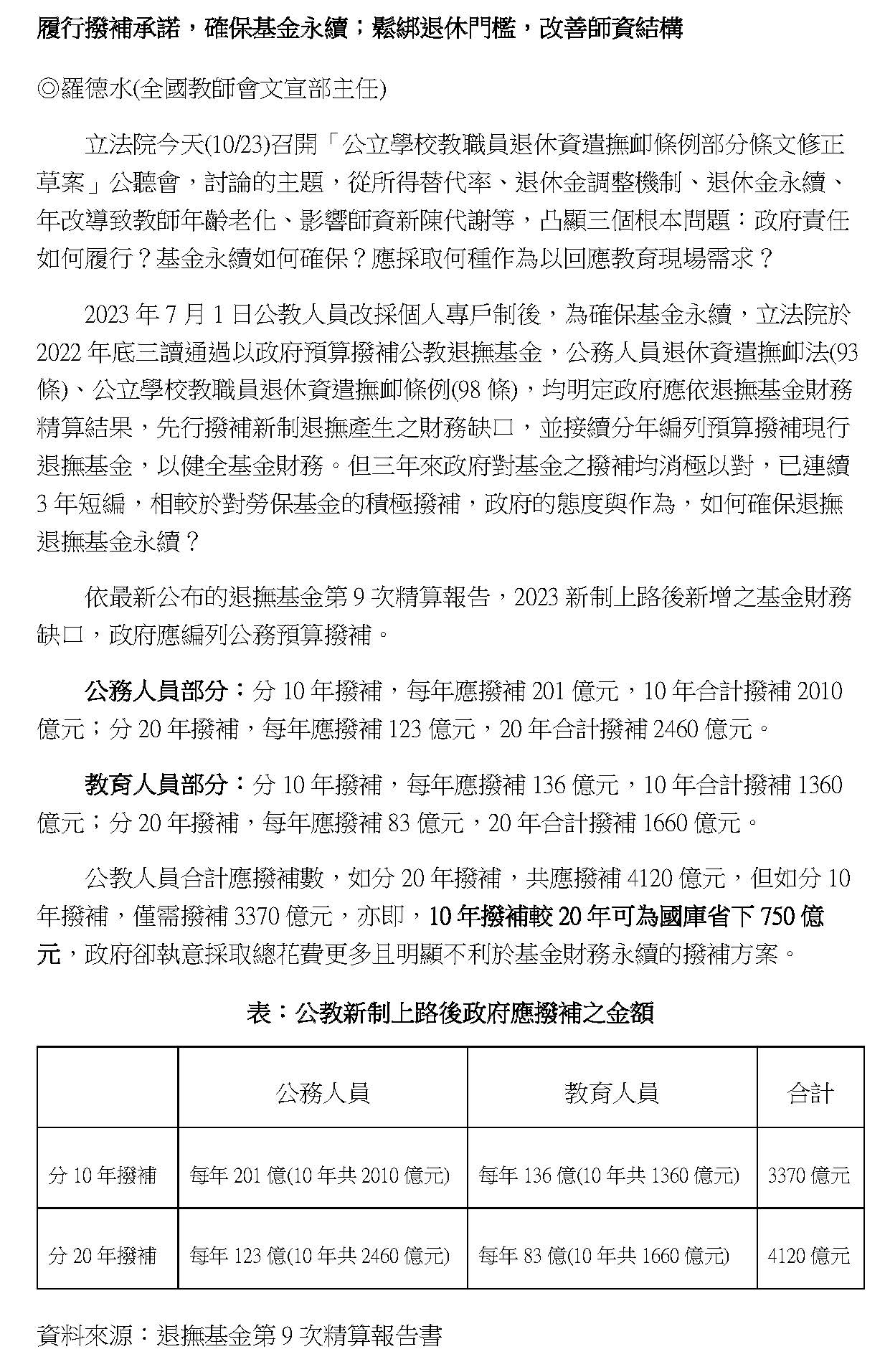 不過政府又搞出了另立新基金的洞,所以我們也希望初期能夠先像張智倫委員幫我們提案的:增訂中央政府每年應編列不低於各級政府所節省退撫經費之2倍數額挹注退撫基金。也就是說,以我們每年被砍的四百多億來挹注退撫基金;相對的,我們是繳35%、政府提繳65%,相當於我們的2倍,所以相對撥補我們挹注金額的2倍也是合理的事情。而且現在不逐年撥補、分期撥補三百多億的話,等到破產以後再來撥補,就要撥補八百多億,我之前算過,公務人員跟教師如果現在就開始撥補的話,可以幫國家省各1兆,總共可以省2兆,所以越早撥補越省錢!